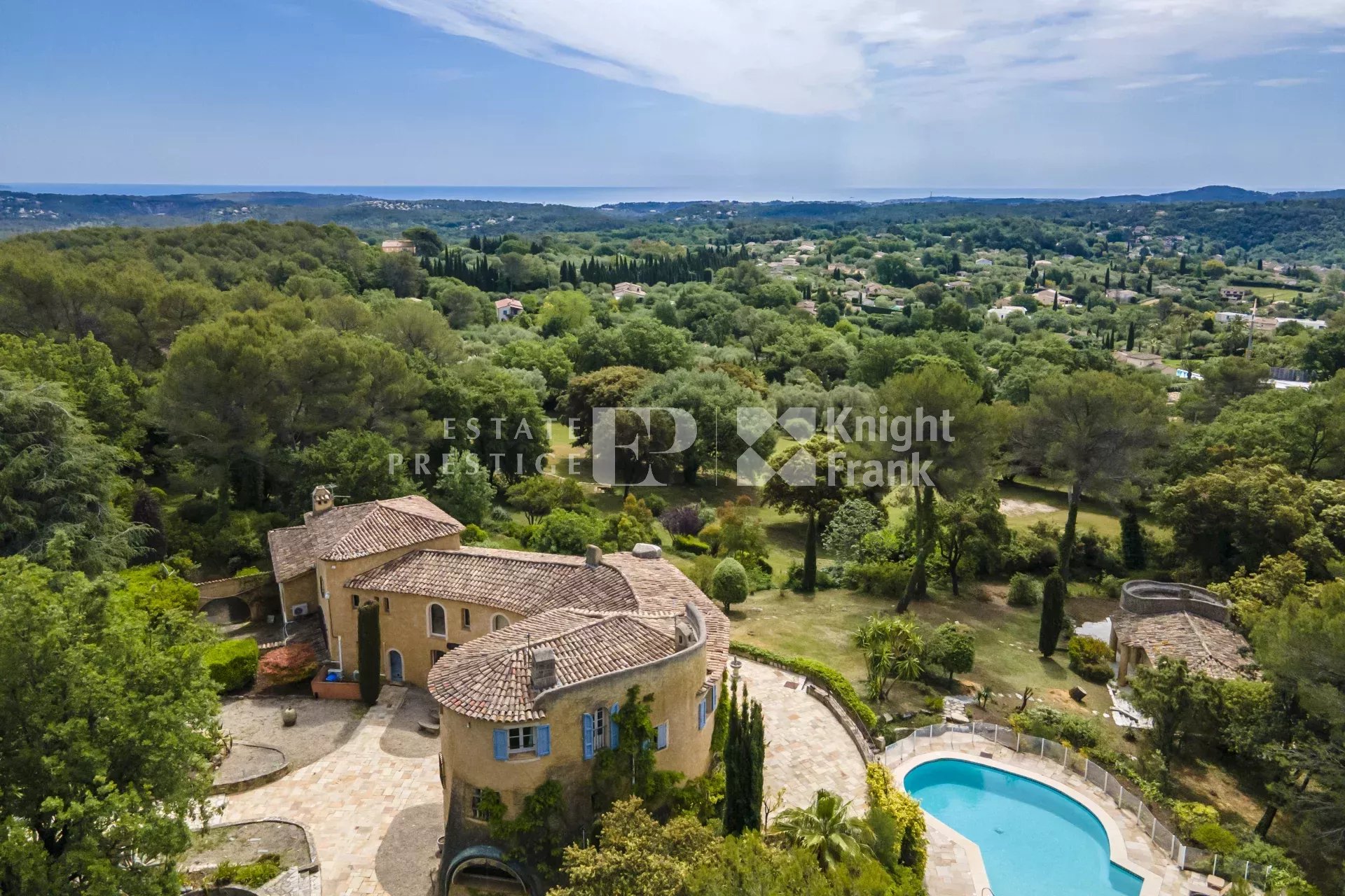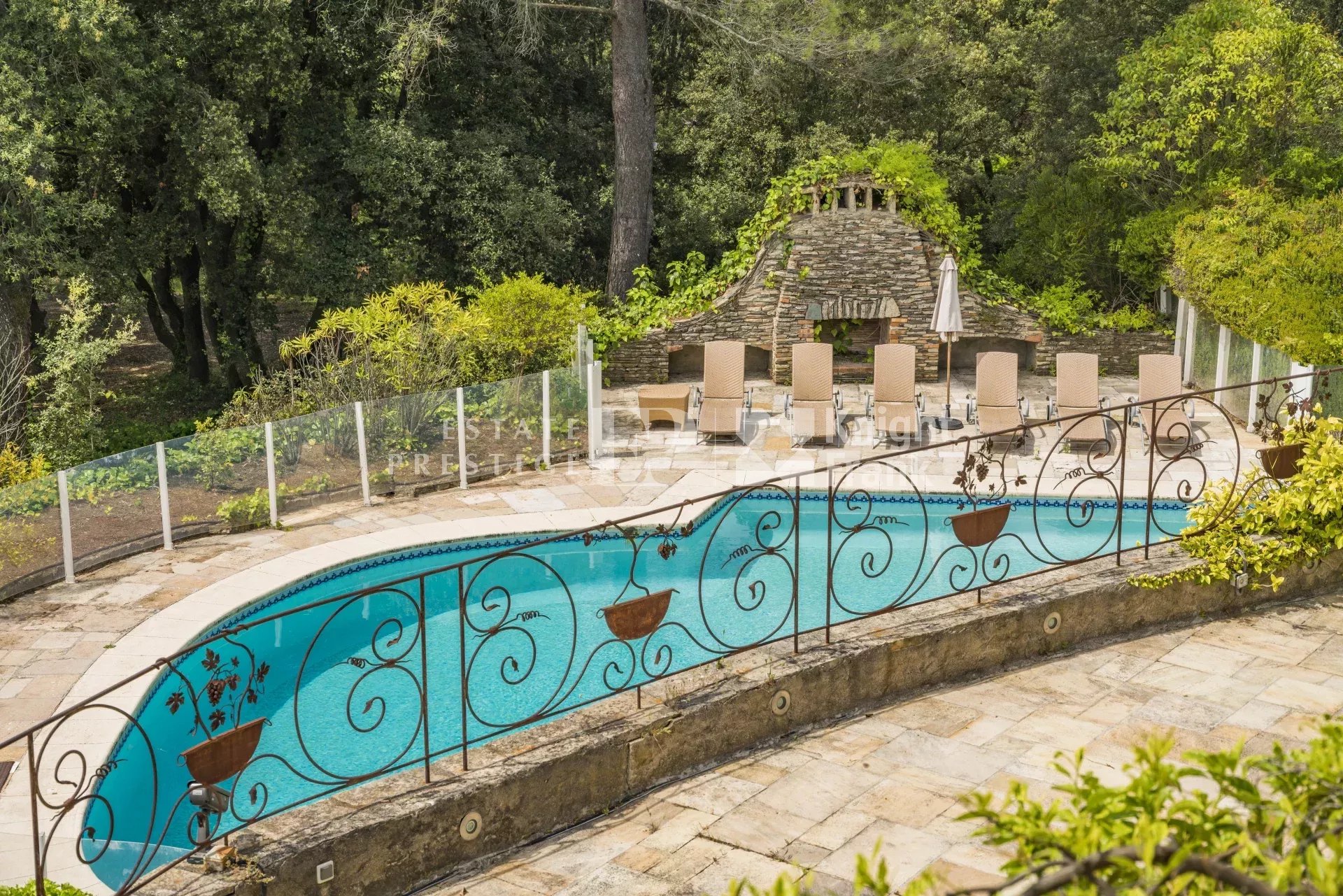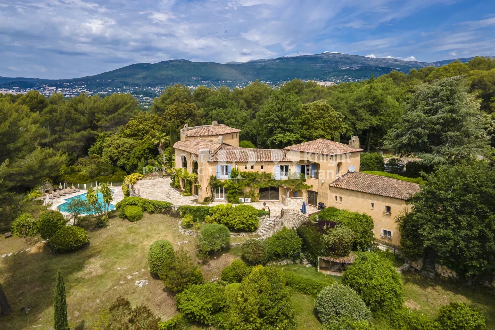 An exceptional private domain with approx 49000 m² of land and forest. The estate consists of a main residence of circa 680m2 with 6 bedroom suites, a large entrance hall with lift, kitchen, dining room, living room, TV room, mezzanine, cinema room, gym, laundry room, storage and wine cellar. A guest house of around 80m² with 2 bedroom suites and a living room with a fireplace. Large terraces with beautiful sea and countryside views. Pool, pool-house and summer kitchen. Caretaker house of app. 130m². Olive and fruit trees as well as a 3 hole golf course. Walking distance to the village of Valbonne.