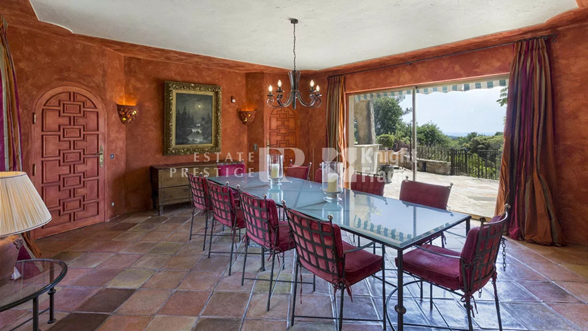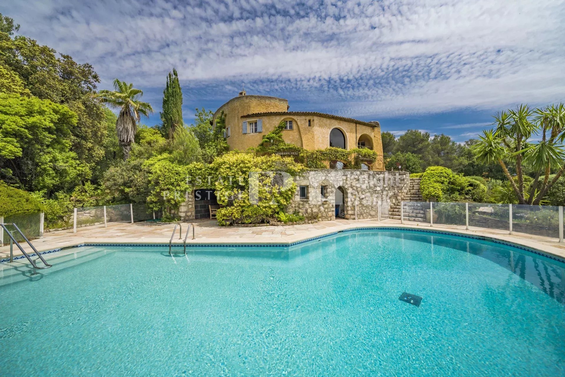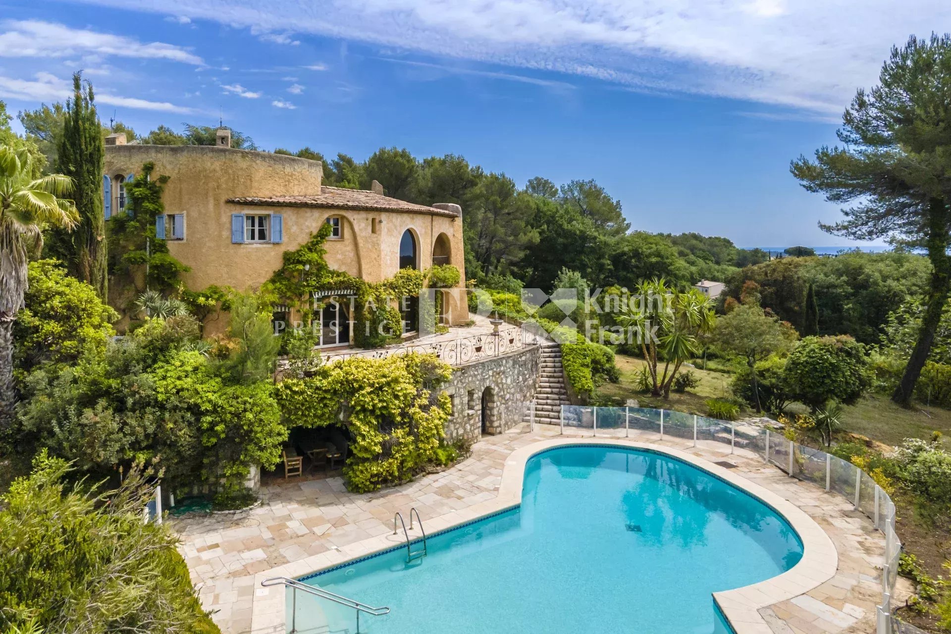 An exceptional private domain with approx 49000 m² of land and forest. The estate consists of a main residence of circa 680m2 with 6 bedroom suites, a large entrance hall with lift, kitchen, dining room, living room, TV room, mezzanine, cinema room, gym, laundry room, storage and wine cellar. A guest house of around 80m² with 2 bedroom suites and a living room with a fireplace. Large terraces with beautiful sea and countryside views. Pool, pool-house and summer kitchen. Caretaker house of app. 130m². Olive and fruit trees as well as a 3 hole golf course. Walking distance to the village of Valbonne.
