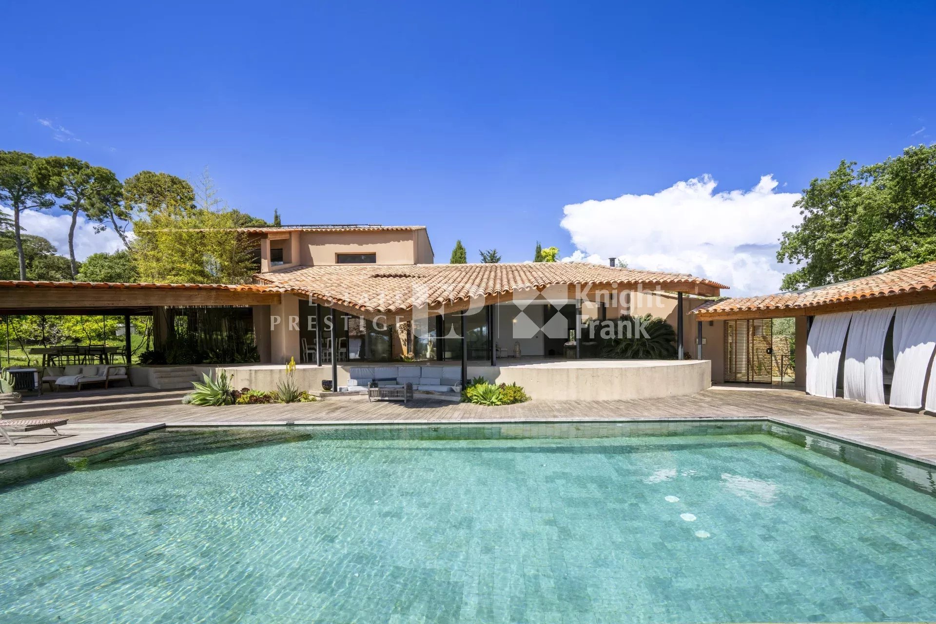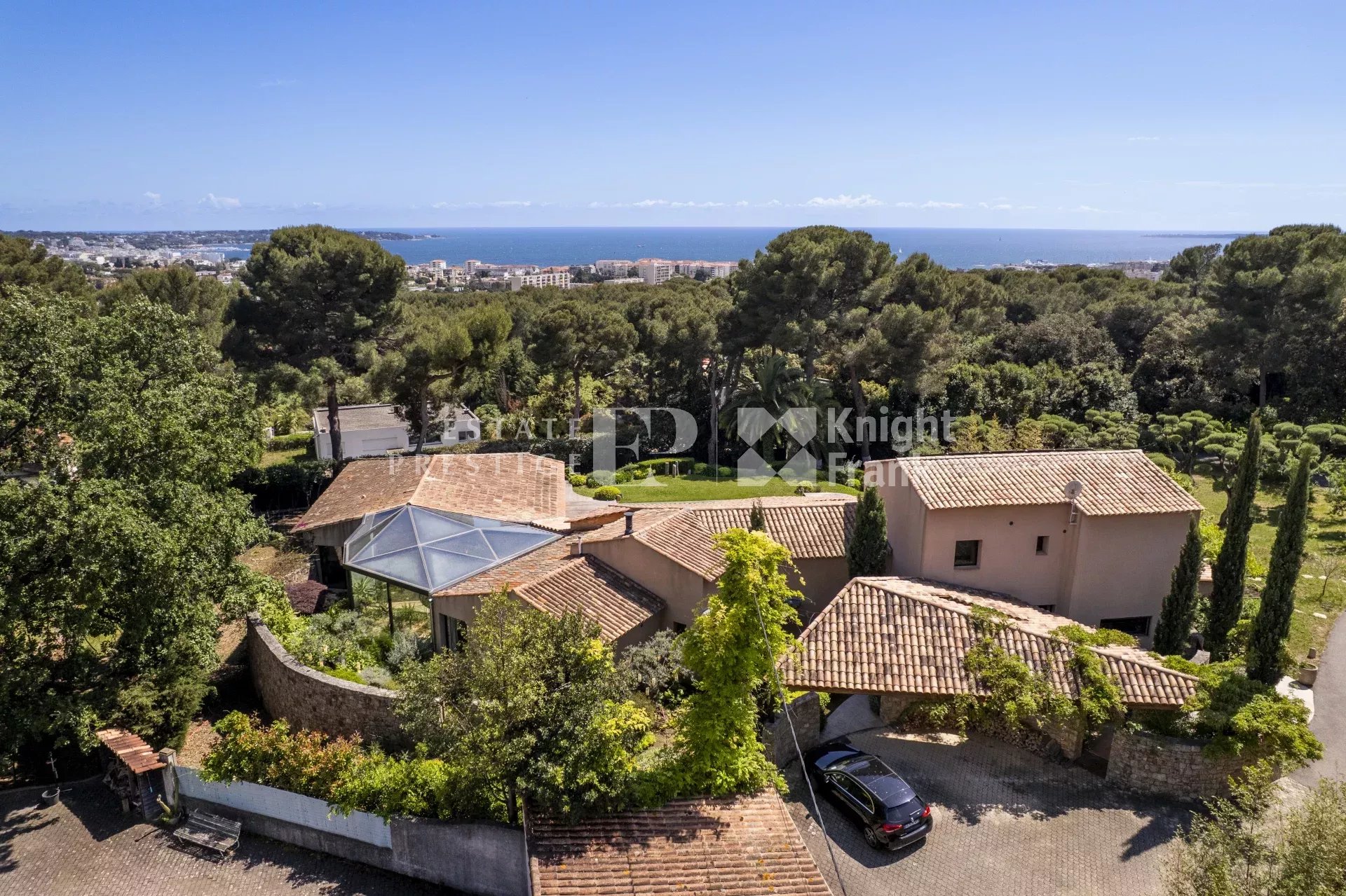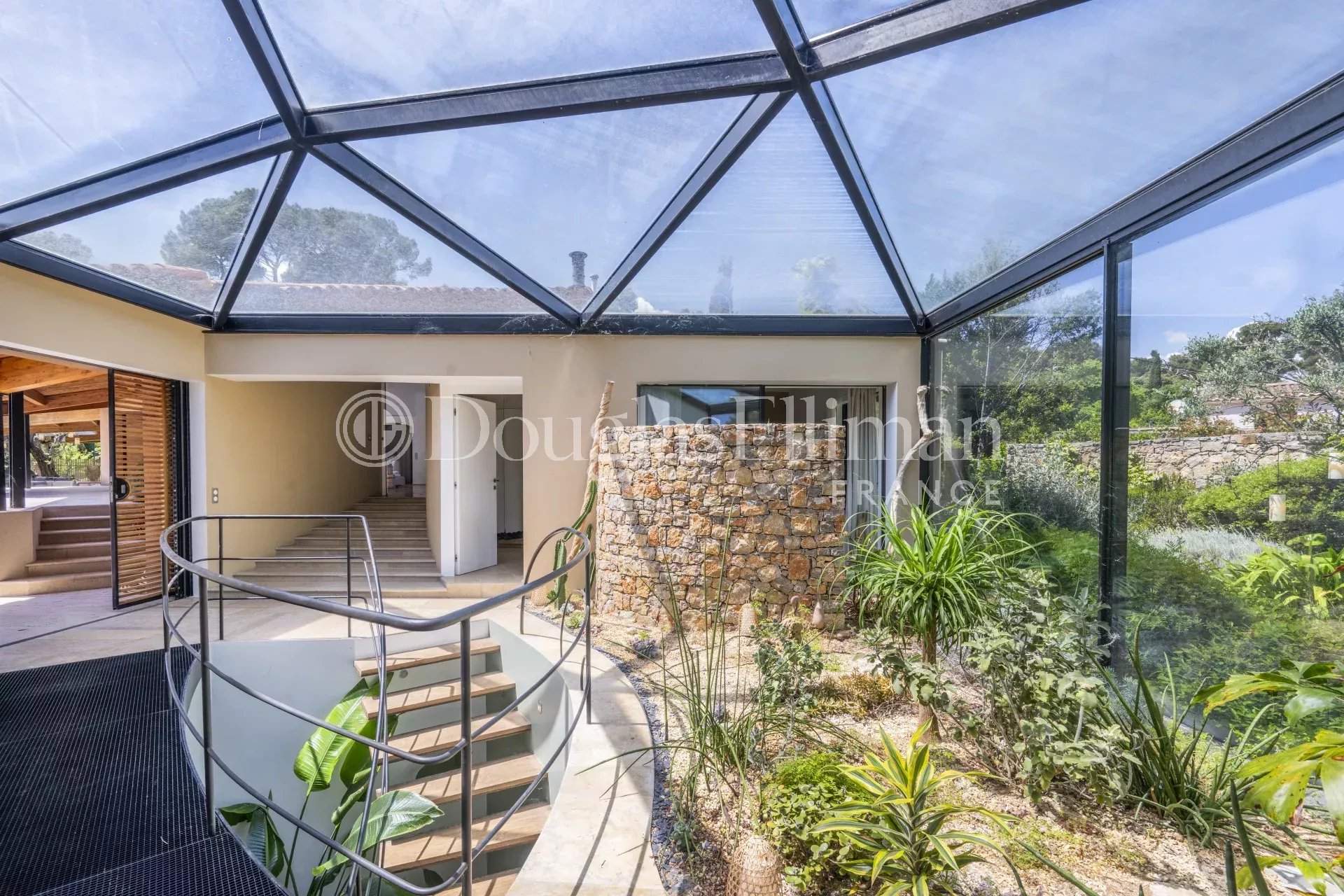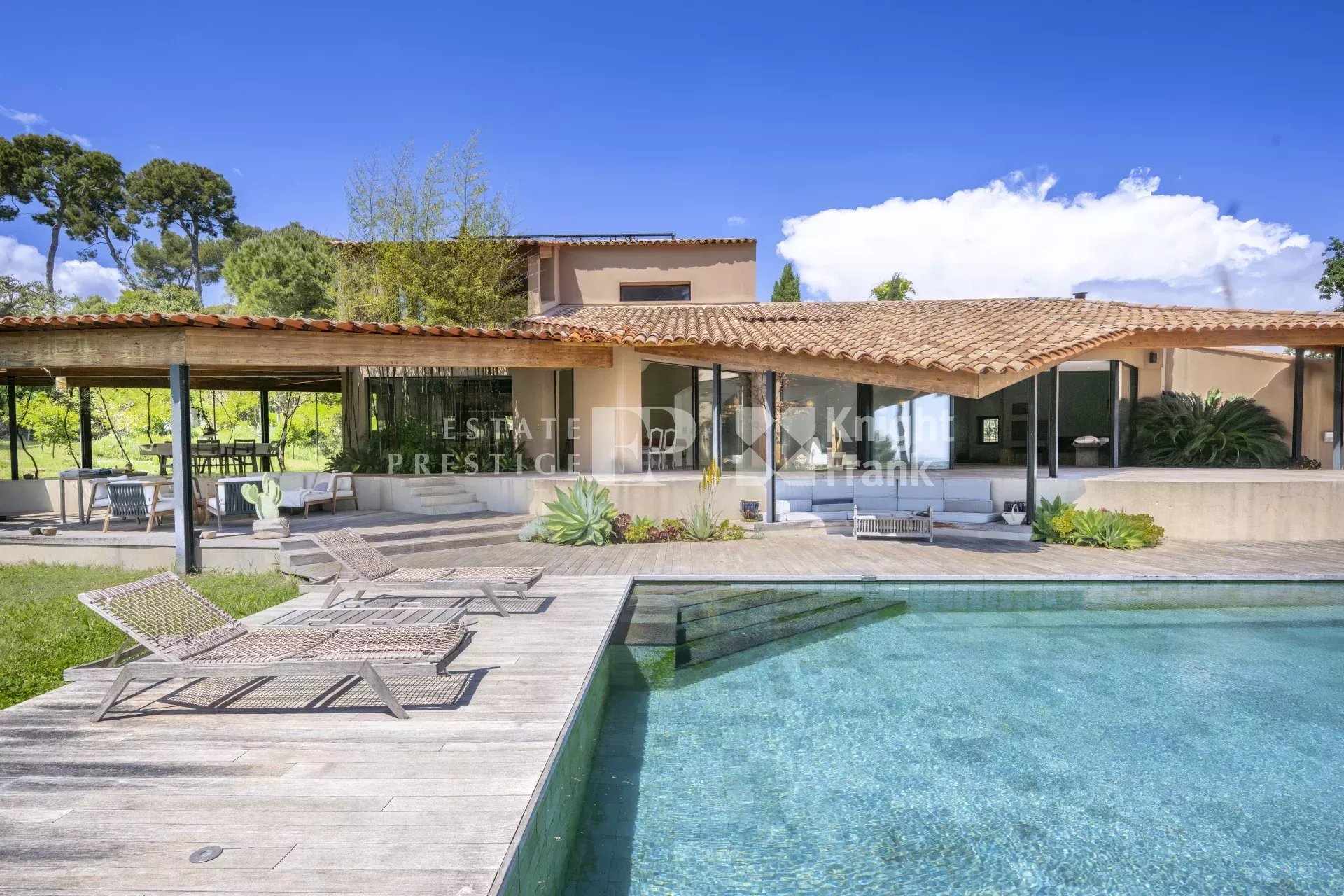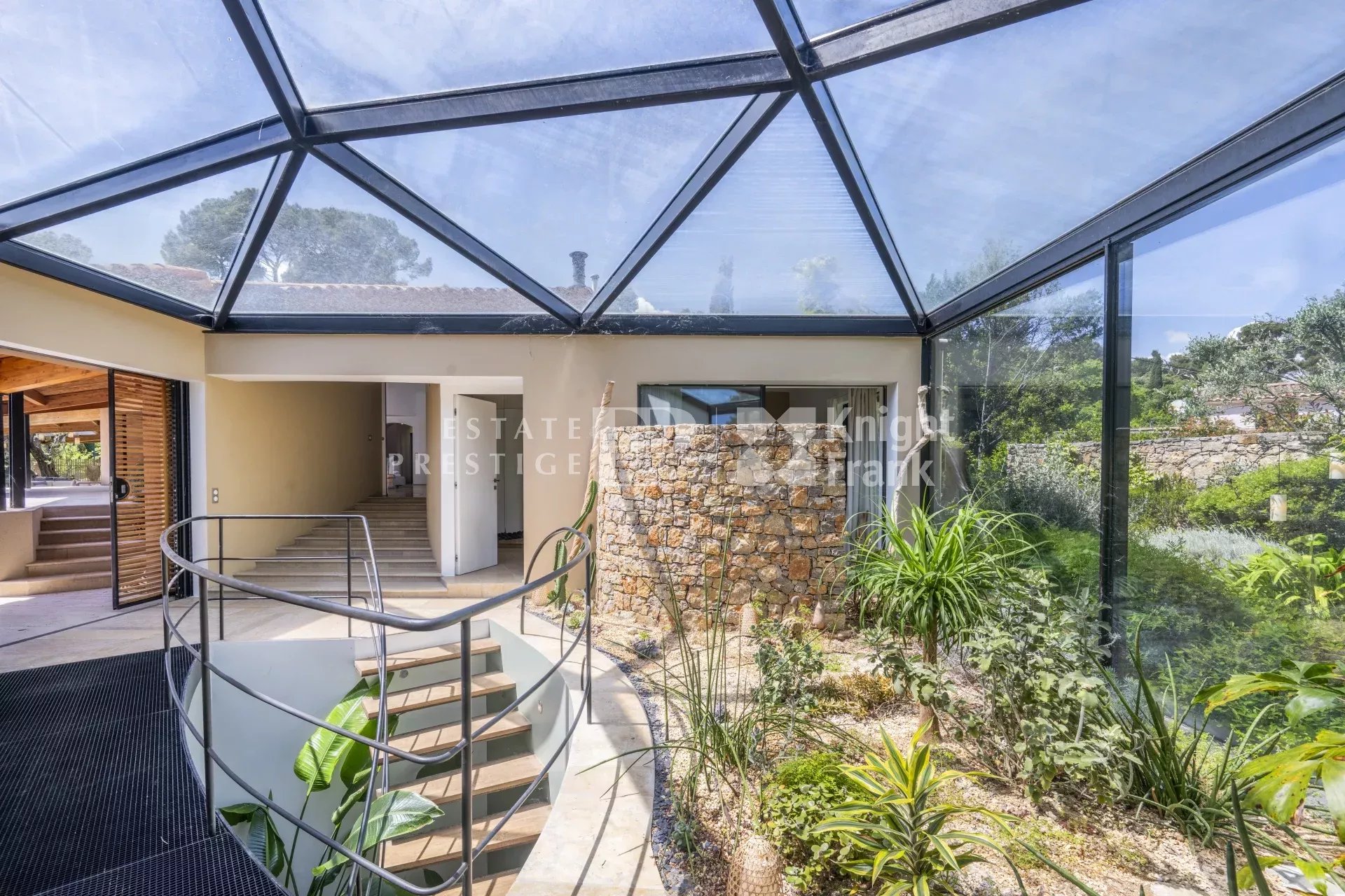Situated in a confidential residential area of Antibes, in a dominant position at the heart of a 4,400 m² landscaped garden with 1,400 plantations and 13 century-old olive trees, this property designed by architect Sauzet blends luxury and refinement.
