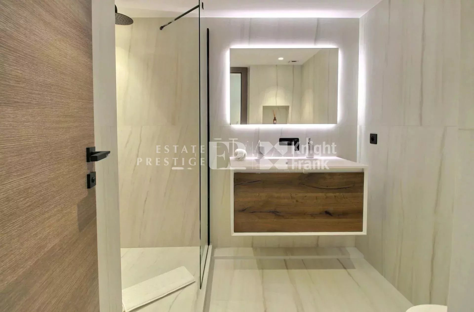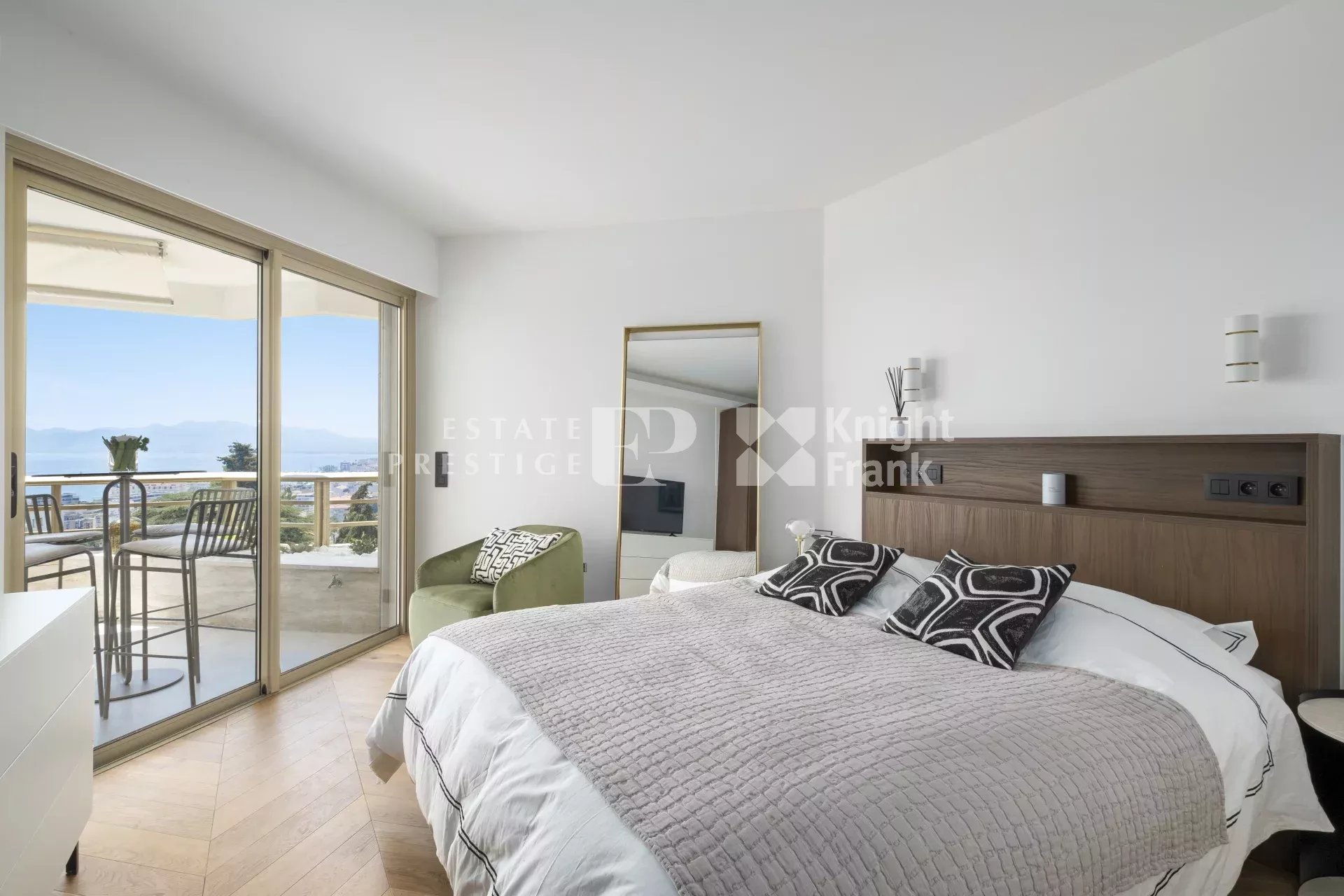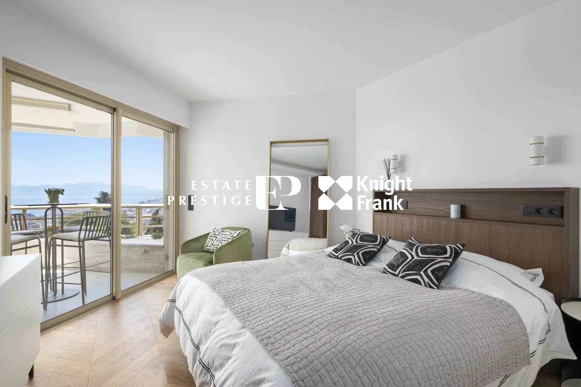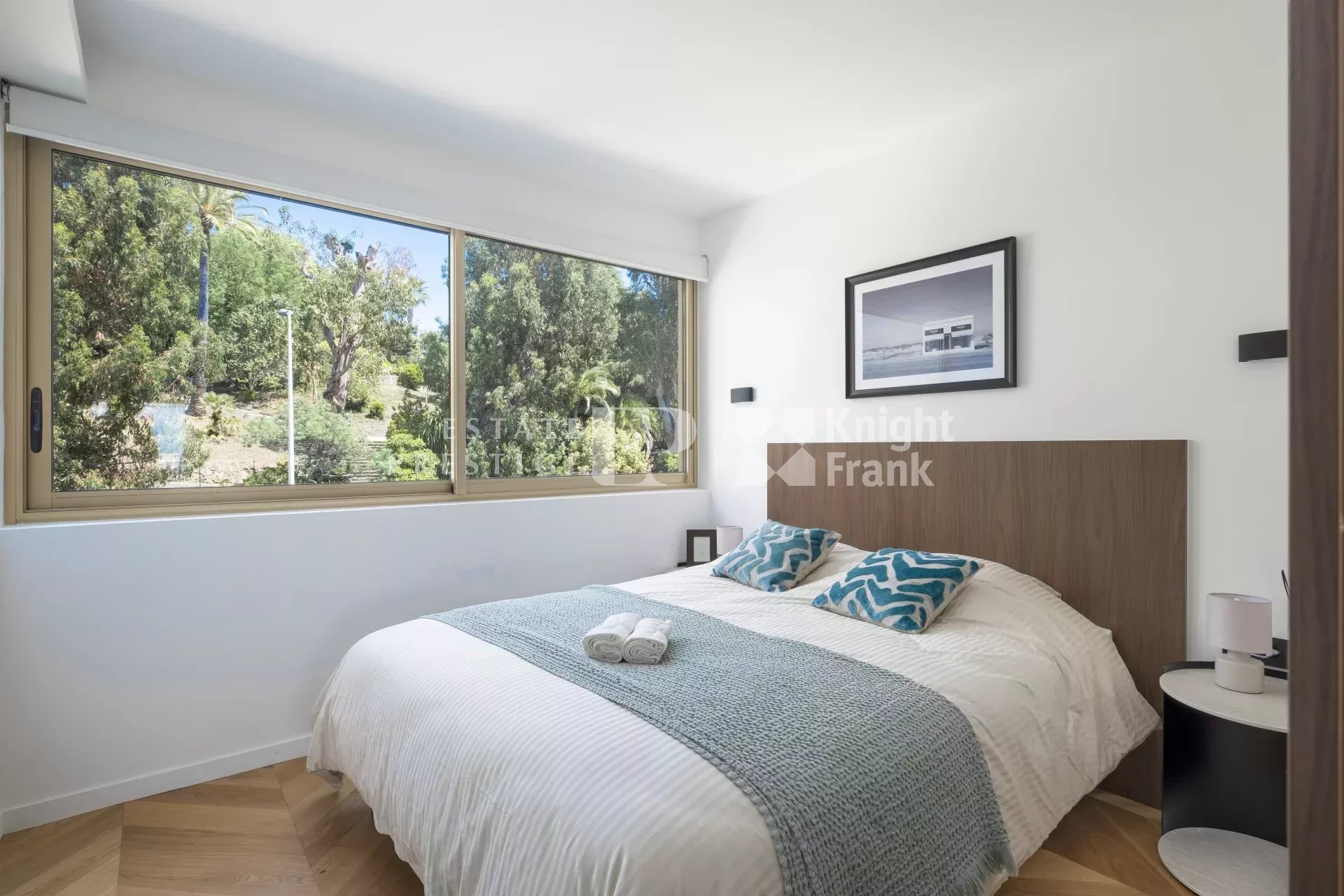 The south/west-facing flat boasts panoramic views over Cannes and the Lérins islands and comprises a large living room with open-plan kitchen, three en suite bedrooms and a 27 m2 terrace.