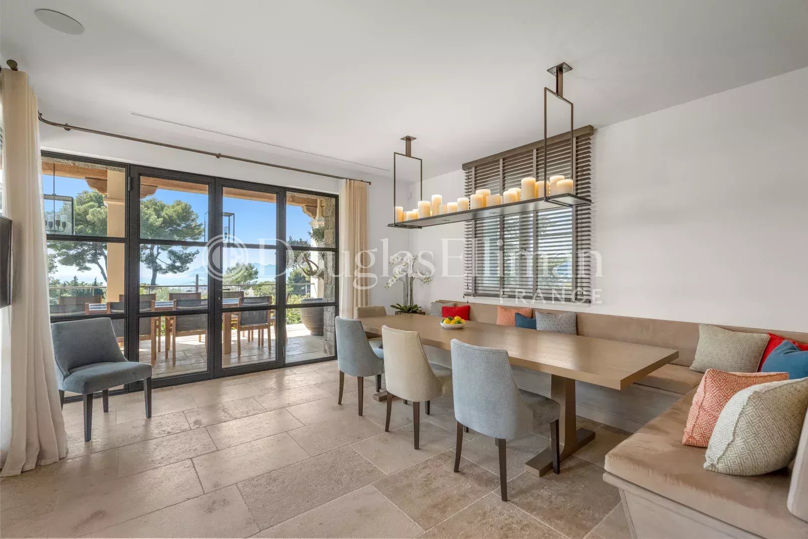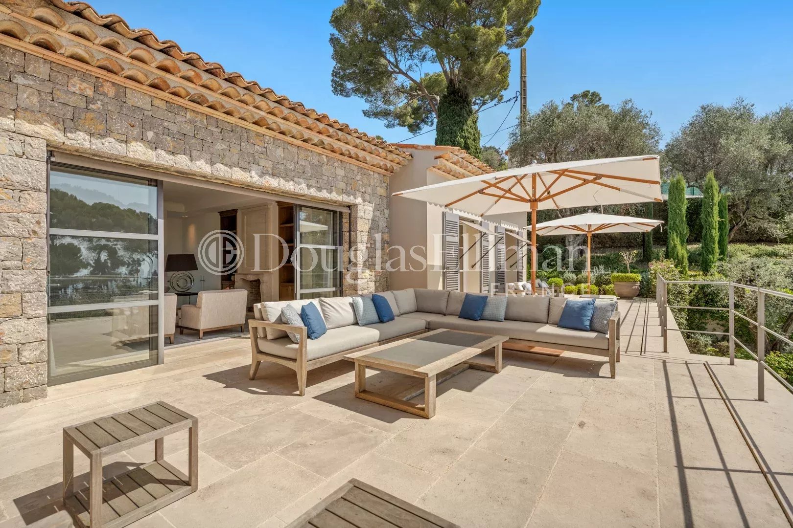 Designed and finished to the highest standards, the villa spans three levels. The entry level features expansive daytime living areas, offering breathtaking views of the Mediterranean framed by charming pine trees. This floor includes a spacious reception room, a library, a second living room, and an open-plan, fully equipped state-of-the-art kitchen with a dining area. All these spaces open out onto large terraces, ideal for outdoor dining and lounging.