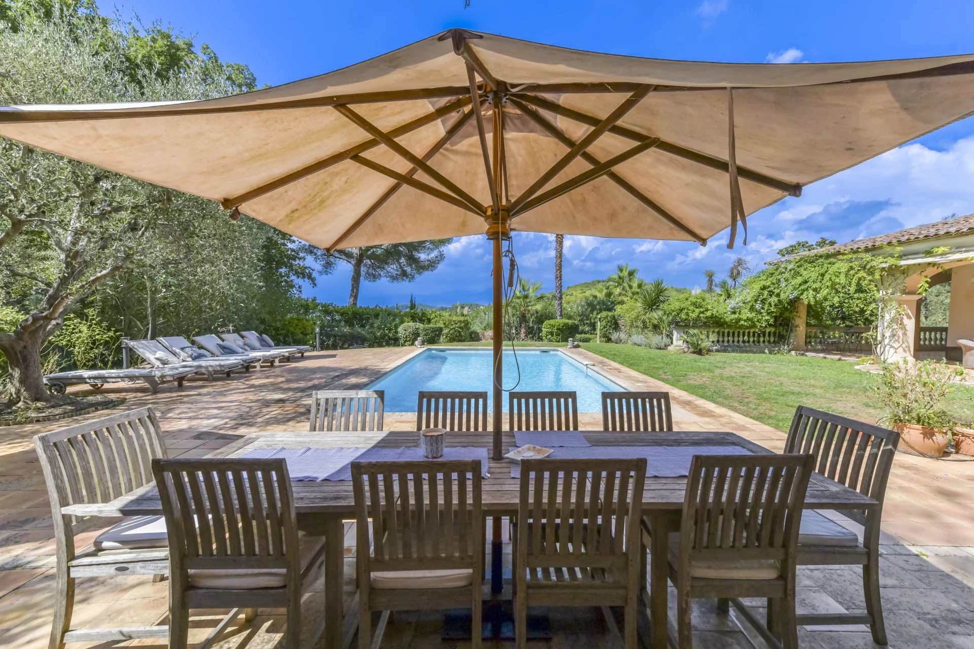 Upon entering, you'll be enchanted by the view of a lovely patio, followed by a spacious living room that opens onto a beautiful terrace and the pool area. The sun-filled master suite, with dressing room and bathroom, has direct access to the garden.