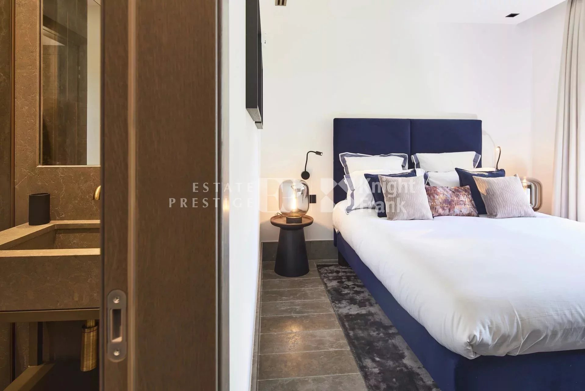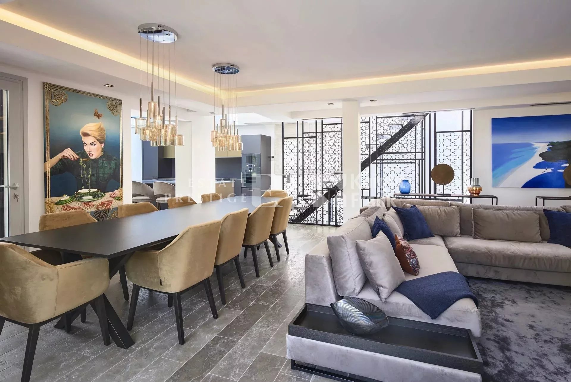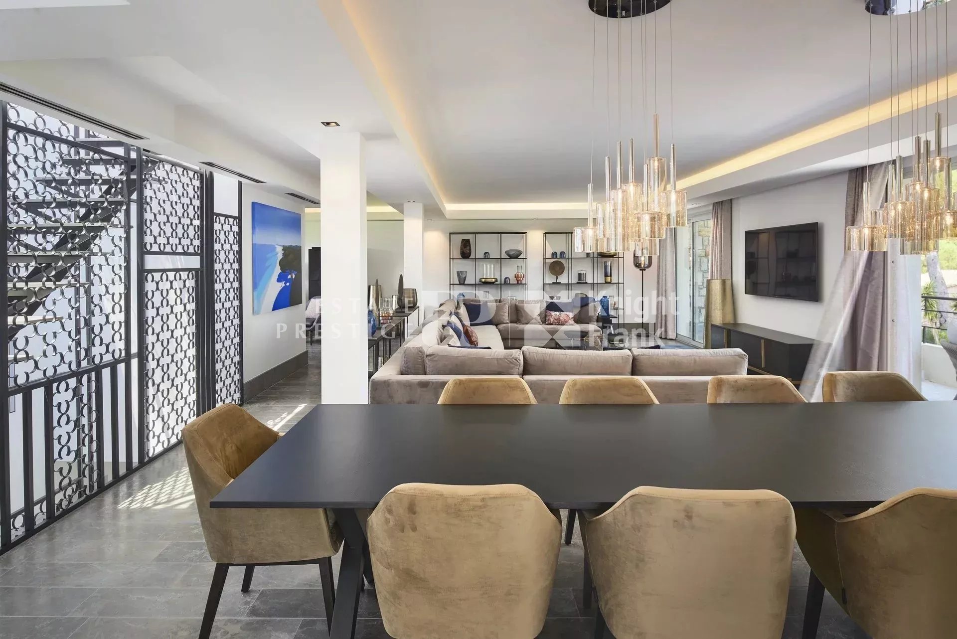 With an area of about 220 m2 on two levels comprising five bedrooms with en suite bathrooms on the ground floor, then on the first floor a magnificent living room of about 95 m2 with dining room opening on a large terrace of 59 m2 with barbecue offering a beautiful view of the pine trees and the sea, open kitchen fully equipped "high-end" with central plan. Solarium terrace with swimming pool and relaxation area complete this marvel. Villa sold turnkey with its furniture.