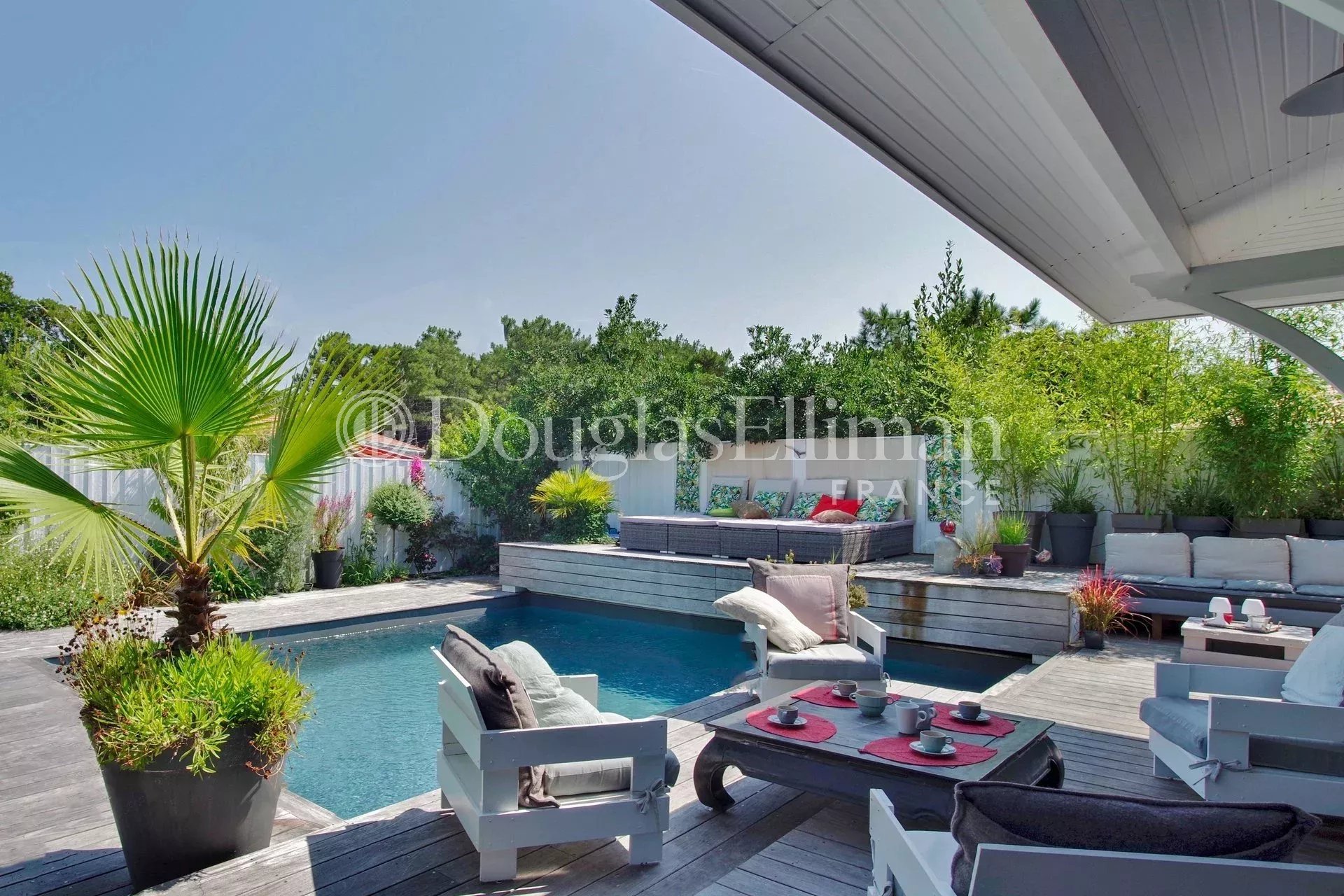 Outside, the property features a stunning swimming pool surrounded by lush greenery, providing an idyllic retreat. The expansive deck area offers ample space for relaxation and entertaining guests. This exceptional home in Lège-Cap-Ferret provides the perfect setting for enjoying a luxurious lifestyle.