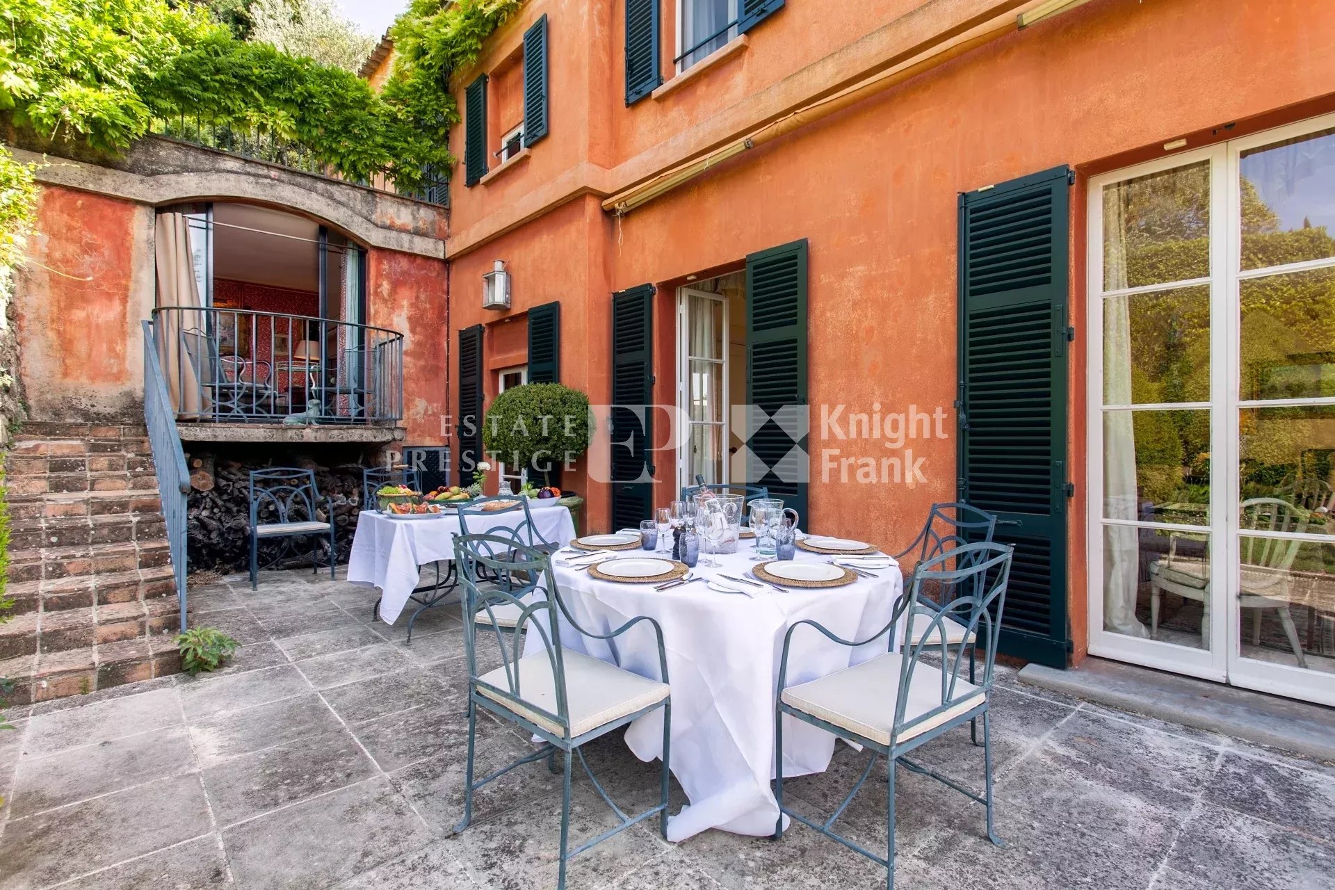 an elegant drawing room with high ceilings overflowing onto a sprawling and so charming main Southfacing terrace, a second, cosy sitting room, a new, completely refurbished kitchen, an elegant, separate dining room (seating fourteen), two elegant suites, each with an antechamber and a bathroom en-suite, a