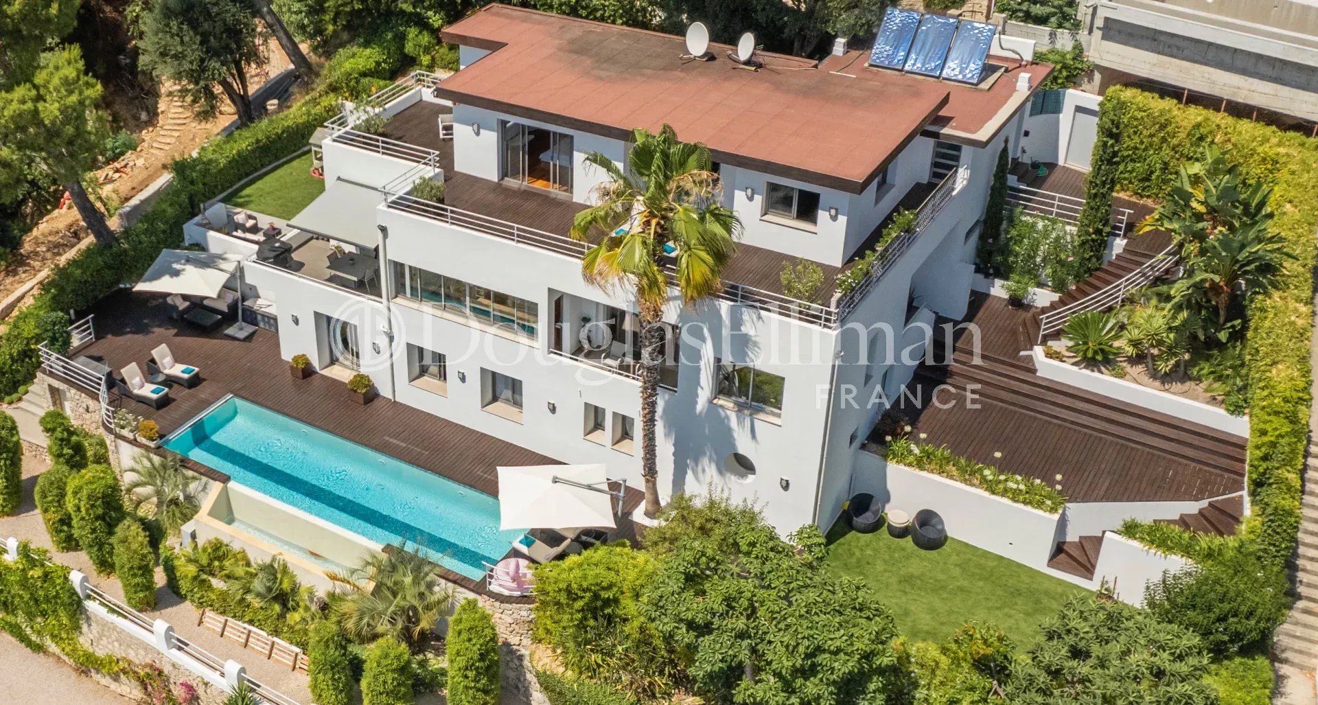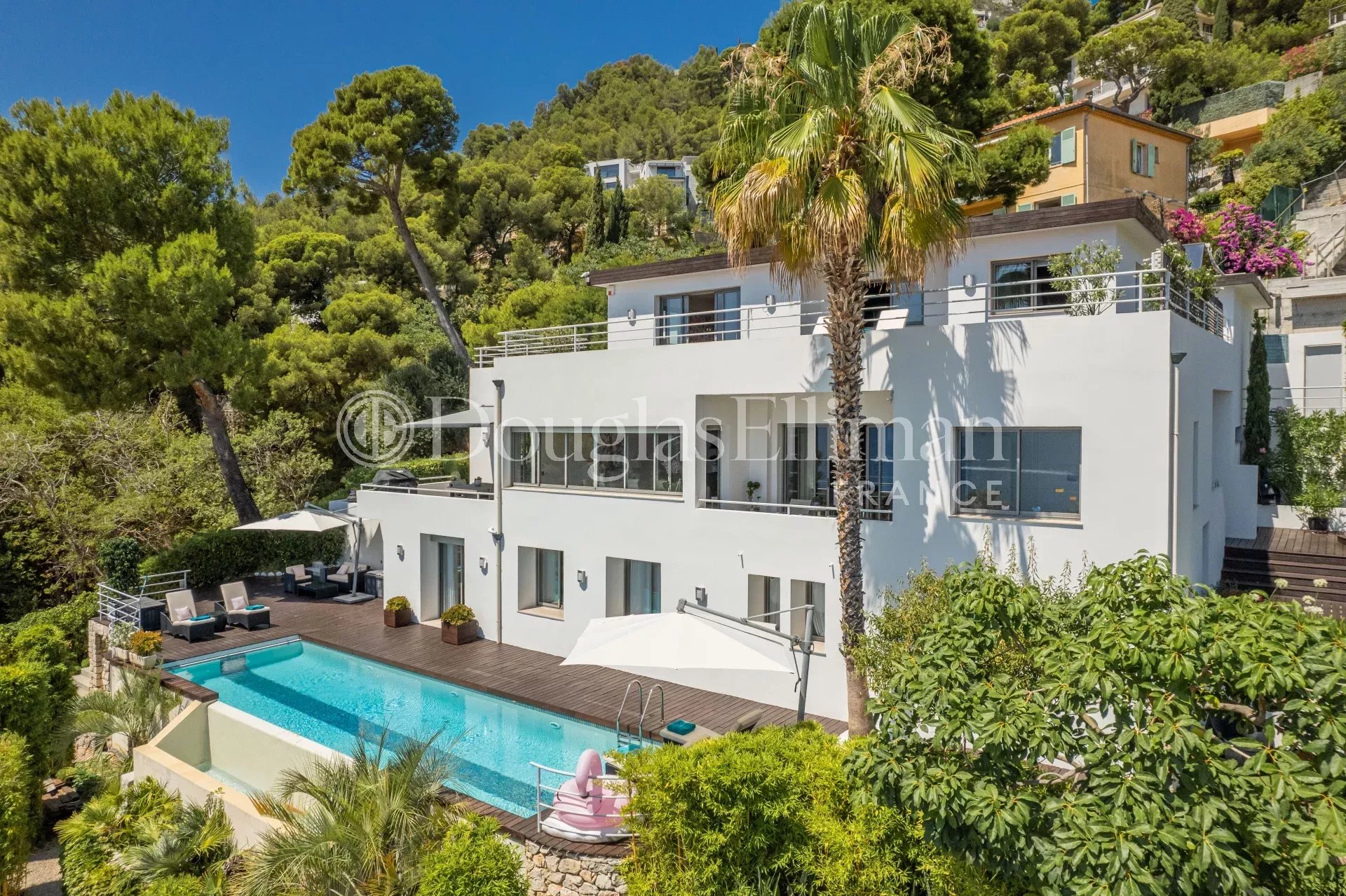 Many terraces and wooded areas adorn the house at all levels. Guest parking, double garage, laundry room and pantry complete this property in excellent condition.