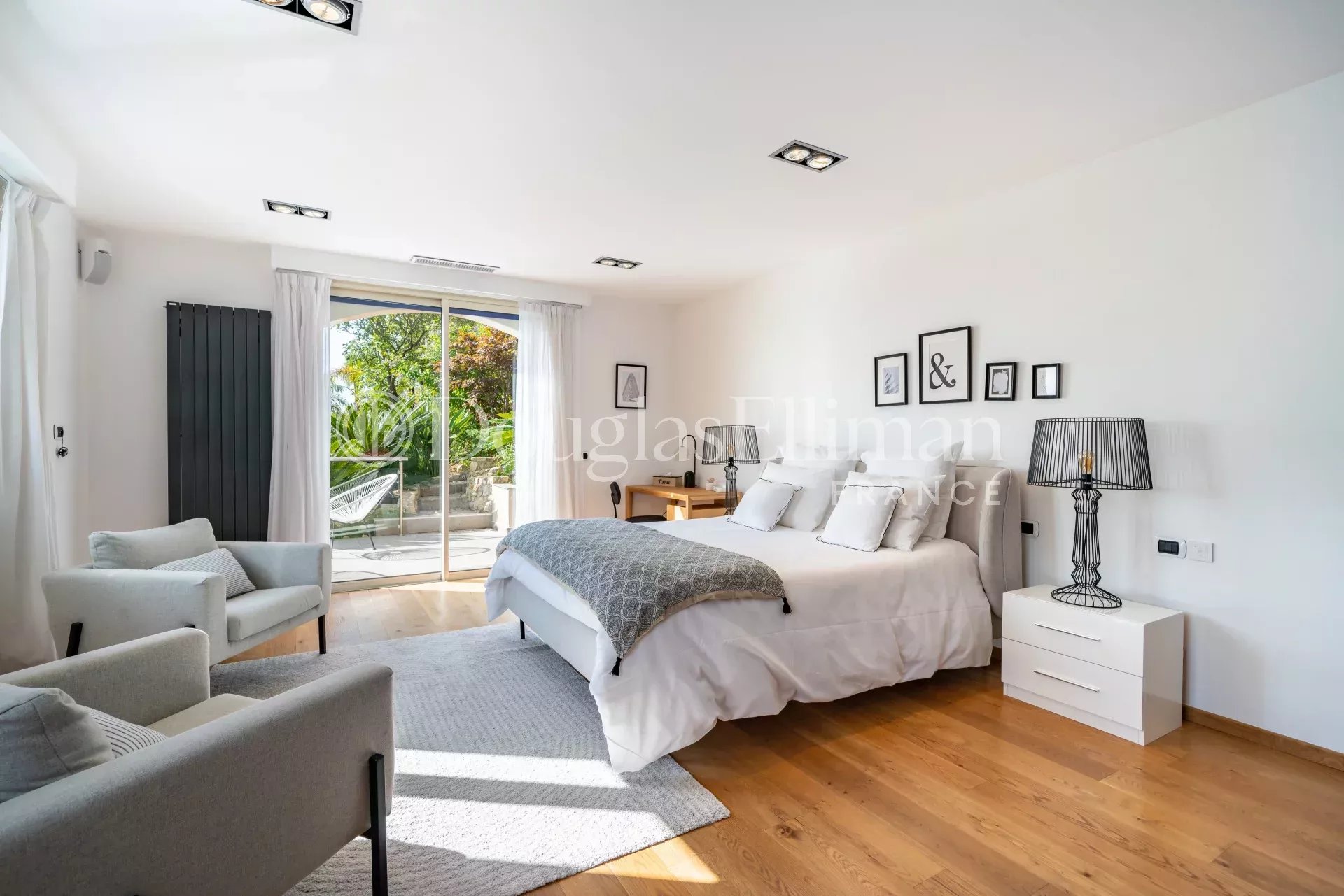 The main level includes a large reception room of approximately 100m2 with large bay windows opening onto the terrace, the swimming pool and the sea view. It includes a spacious living room, a dining room and a fully equipped modern kitchen. On this level you will also find a bedroom with adjoining bathroom and dressing room.