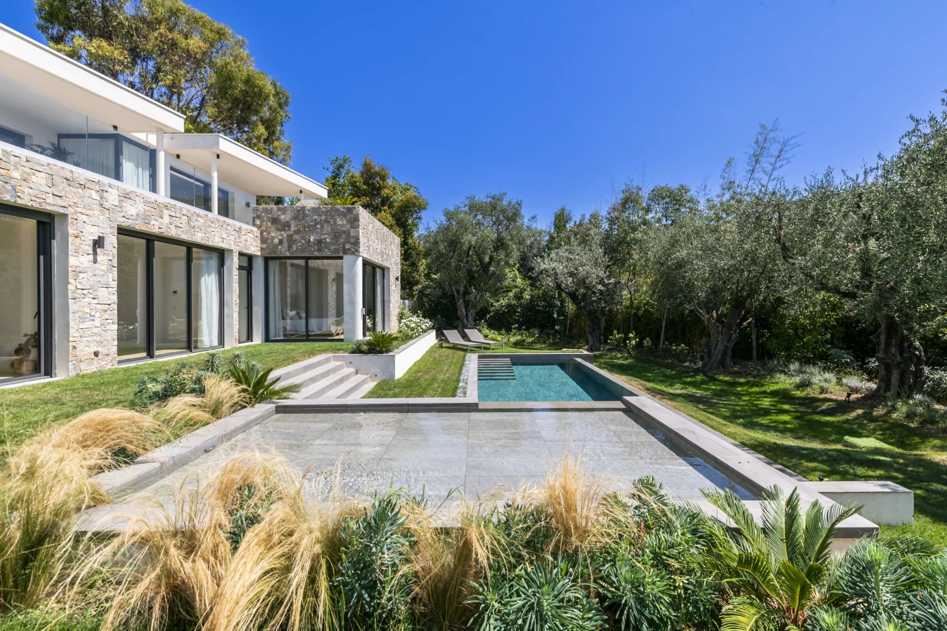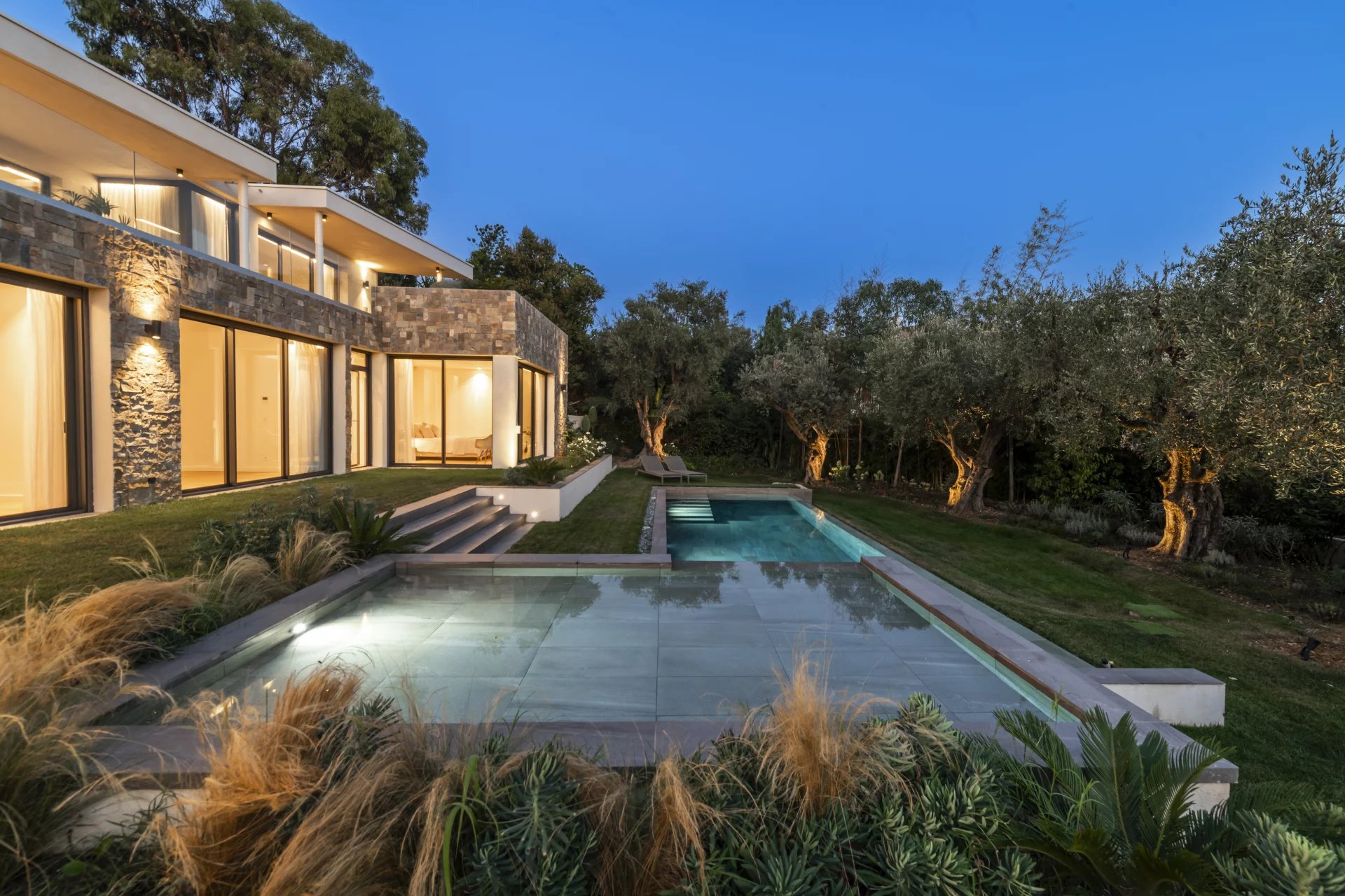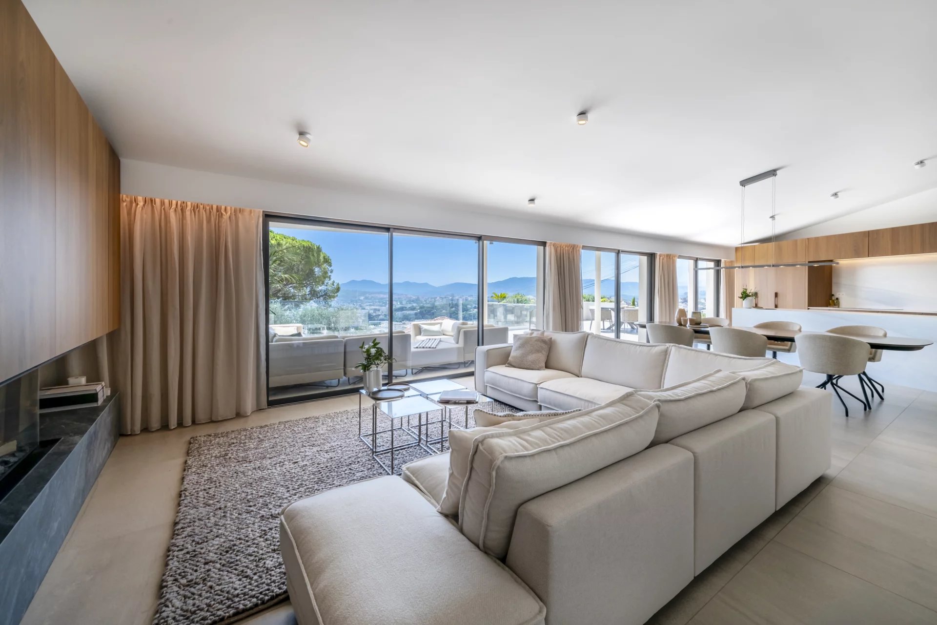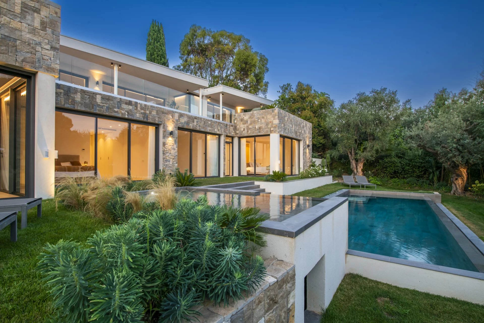 In absolute peace and quiet, nestling in the heart of a wooded garden of almost 1,300sqm with a saltwater swimming pool, this magnificent, fully-secured villa of around 400sqm, designed by a renowned architect, enjoys a magnificent panoramic view of the Estérel massif and a lovely glimpse of the sea.