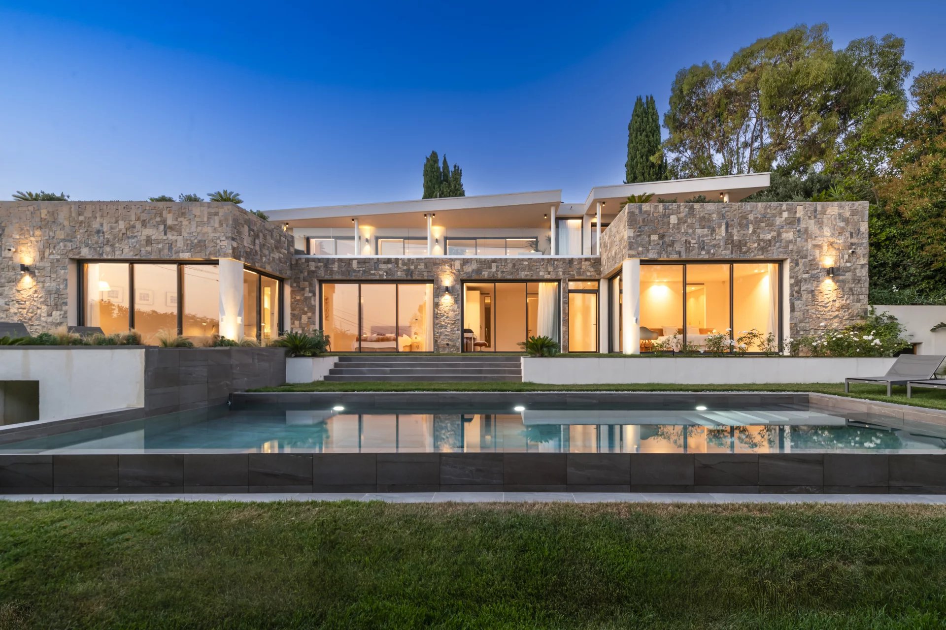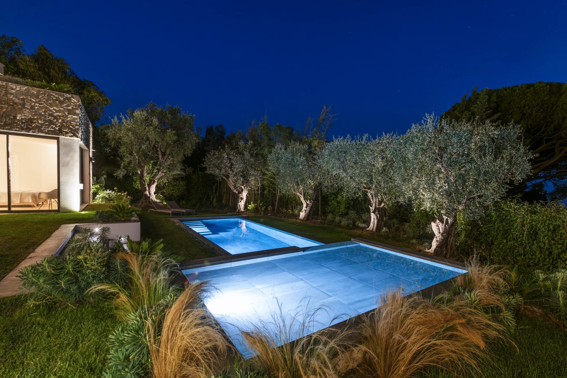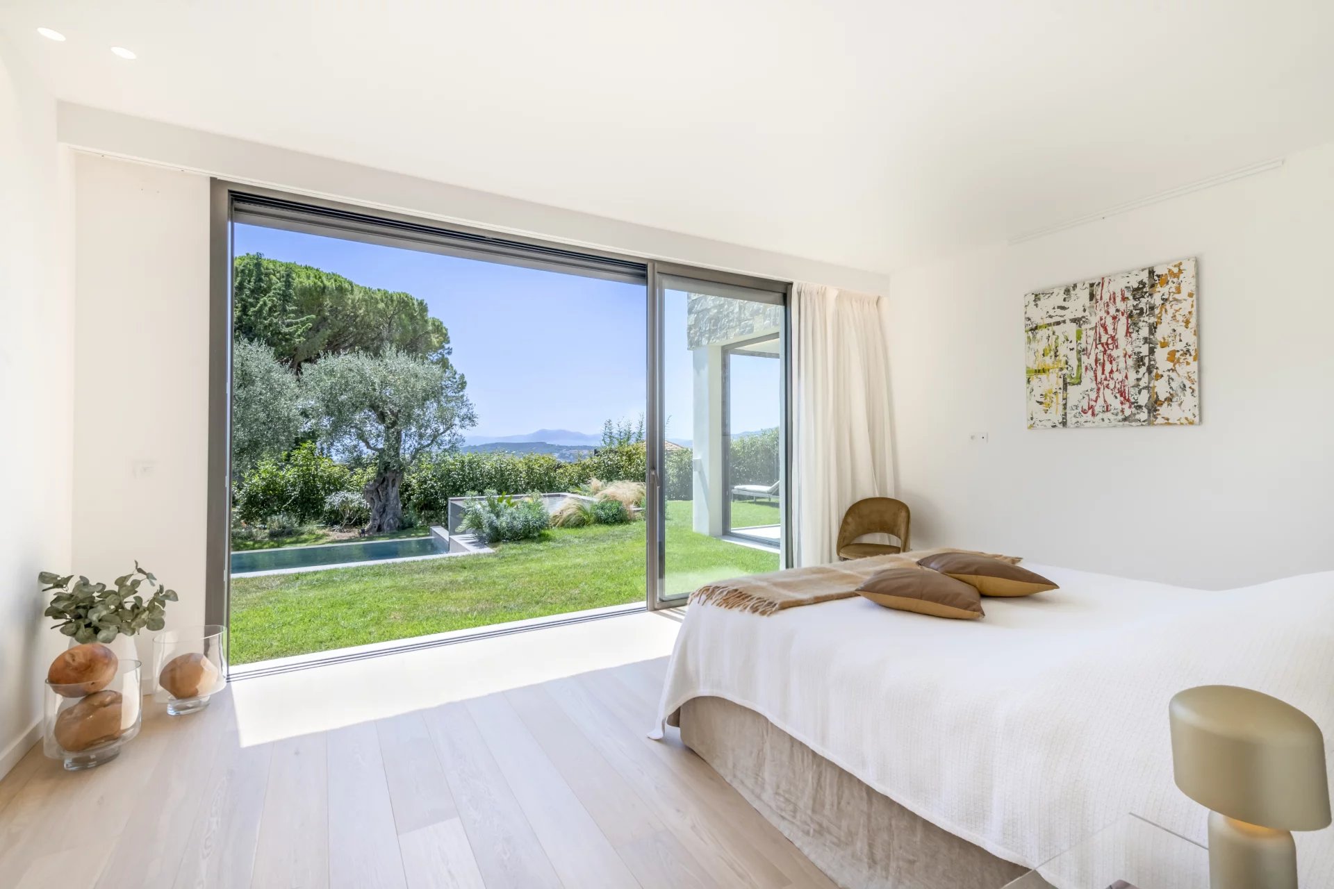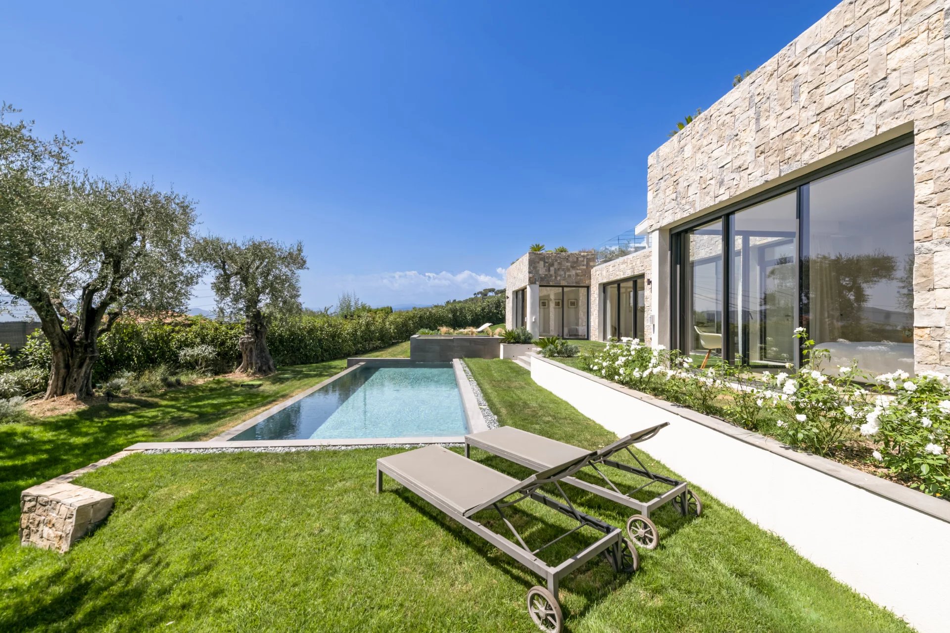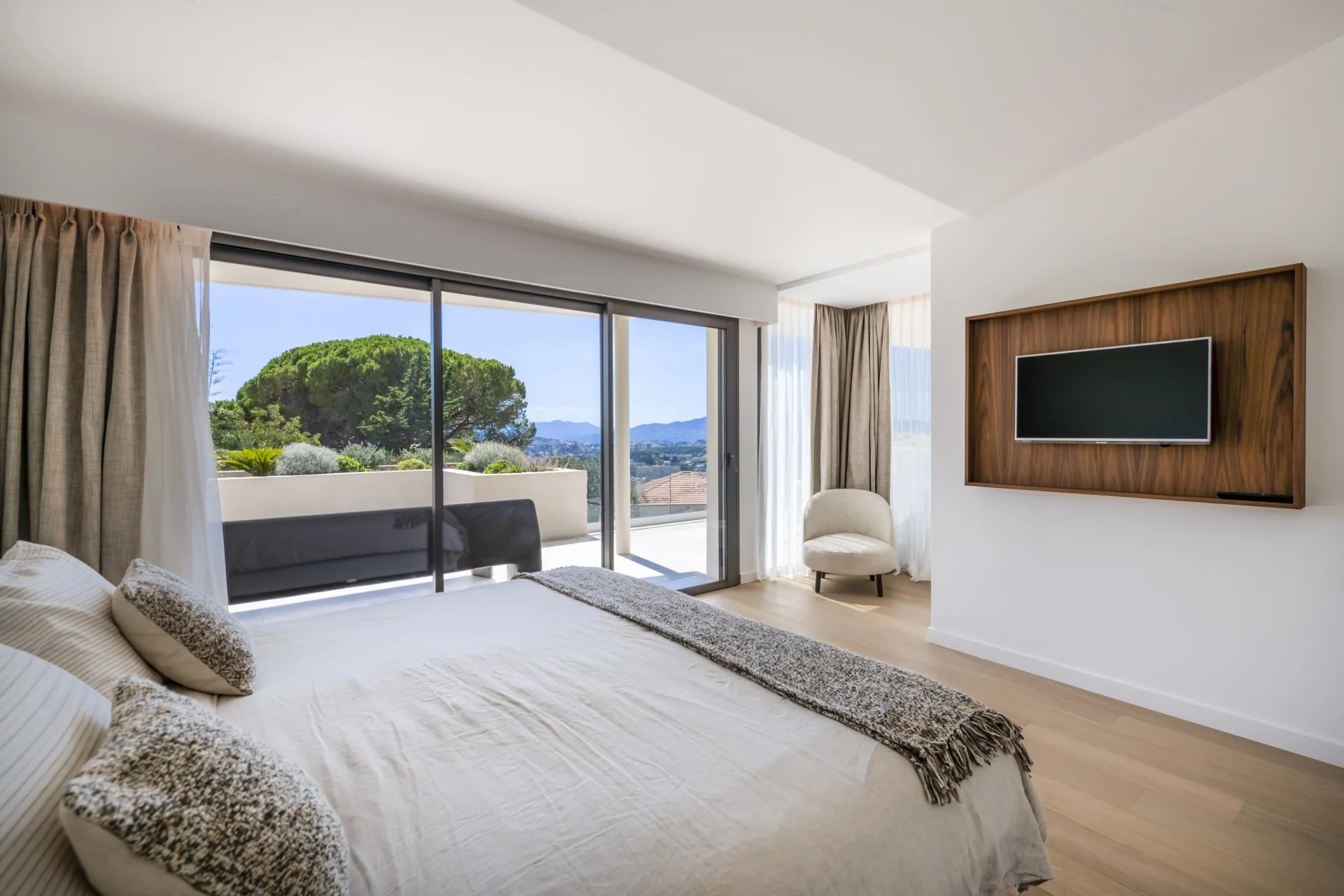 In absolute peace and quiet, nestling in the heart of a wooded garden of almost 1,300sqm with a saltwater swimming pool, this magnificent, fully-secured villa of around 400sqm, designed by a renowned architect, enjoys a magnificent panoramic view of the Estérel massif and a lovely glimpse of the sea.