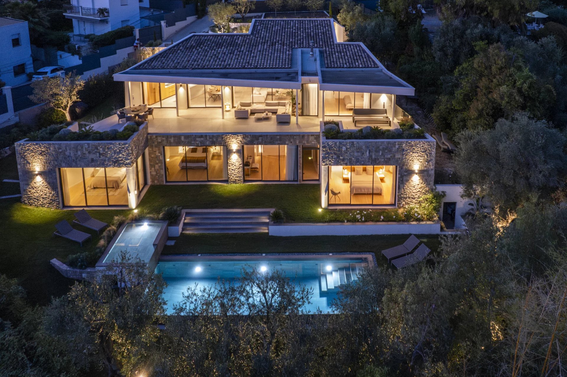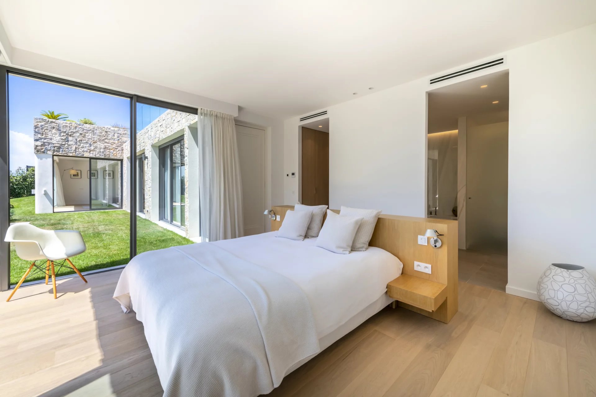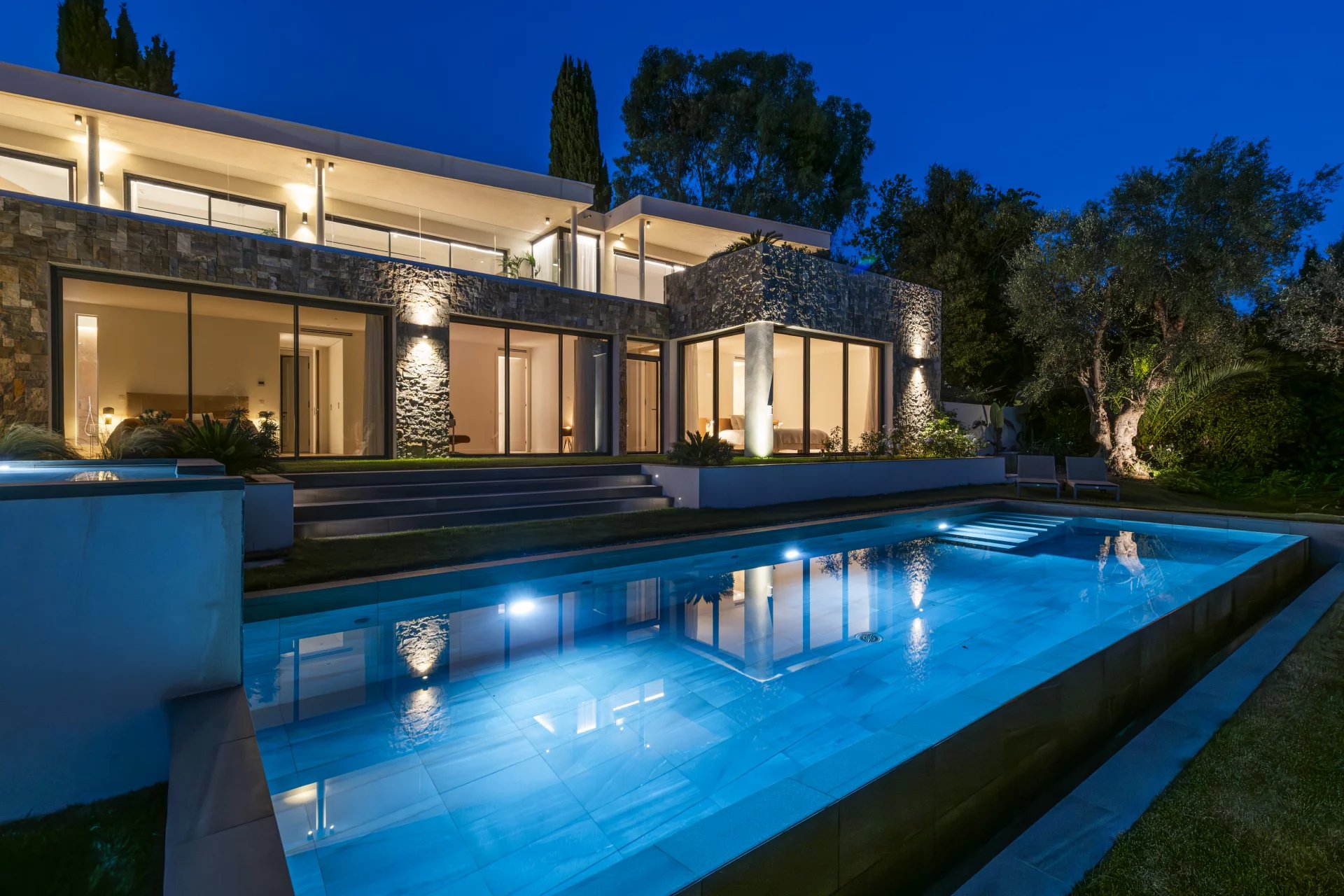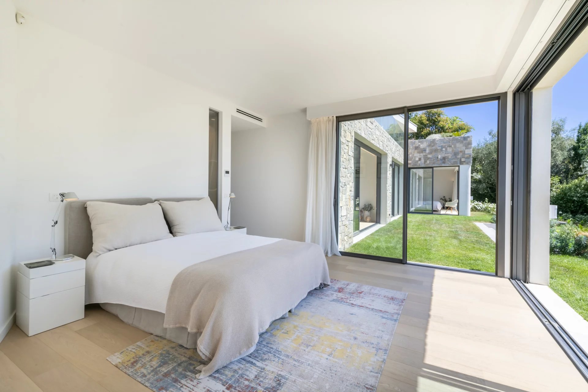 In absolute peace and quiet, nestling in the heart of a wooded garden of almost 1,300sqm with a saltwater swimming pool, this magnificent, fully-secured villa of around 400sqm, designed by a renowned architect, enjoys a magnificent panoramic view of the Estérel massif and a lovely glimpse of the sea.