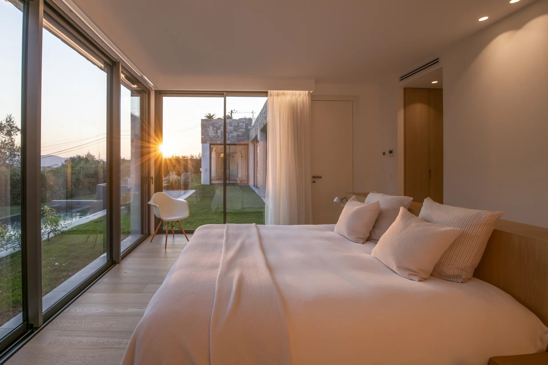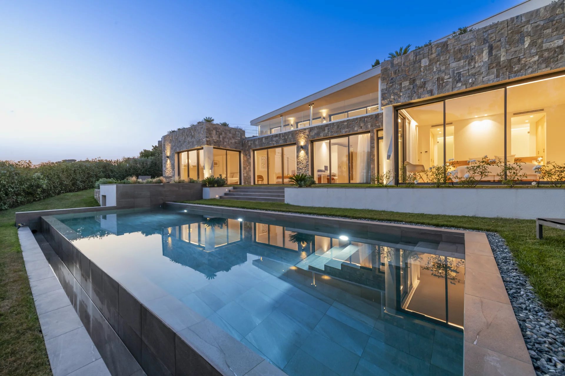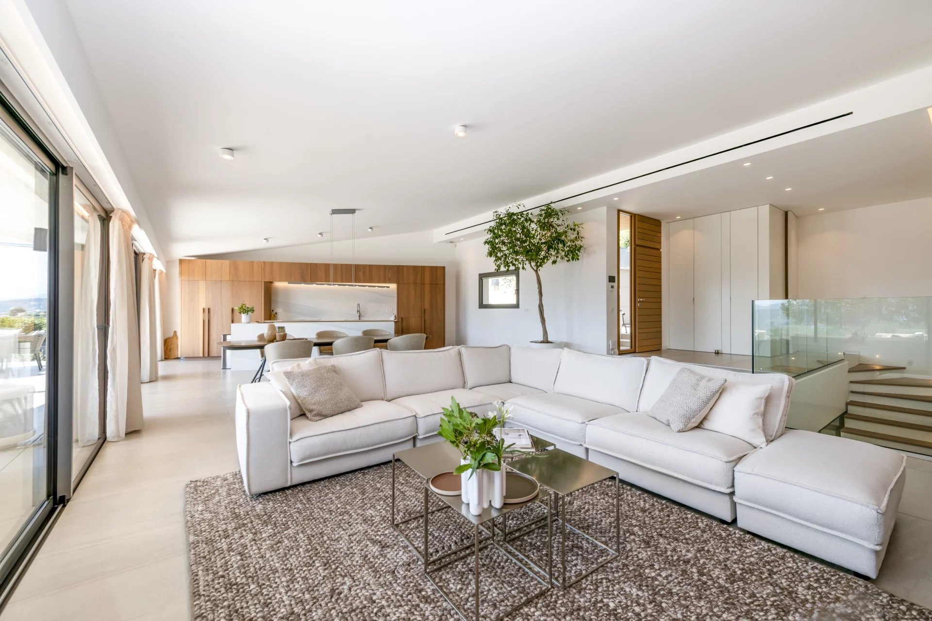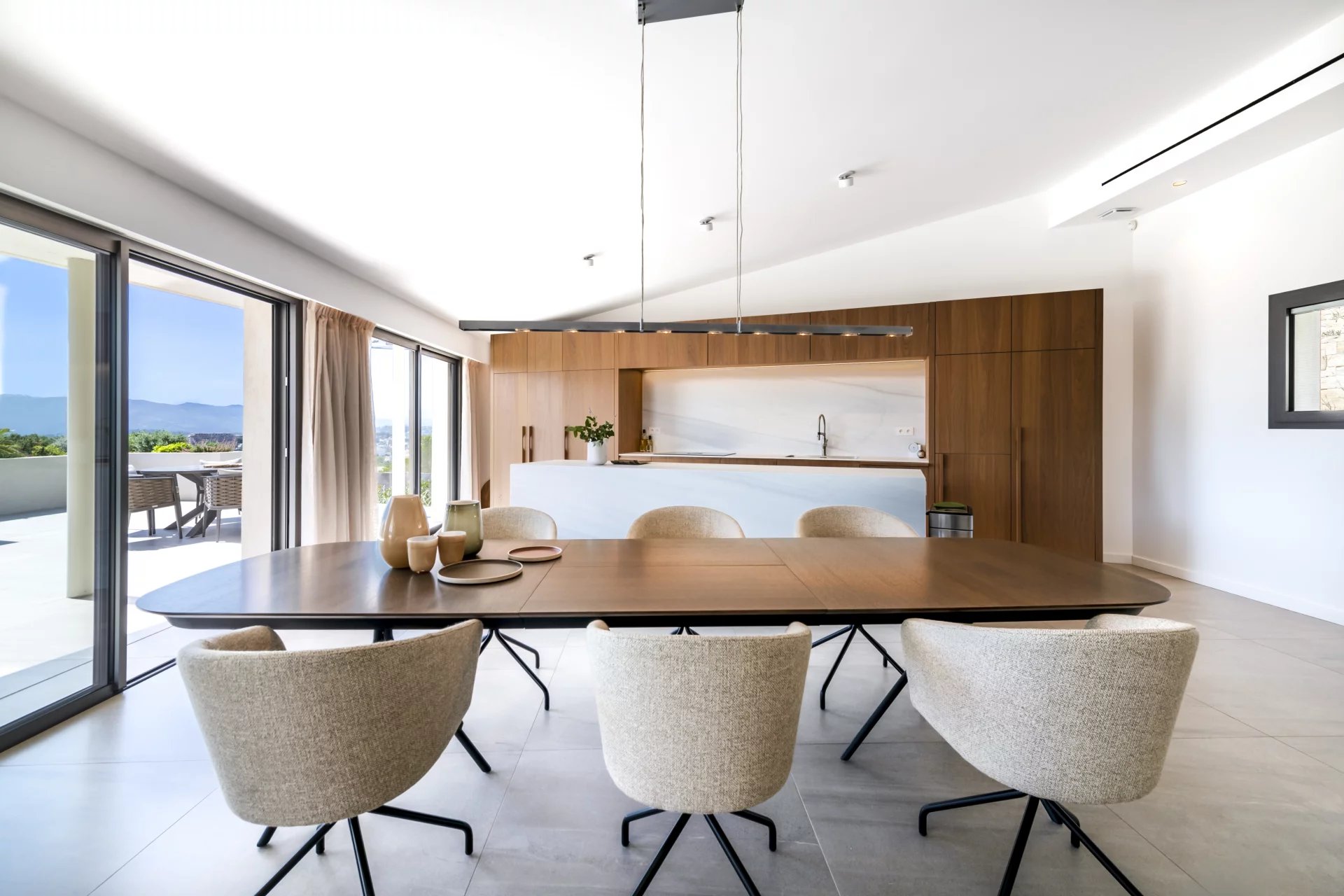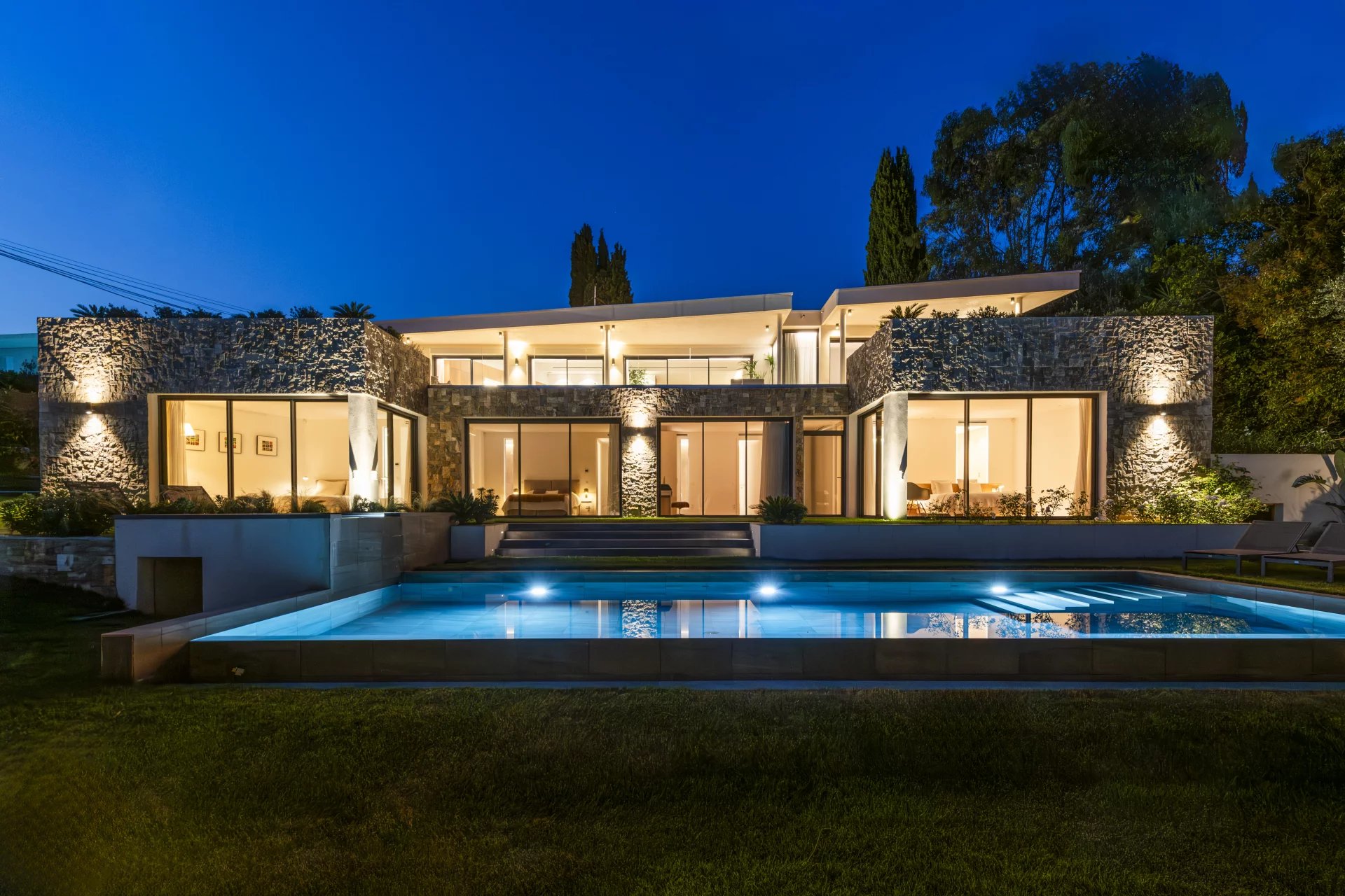 In absolute peace and quiet, nestling in the heart of a wooded garden of almost 1,300sqm with a saltwater swimming pool, this magnificent, fully-secured villa of around 400sqm, designed by a renowned architect, enjoys a magnificent panoramic view of the Estérel massif and a lovely glimpse of the sea.