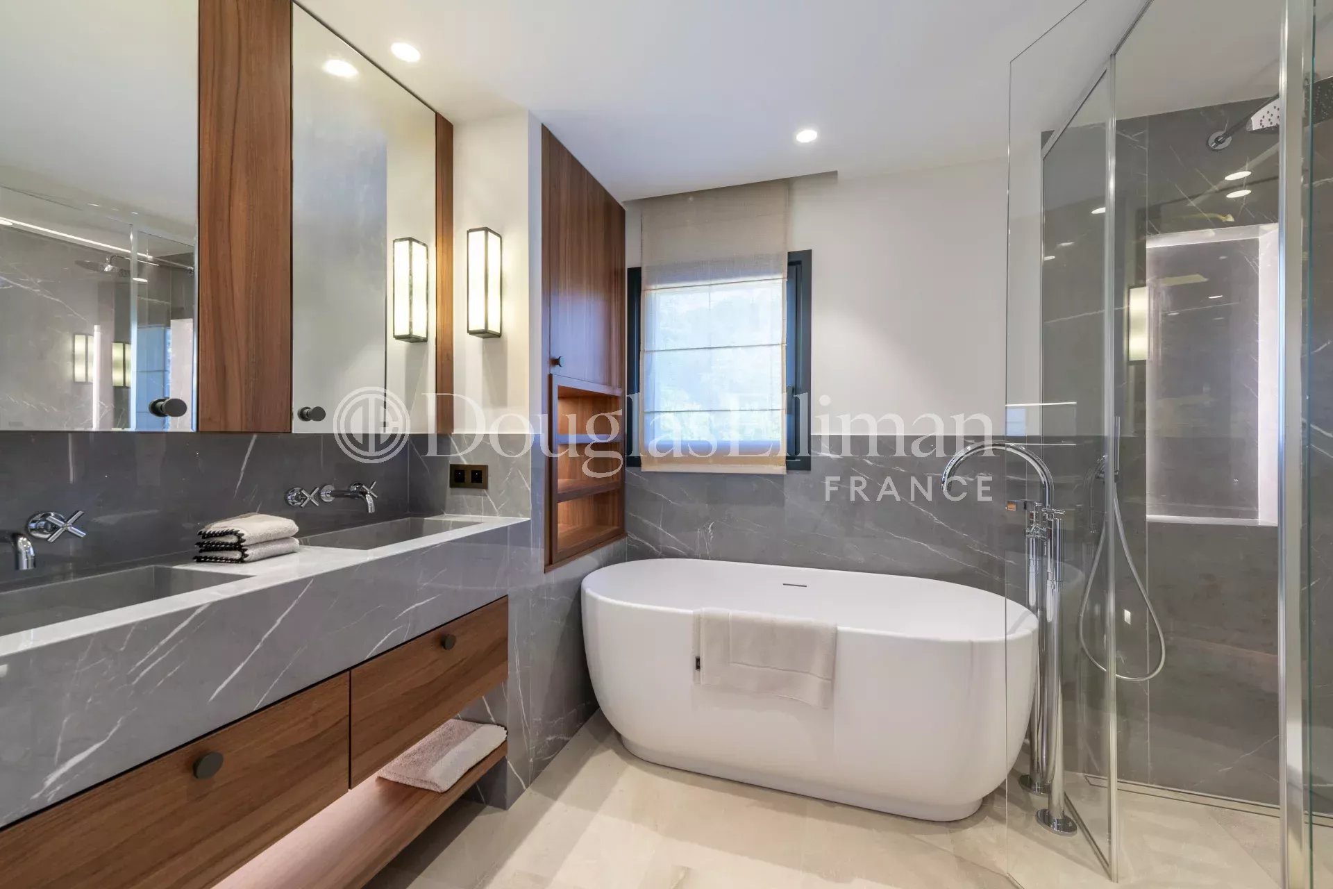 On the first floor, there's a vast entrance hall with dining room enjoying superb views over the park, top-of-the-range open kitchen, guest toilet, laundry room and 3 en-suite bedrooms.
