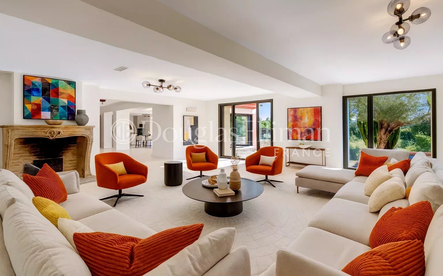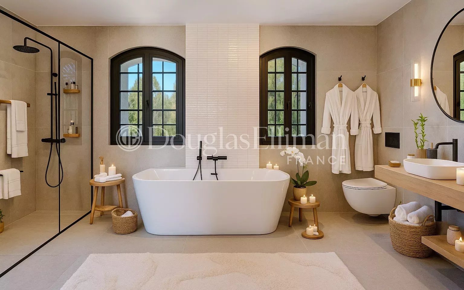 Upstairs, the master suite boasts a dressing room and luxurious bathroom, along with another en-suite bedroom. Both rooms open onto a large terrace offering lovely views of the hills and a glimpse of the sea.