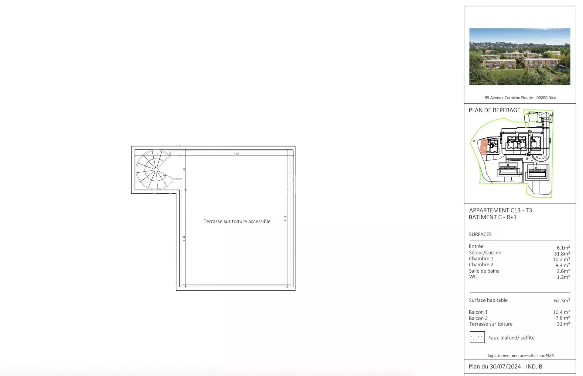 The apartment is southwest-facing and bathed in light, a magnificent 3-room apartment with two bedrooms, a shower room, opening onto two terraces and featuring a 30m2 roof terrace with panoramic hillside views, a jacuzzi and a garden. The apartment is sold furnished with a fitted and equipped kitchen.