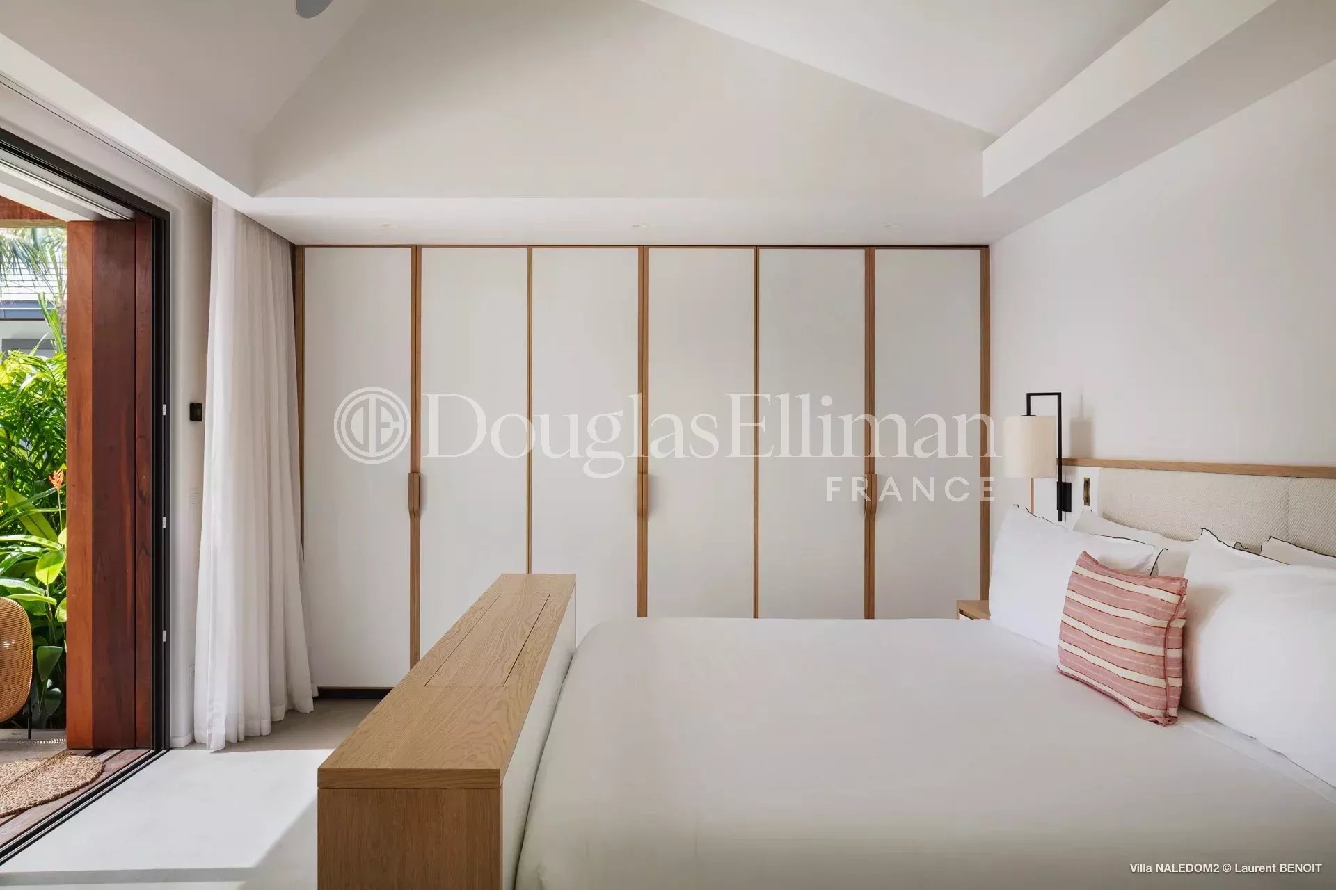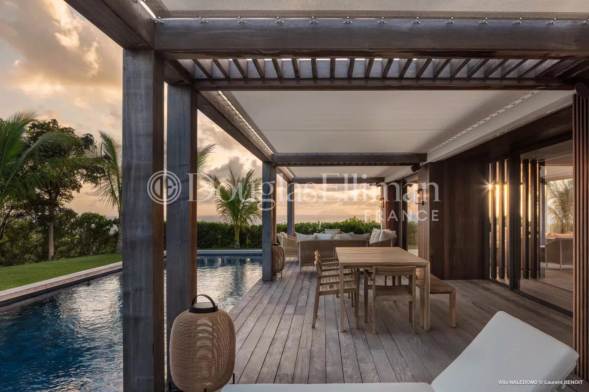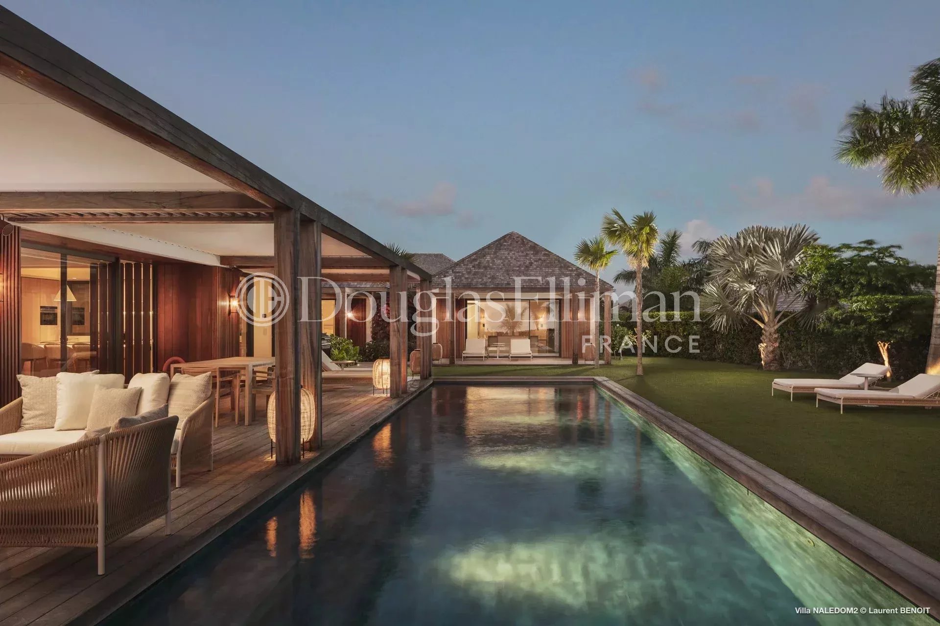 Outside, a meticulously landscaped tropical garden surrounds a large swimming pool, creating a serene and refined atmosphere.