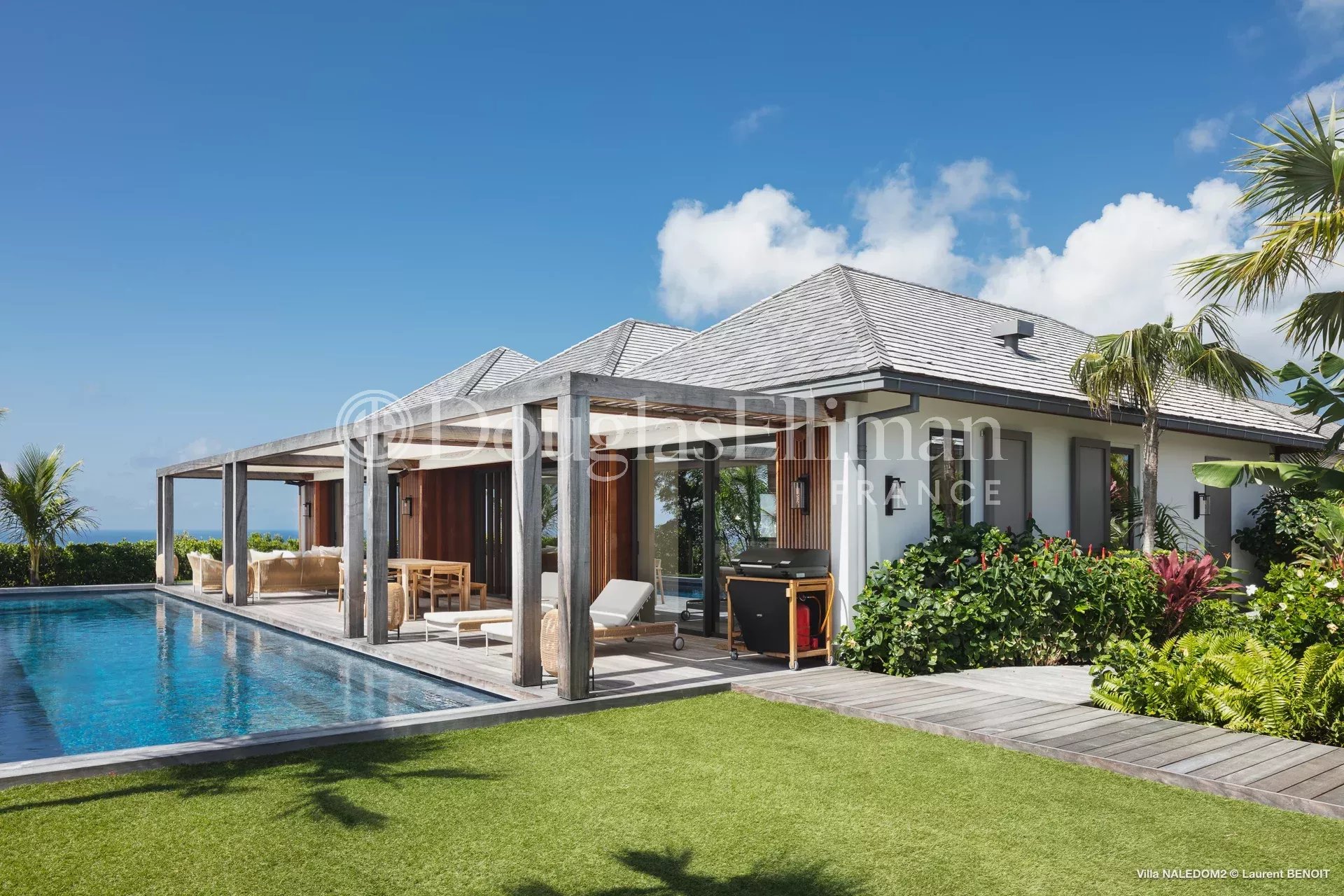 Outside, a meticulously landscaped tropical garden surrounds a large swimming pool, creating a serene and refined atmosphere.