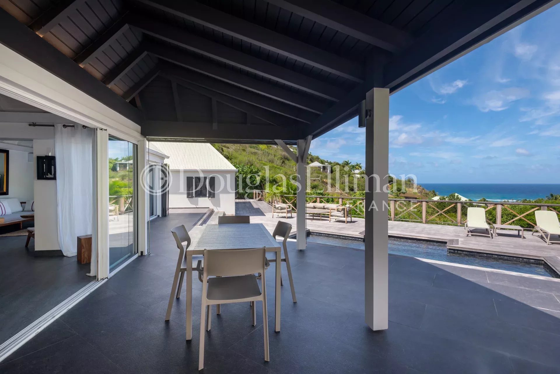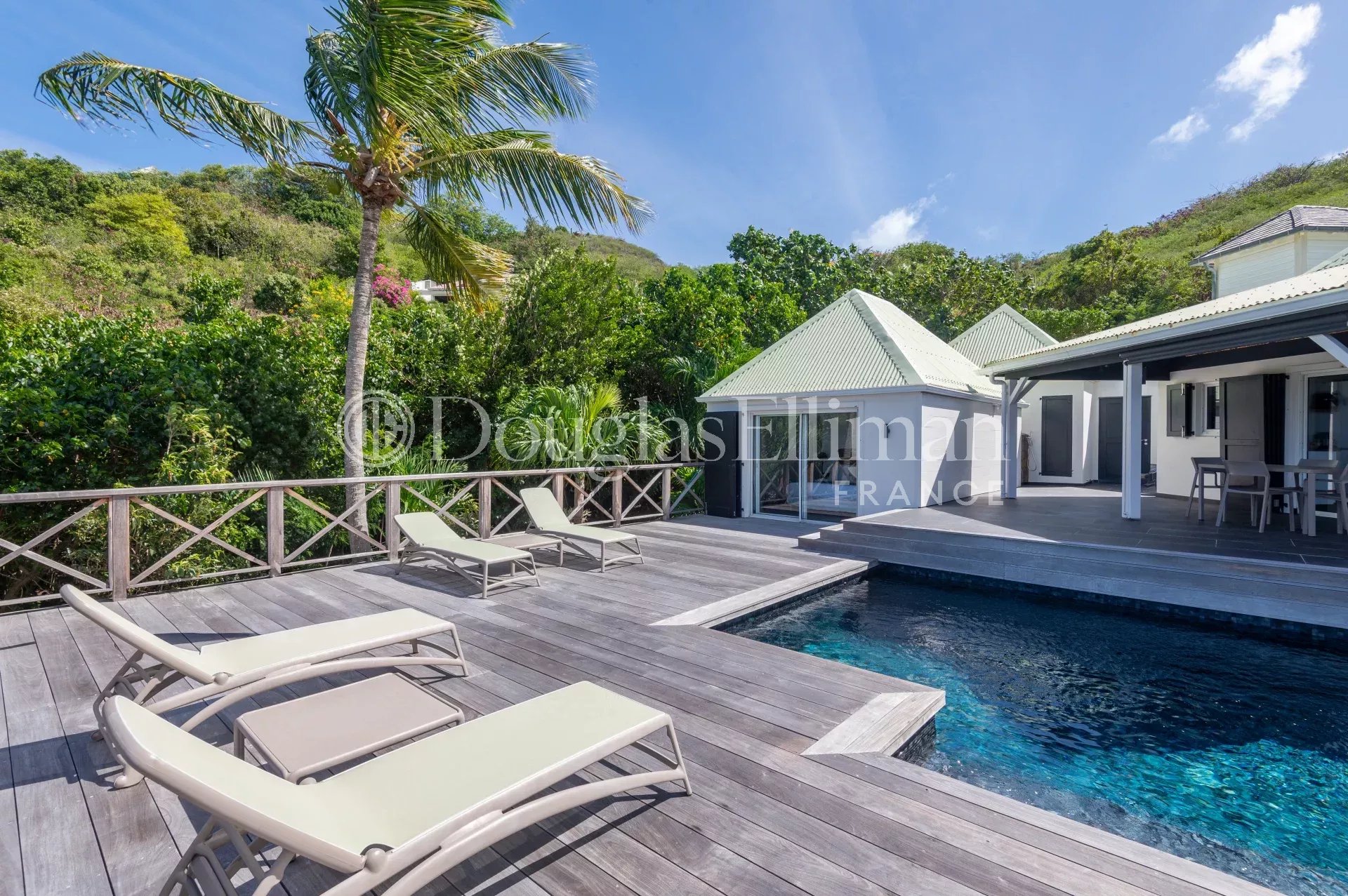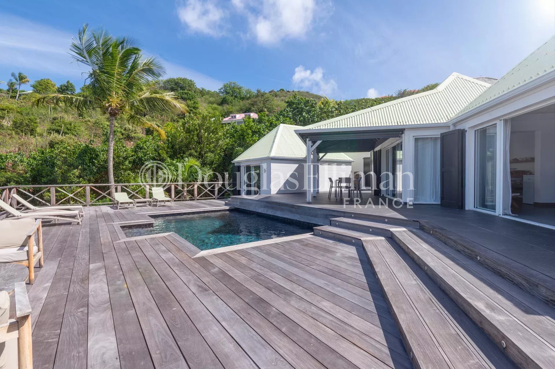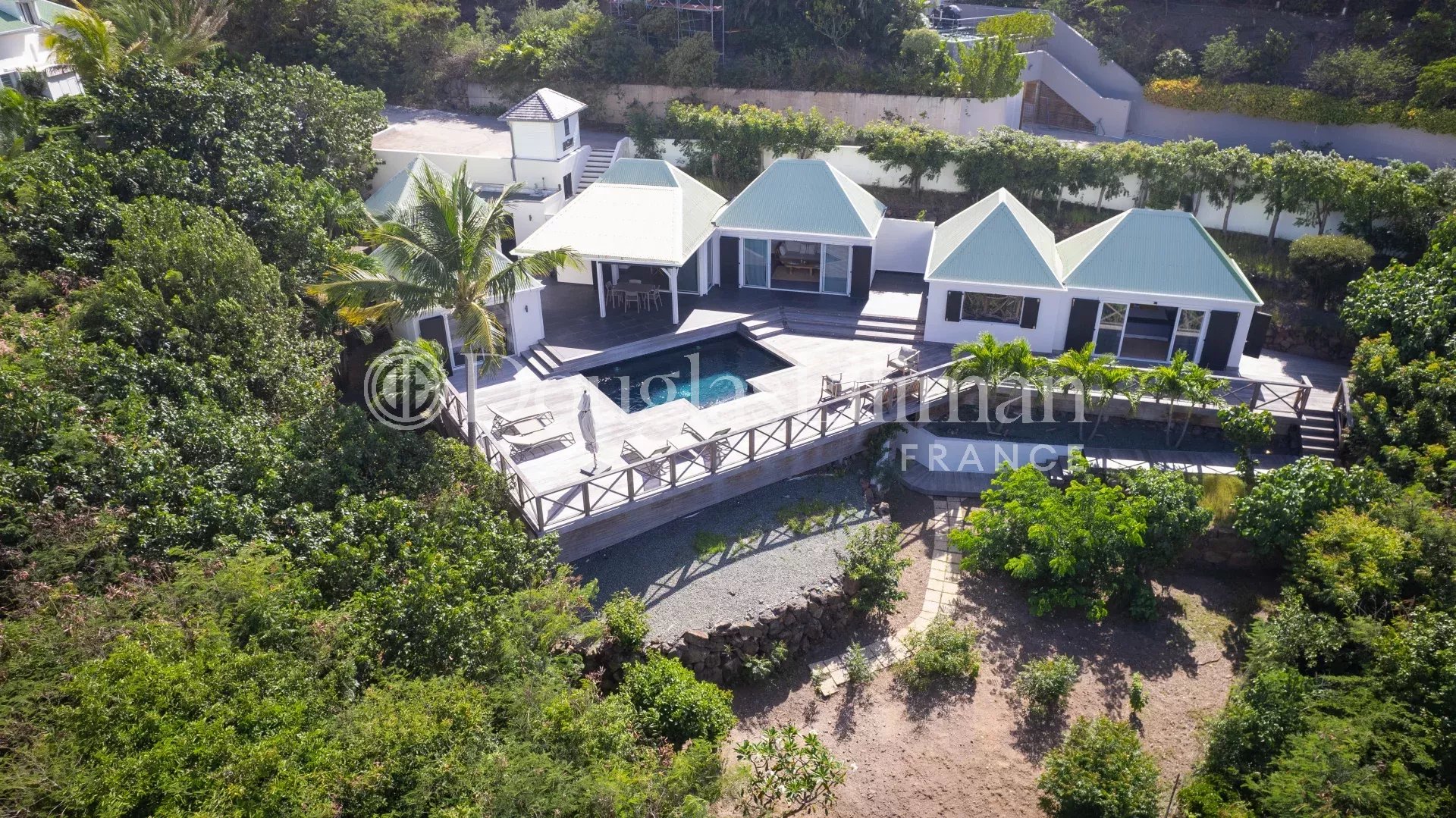 Located in Petit Cul-de-Sac, in a quiet, leafy setting right next to the lagoon and hotels such as the Toiny or the Barthélemy, the MLE villa offers a peaceful, sought-after living environment in Saint-Barthélemy.