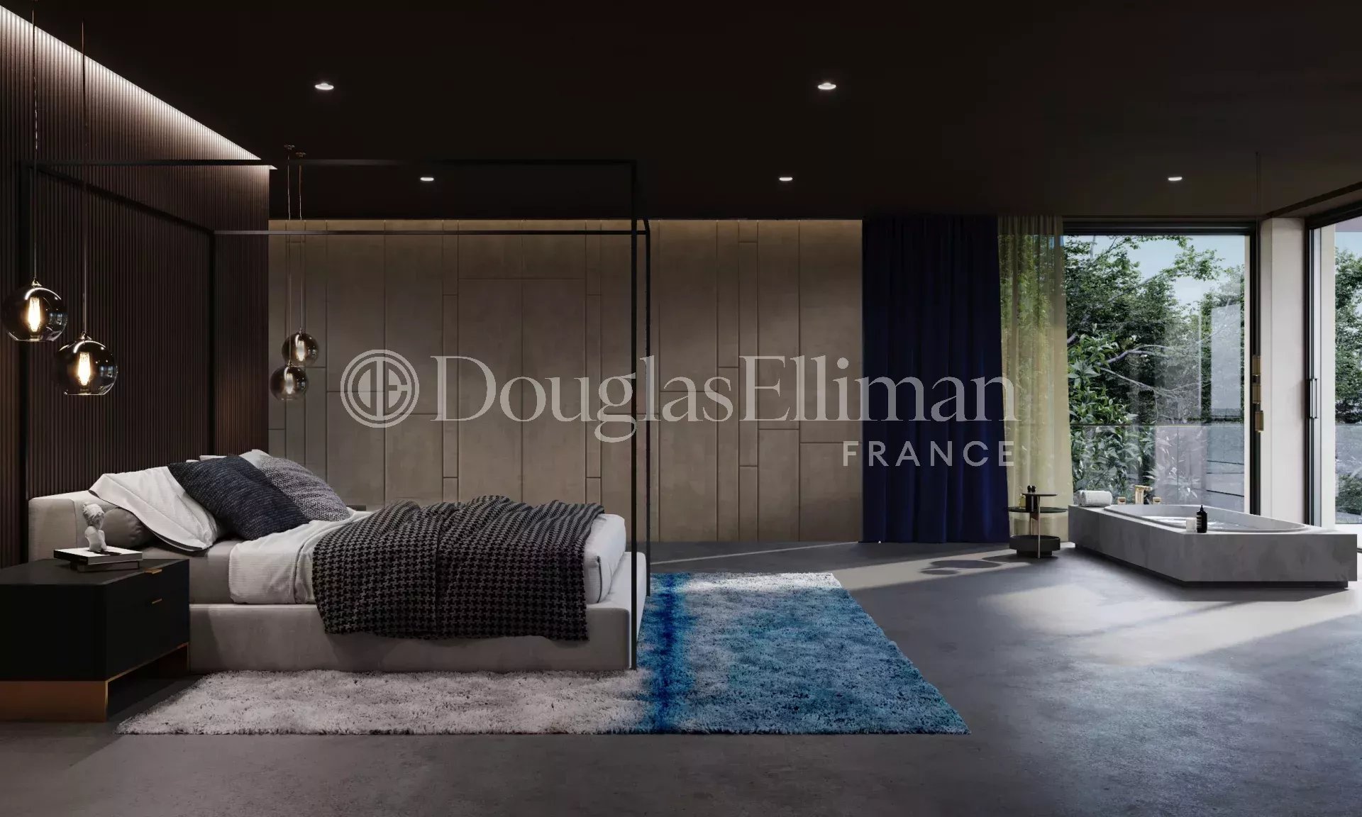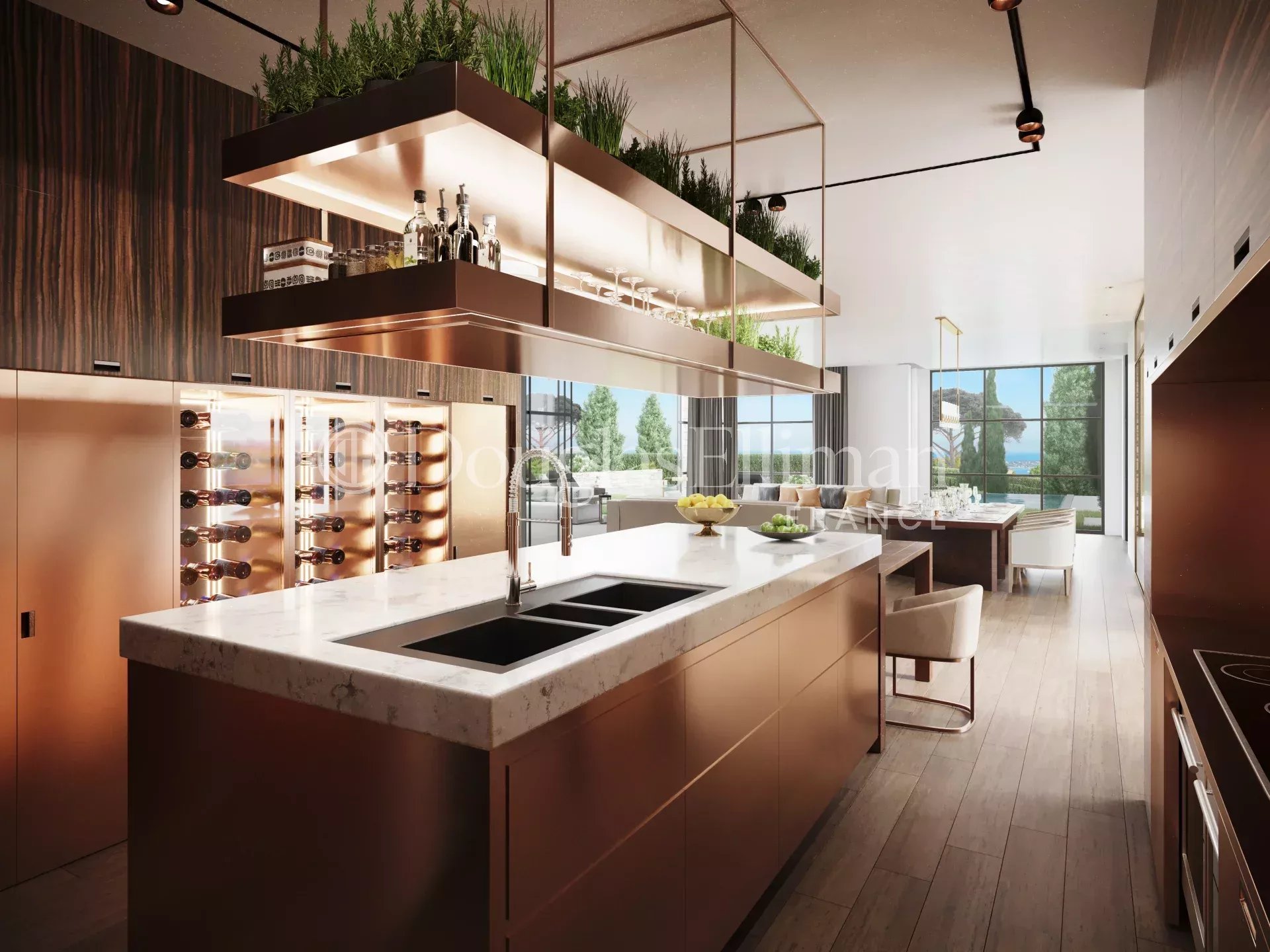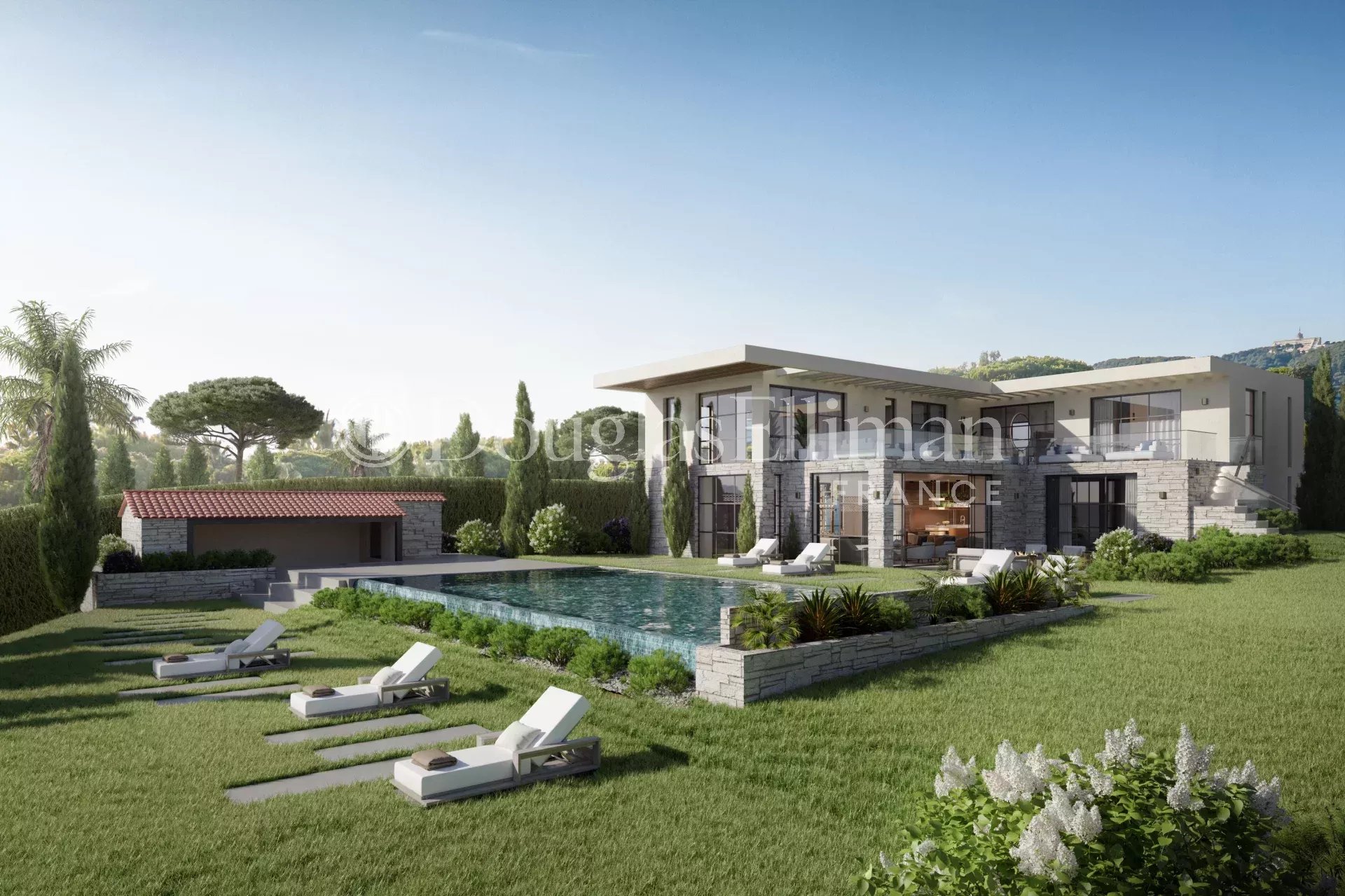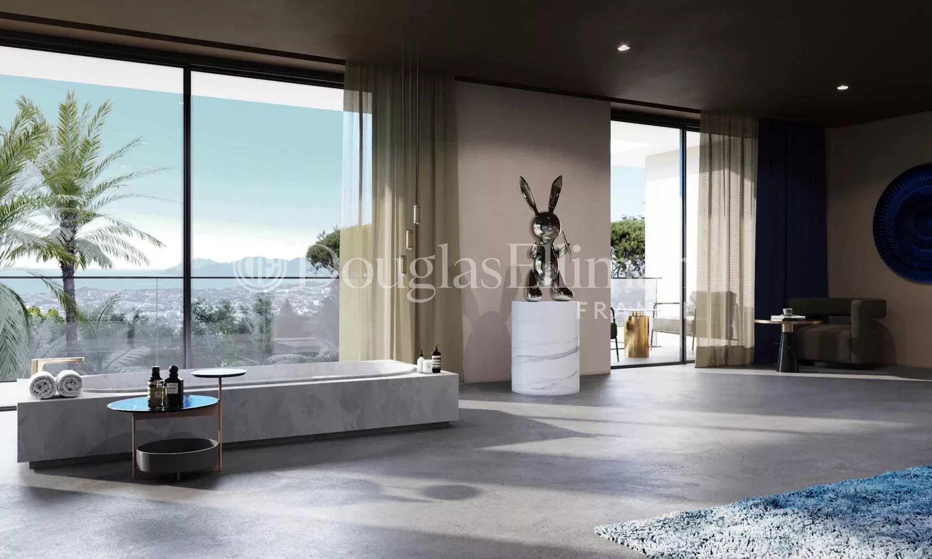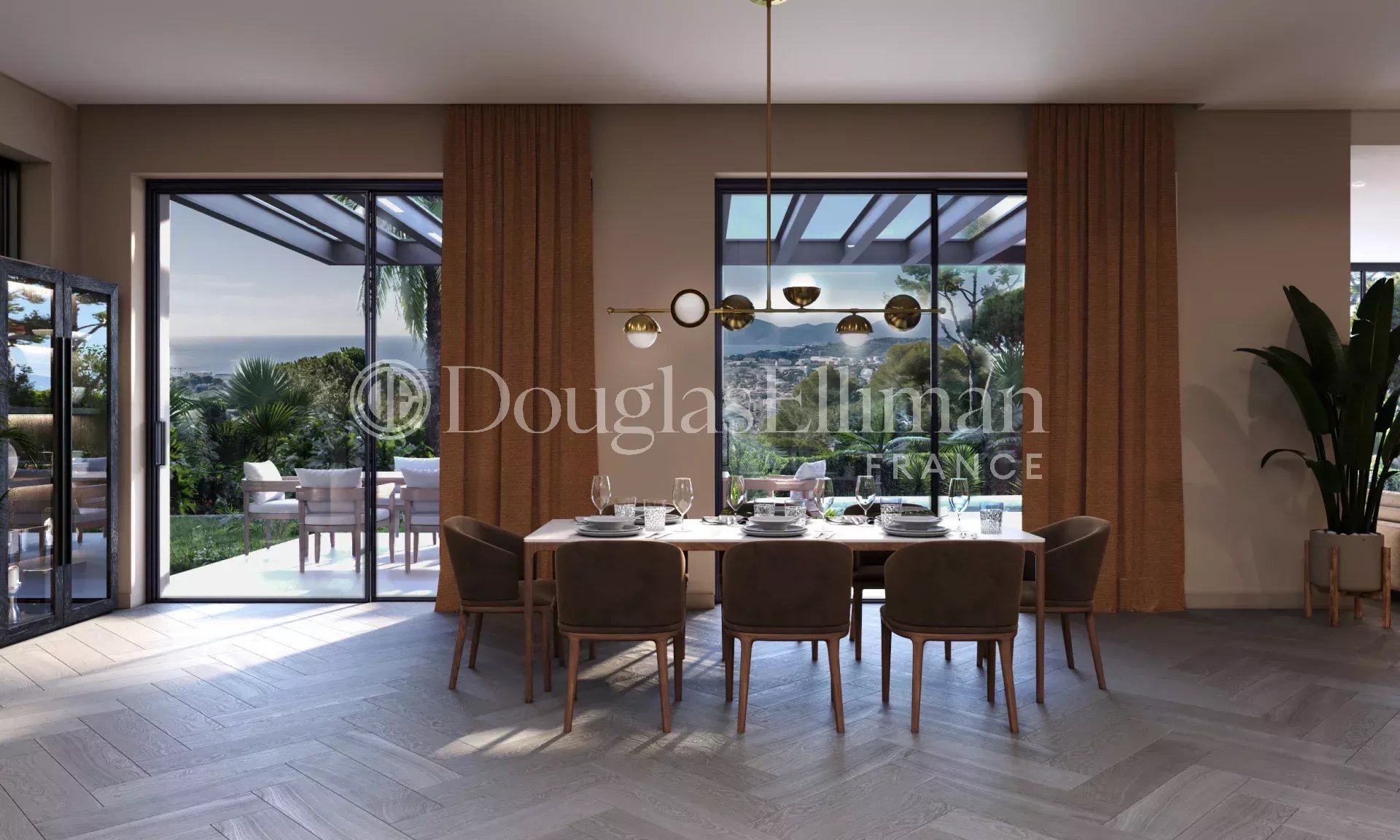 A prestigious driveway leads you to this sublime contemporary villa of 450 m2, set in a 2,090 m² plot in a private, secure estate on the heights of Super-Cannes, with exceptional 180-degree views over Cap d'Antibes, the sea and the Alps.