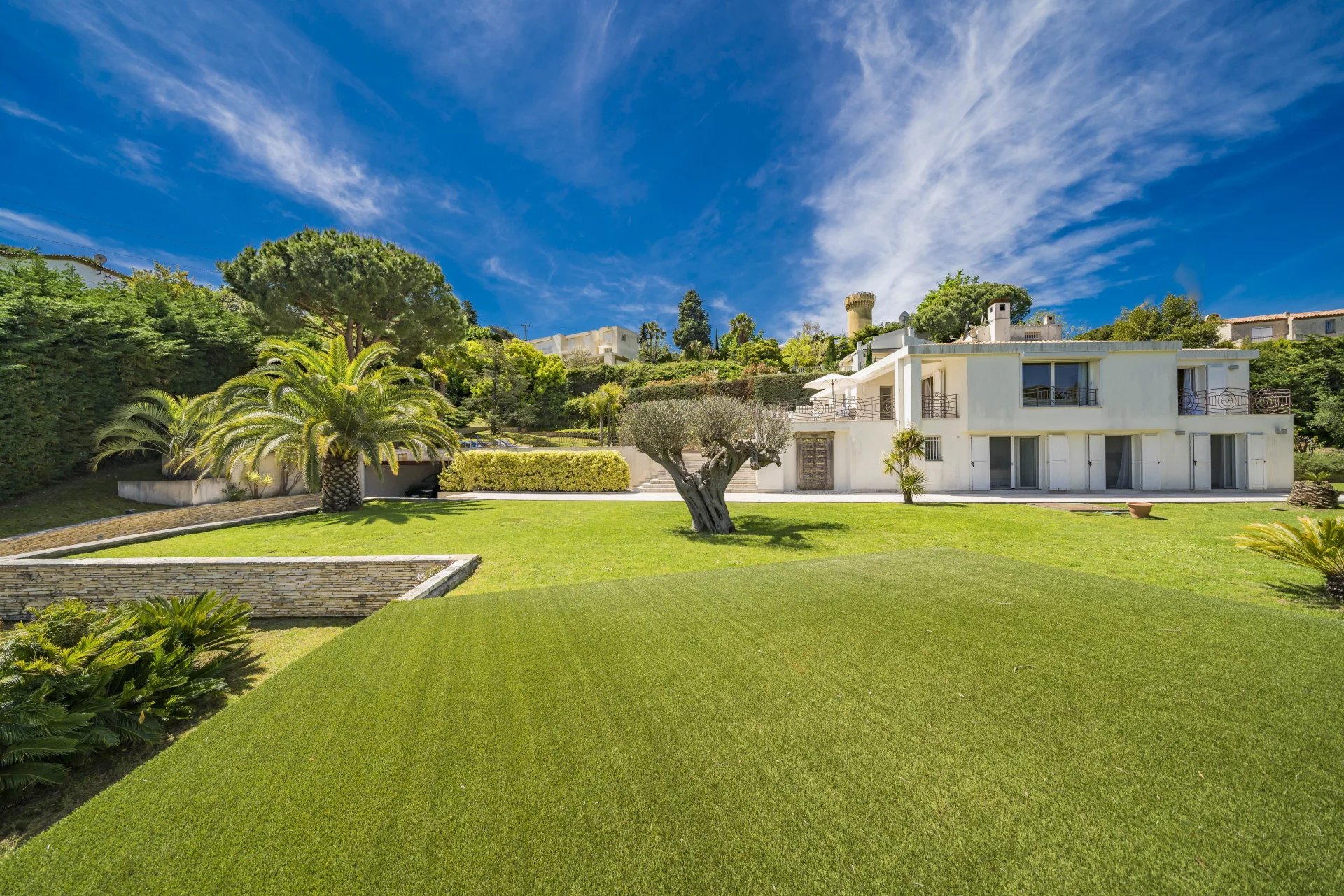 The property benefits from a well-maintained flat garden adorned with old olive trees and Mediterranean plants. It also includes a pool and two garages that can accommodate up to 6 cars.