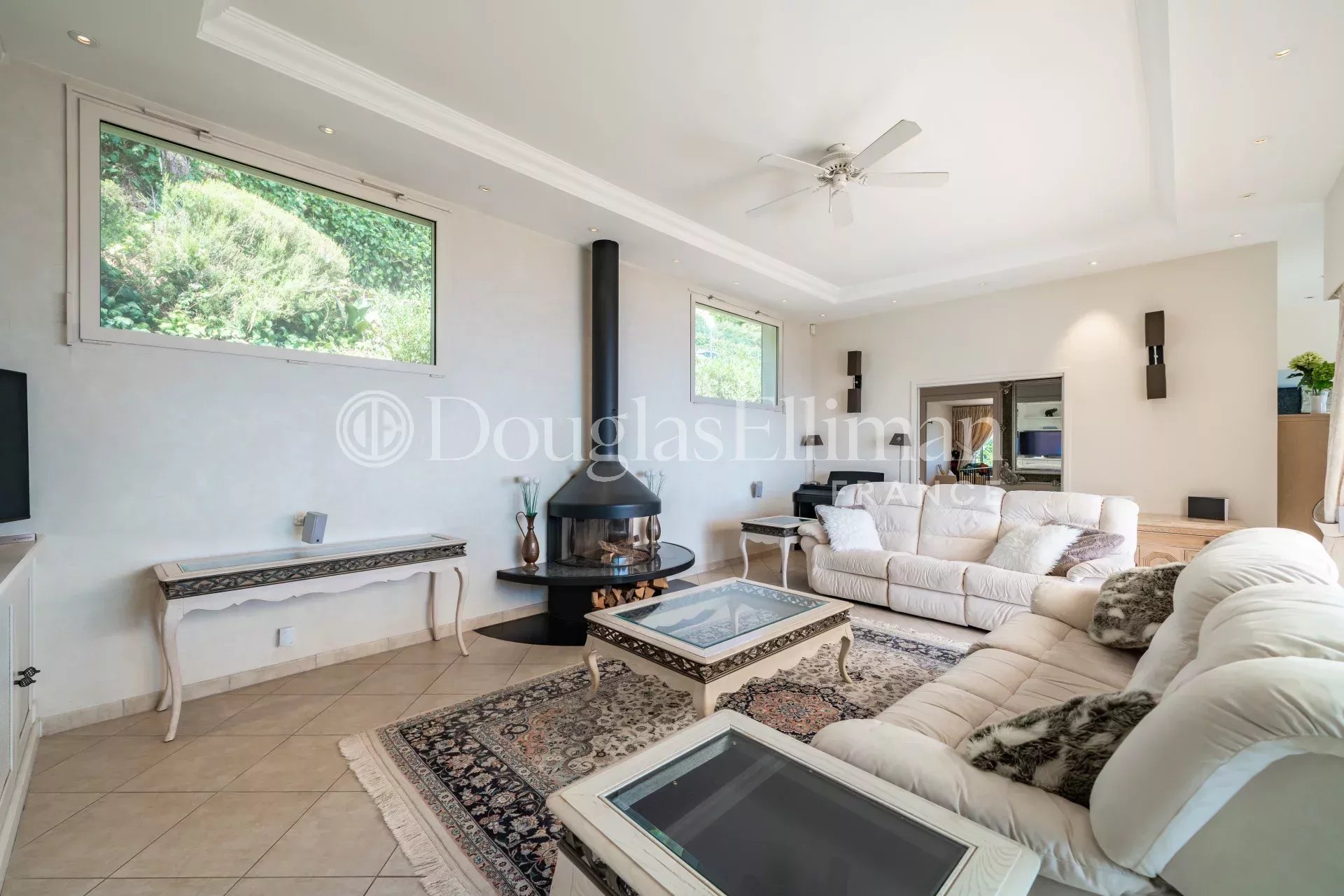 The open-plan lounge with fireplace and dining room open onto a spacious terrace. The kitchen is fully equipped. The air-conditioned master bedroom has a dressing room and en-suite bathroom. The pool level has three additional bedrooms with sea views, each with its own bathroom.