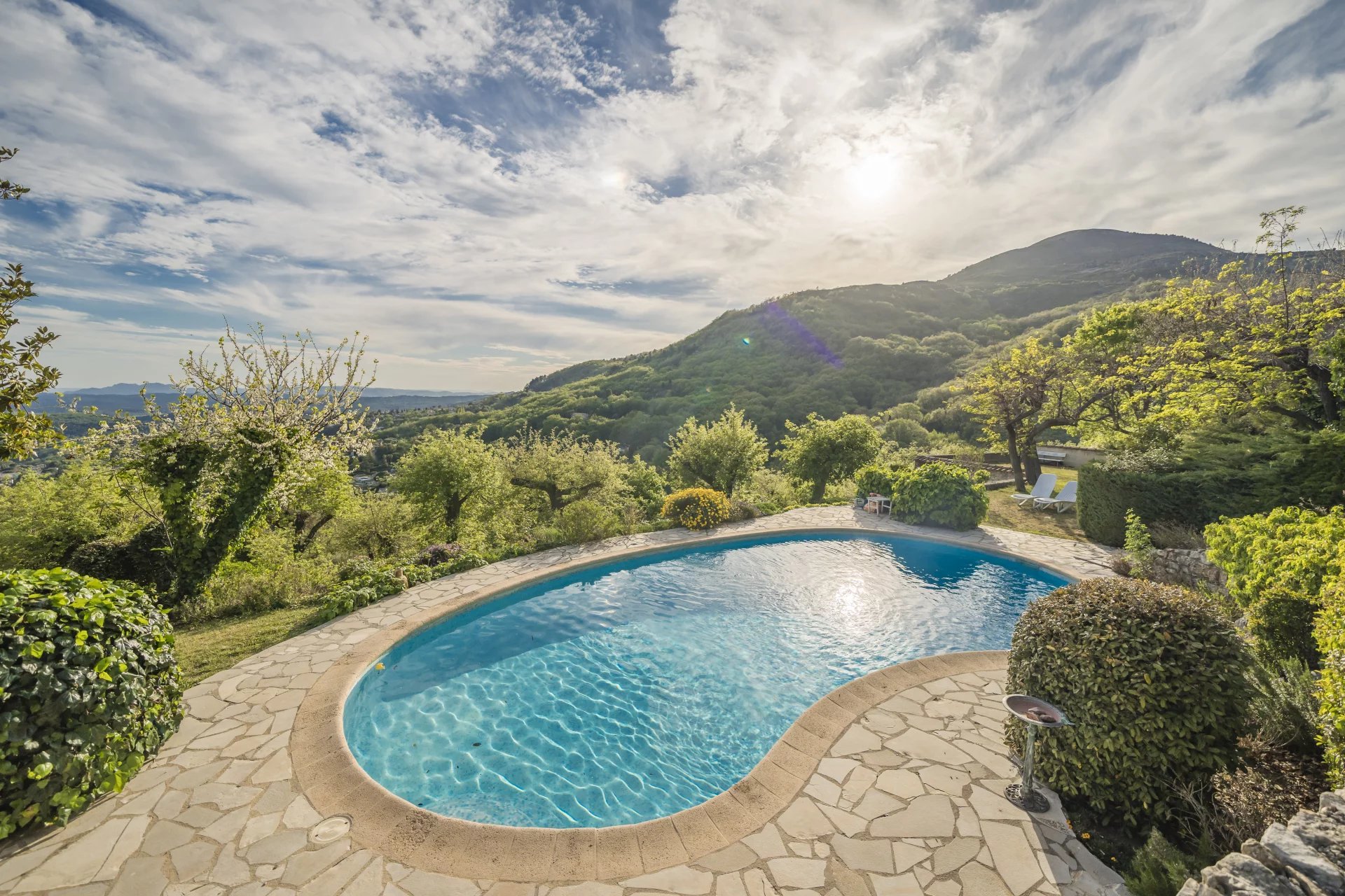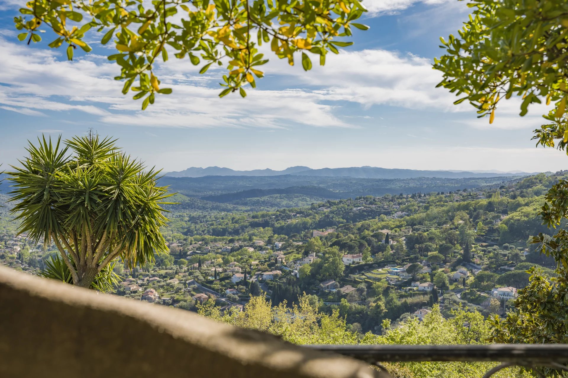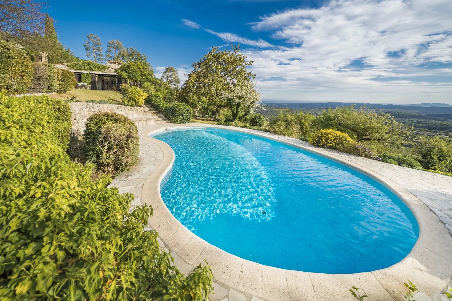 Nestled in a serene environment in Vence, this delightful villa presents a clear view of the sea and the picturesque countryside, forming a captivating and diverse landscape.
