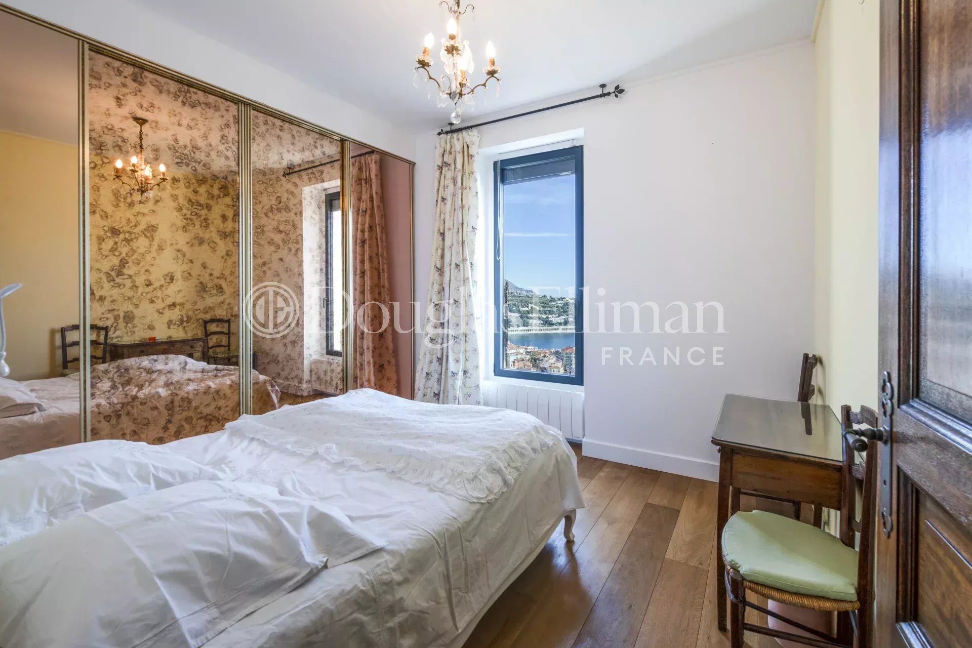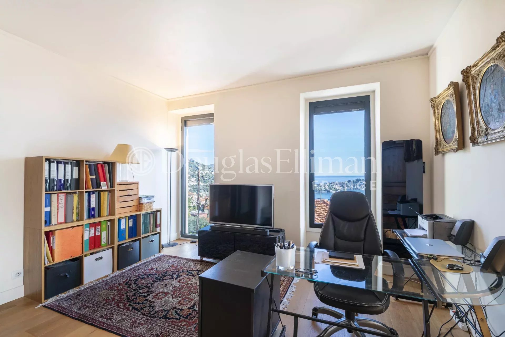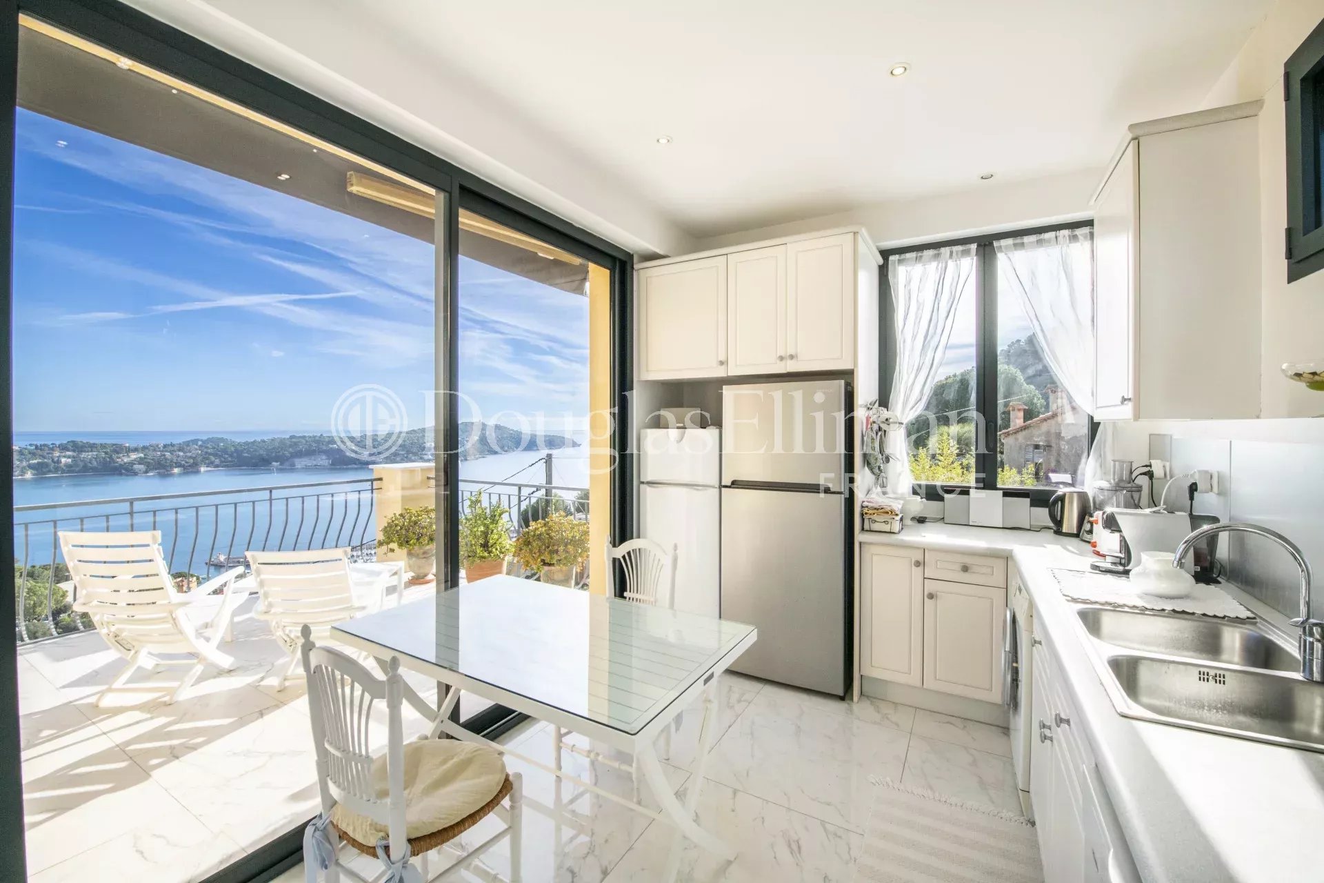The second level features a generously sized and luminous living space, boasting expansive sliding doors that open onto a splendid terrace overlooking the sea. And a spacious, well-equipped kitchen with direct access to the terrace offering panoramic views of Villefranche Bay and Cap Ferrat.