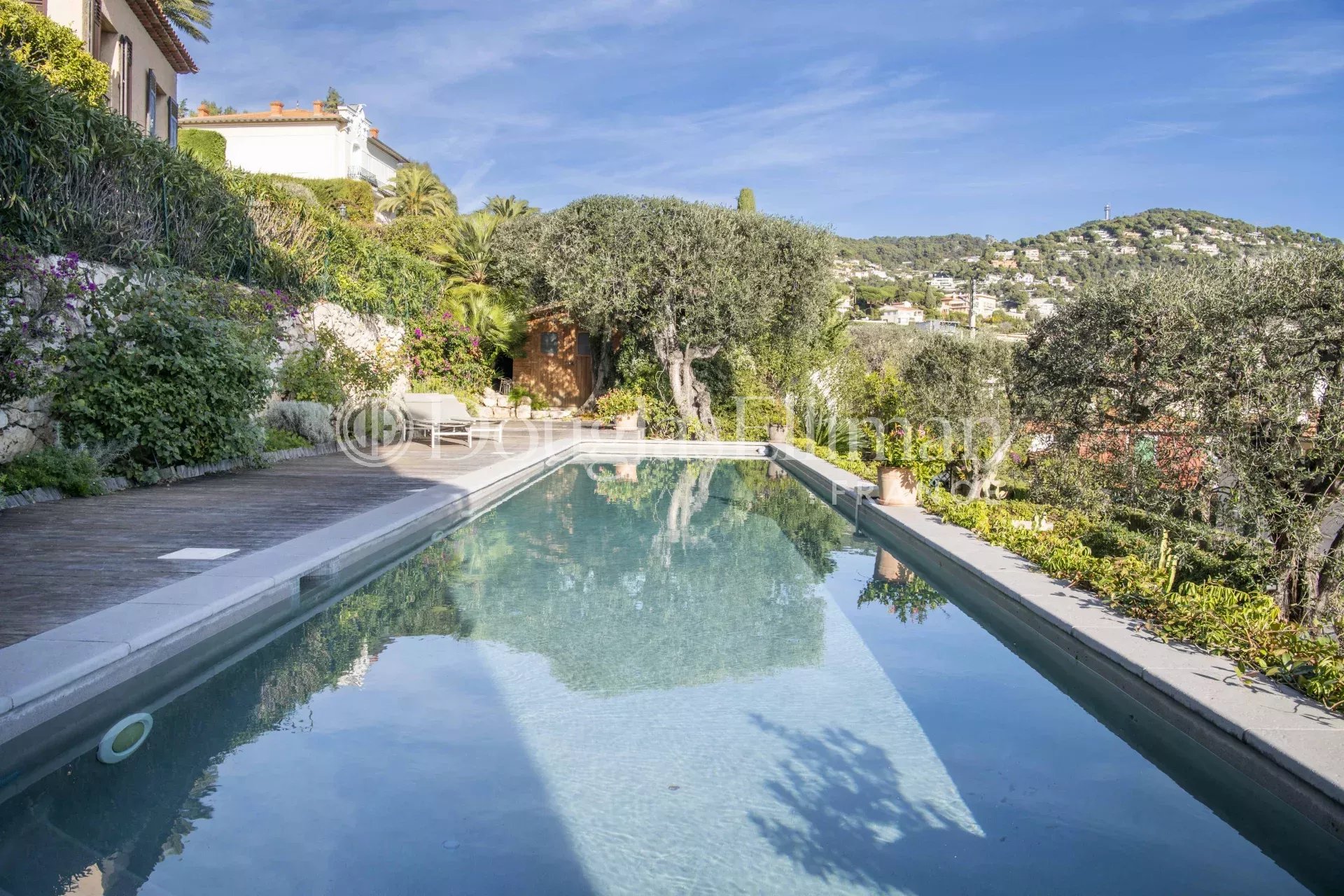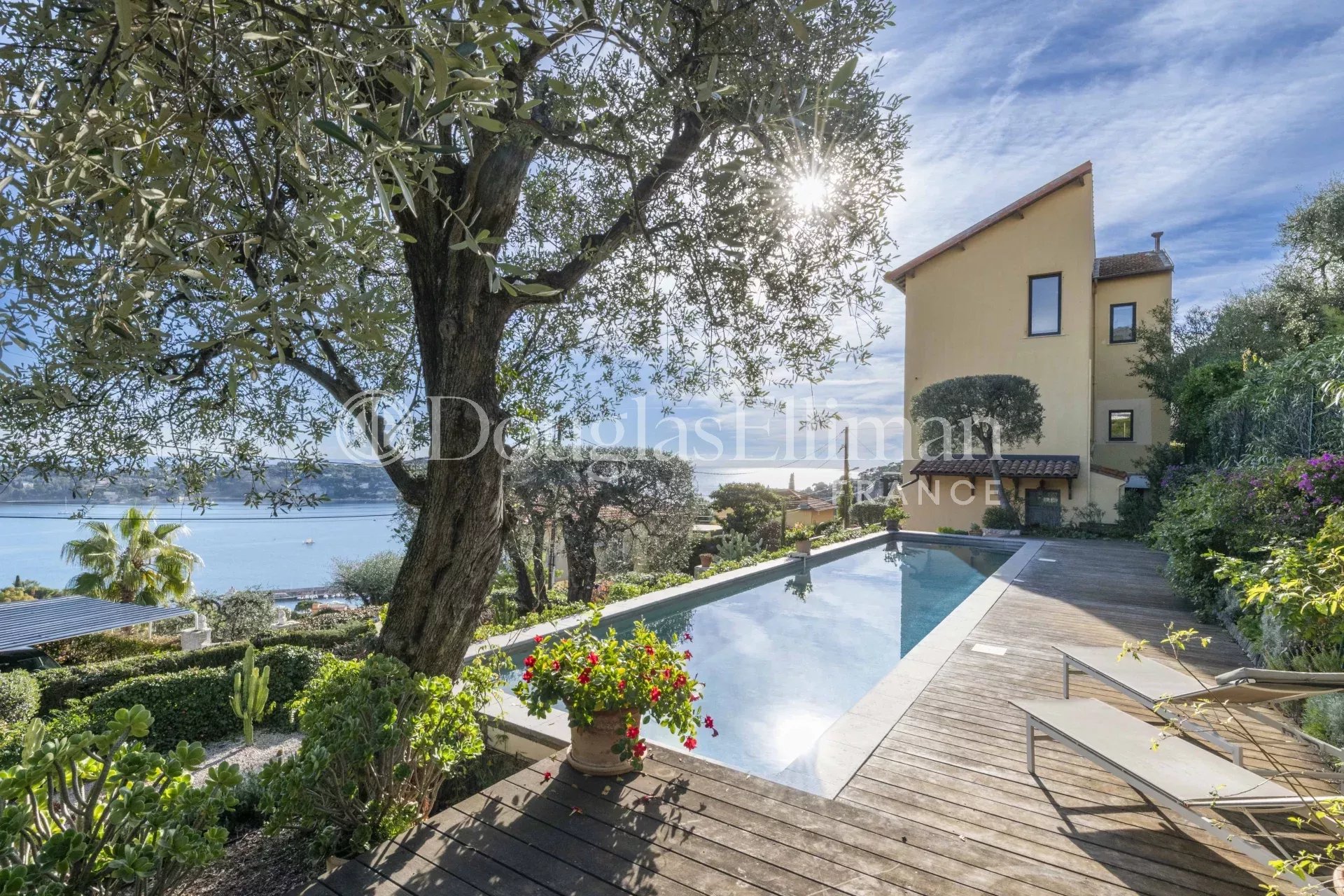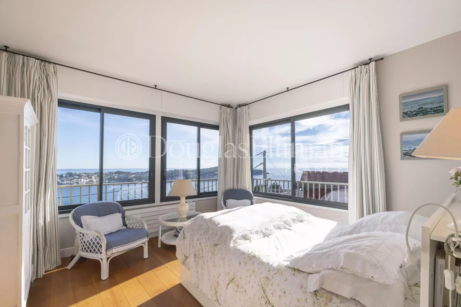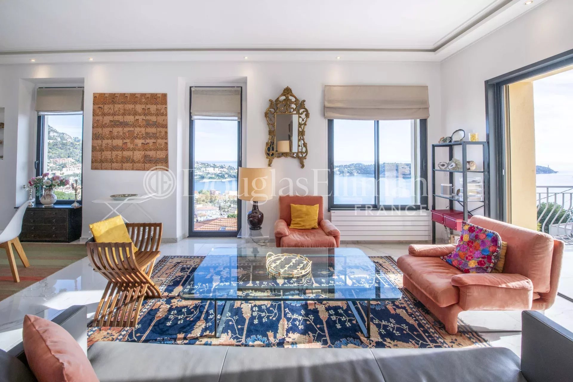 The second level features a generously sized and luminous living space, boasting expansive sliding doors that open onto a splendid terrace overlooking the sea. And a spacious, well-equipped kitchen with direct access to the terrace offering panoramic views of Villefranche Bay and Cap Ferrat.