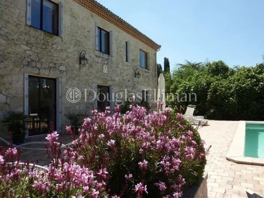 L'extérieur dispose d'une terrasse orientée sud-ouest et d'une piscine chauffée. La propriété comprend également une cave, une dépendance et deux garages spacieux.