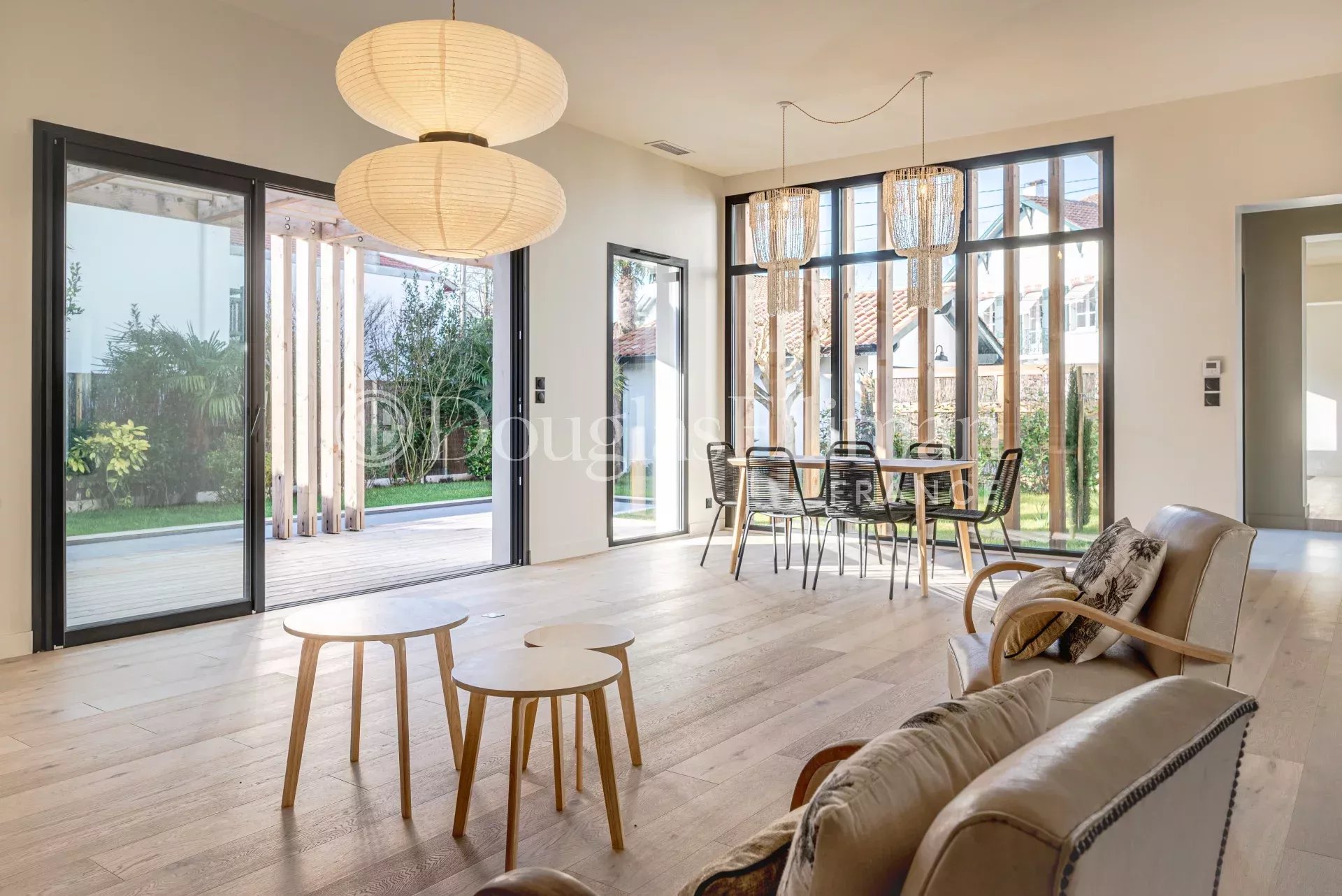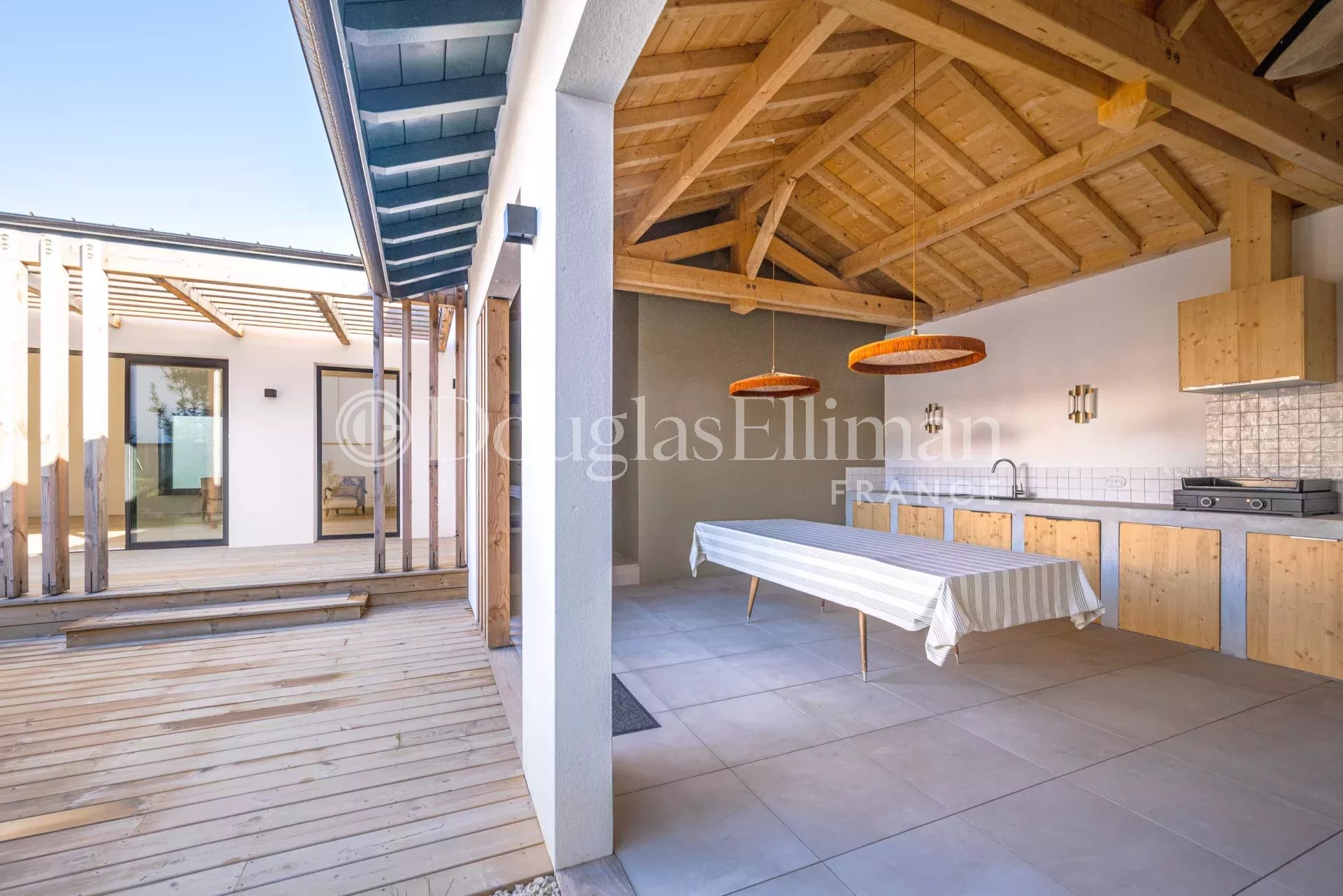 Une vaste pièce de vie lumineuse, où l’espace et la convivialité se rencontrent. La cuisine, entièrement équipée, ravira les amateurs de gastronomie avec ses équipements modernes et son agencement fonctionnel. Une belle terrasse s'ouvre sur le jardin, offrant un cadre idyllique pour vos repas en plein air ainsi qu’une terrasse couverte avec cuisine équipée.