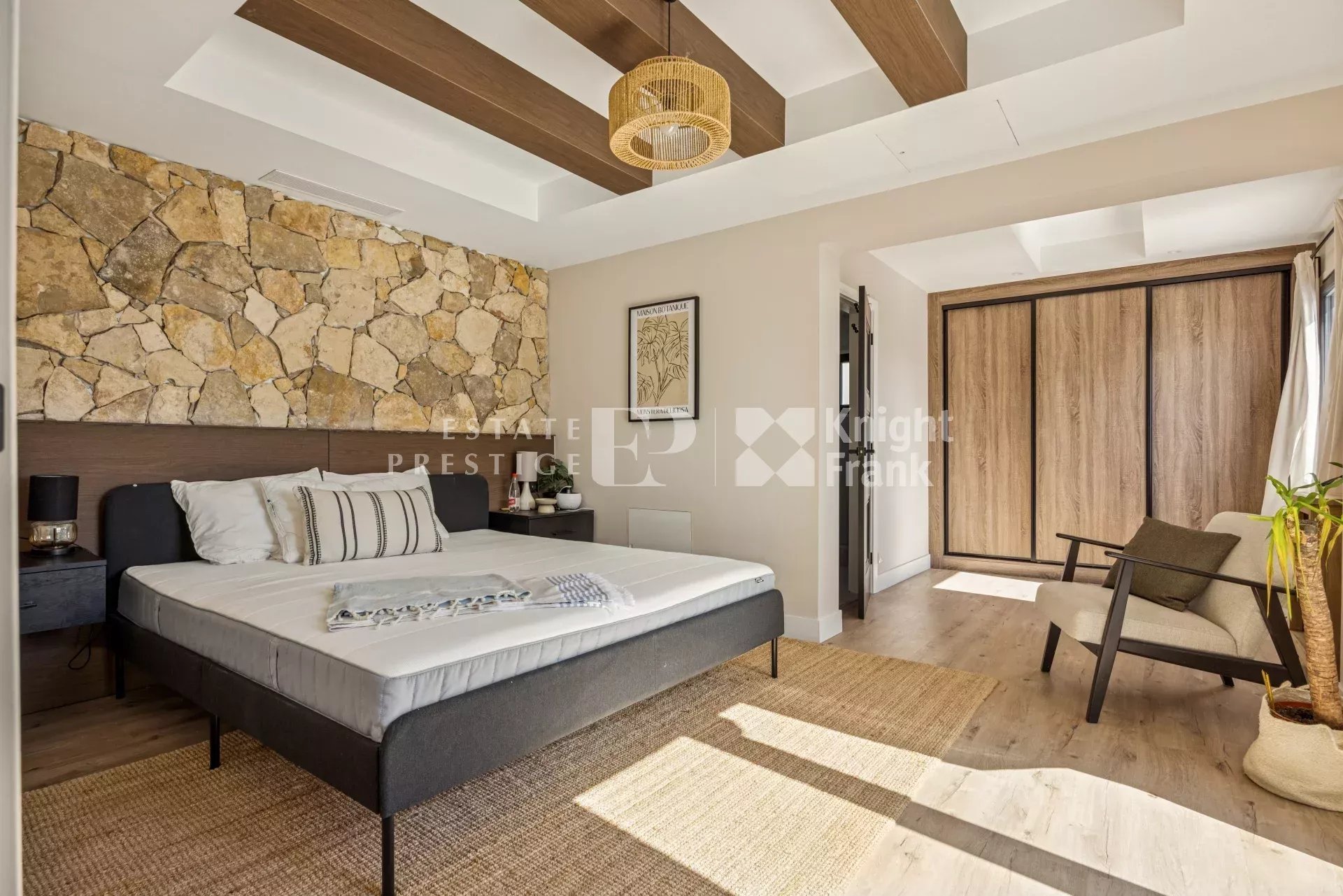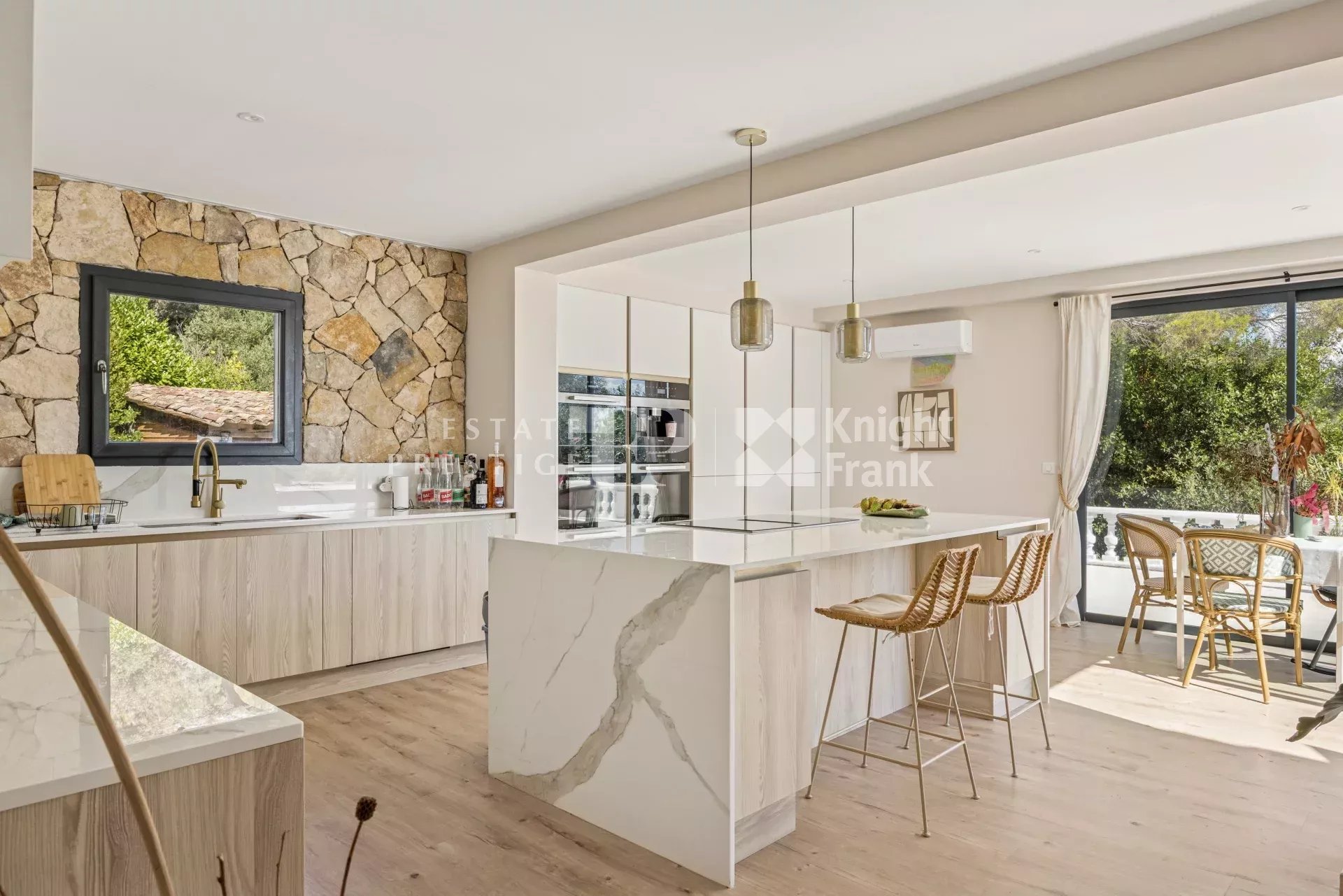 Elle propose un vaste espace salon et salle à manger baigné de lumière naturelle, ainsi qu’une cuisine entièrement équipée ouvrant sur une terrasse accueillante – parfaite pour recevoir. La villa dispose de quatre chambres en suite, chacune avec sa propre salle de bains ou salle d’eau, assurant confort et indépendance à chacun.