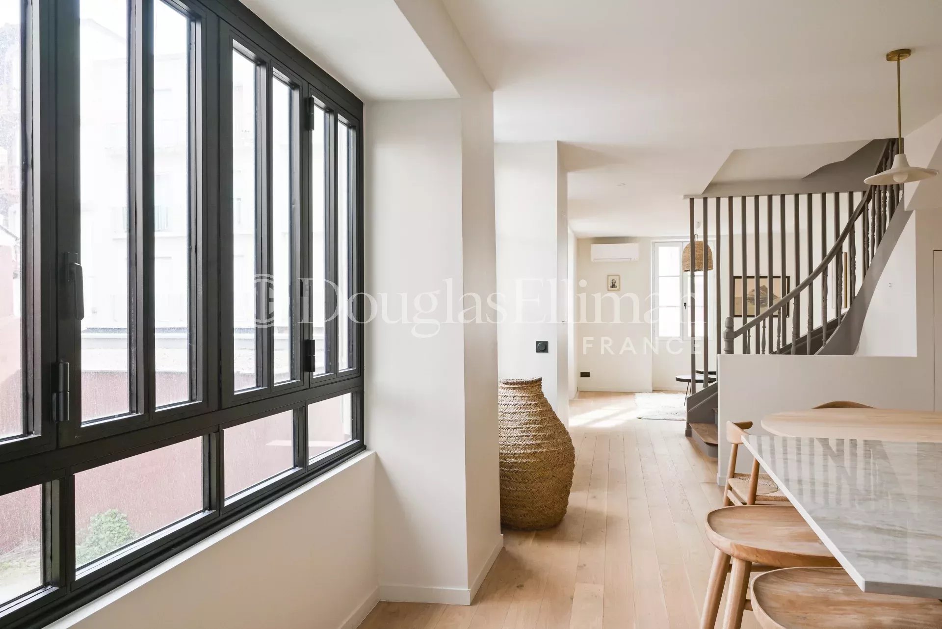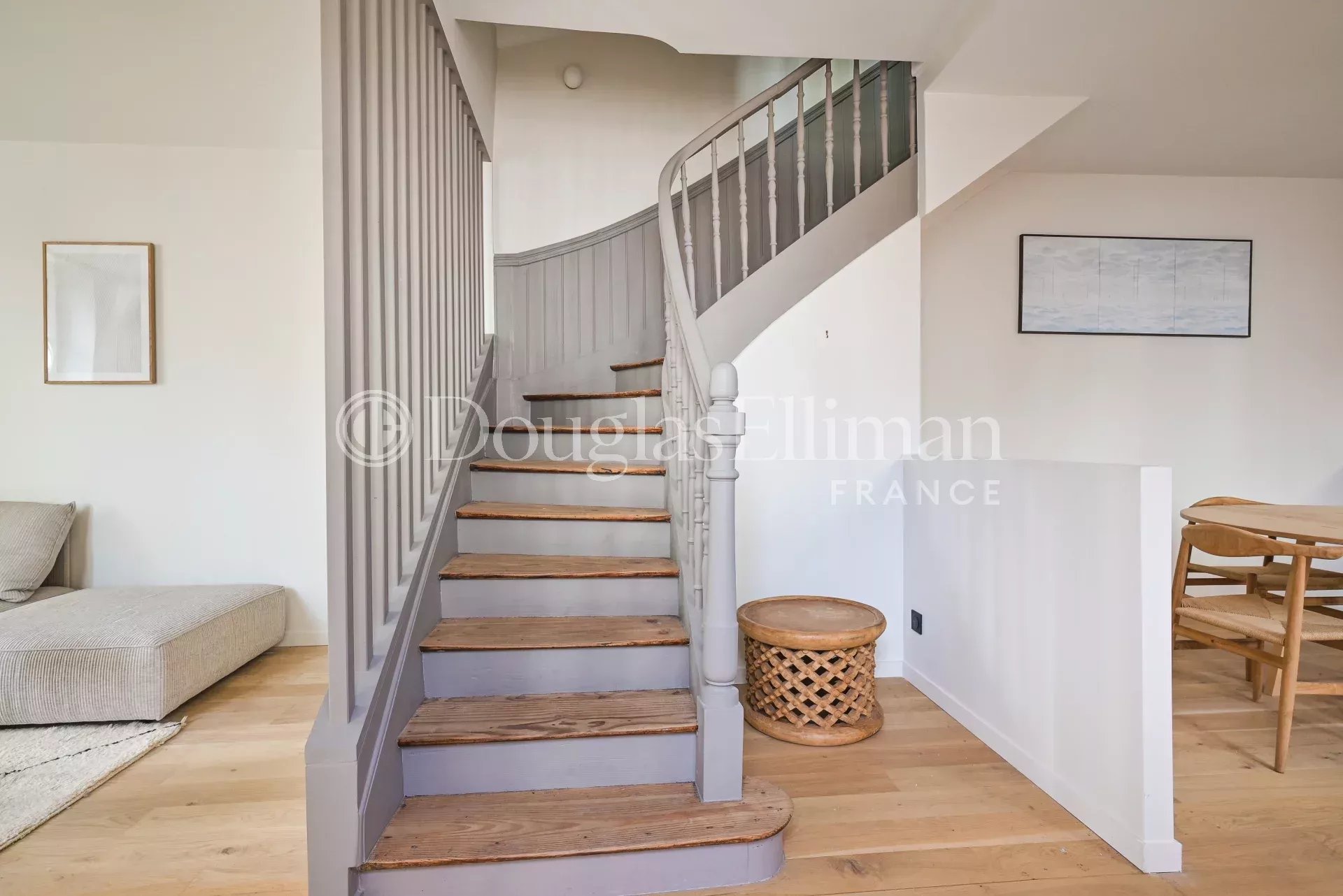 La rénovation met en valeur le caractère du lieu dans une composition contemporaine : escalier central, parquets d’origine, volumes repensés et matériaux naturels créent une atmosphère chaleureuse.