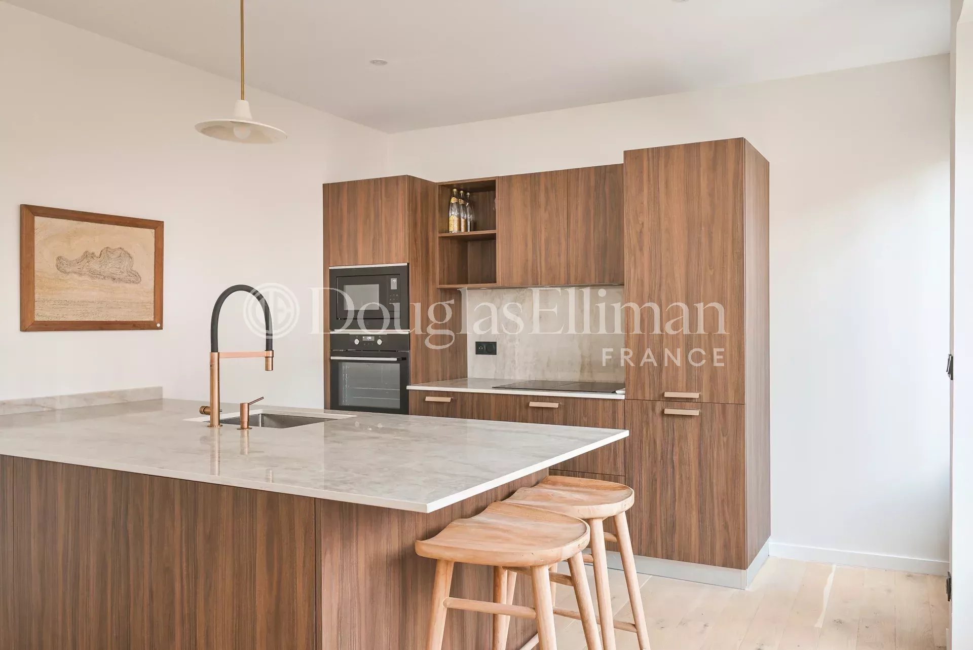 Le rez-de-chaussée accueille la pièce de vie avec salon et cuisine ouverte en enfilade, prolongée par une terrasse d’environ 20 m².
