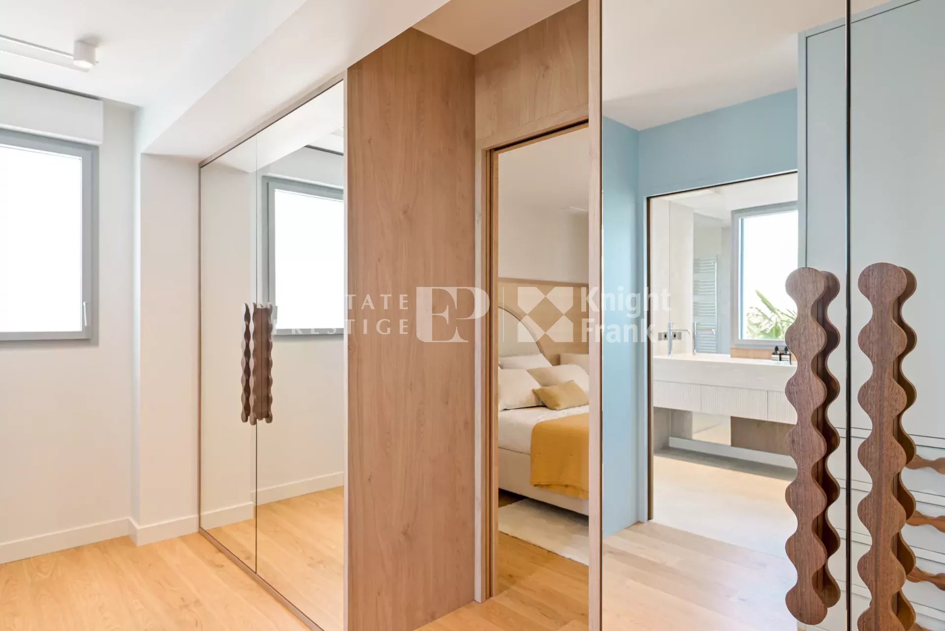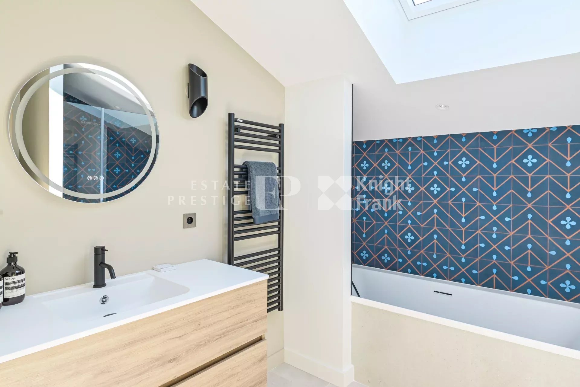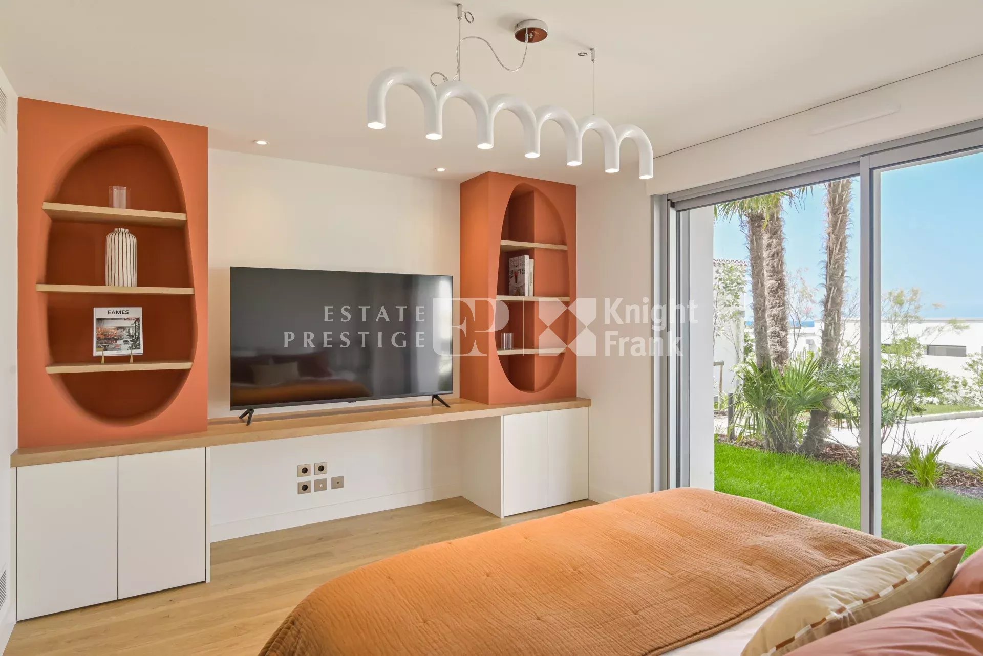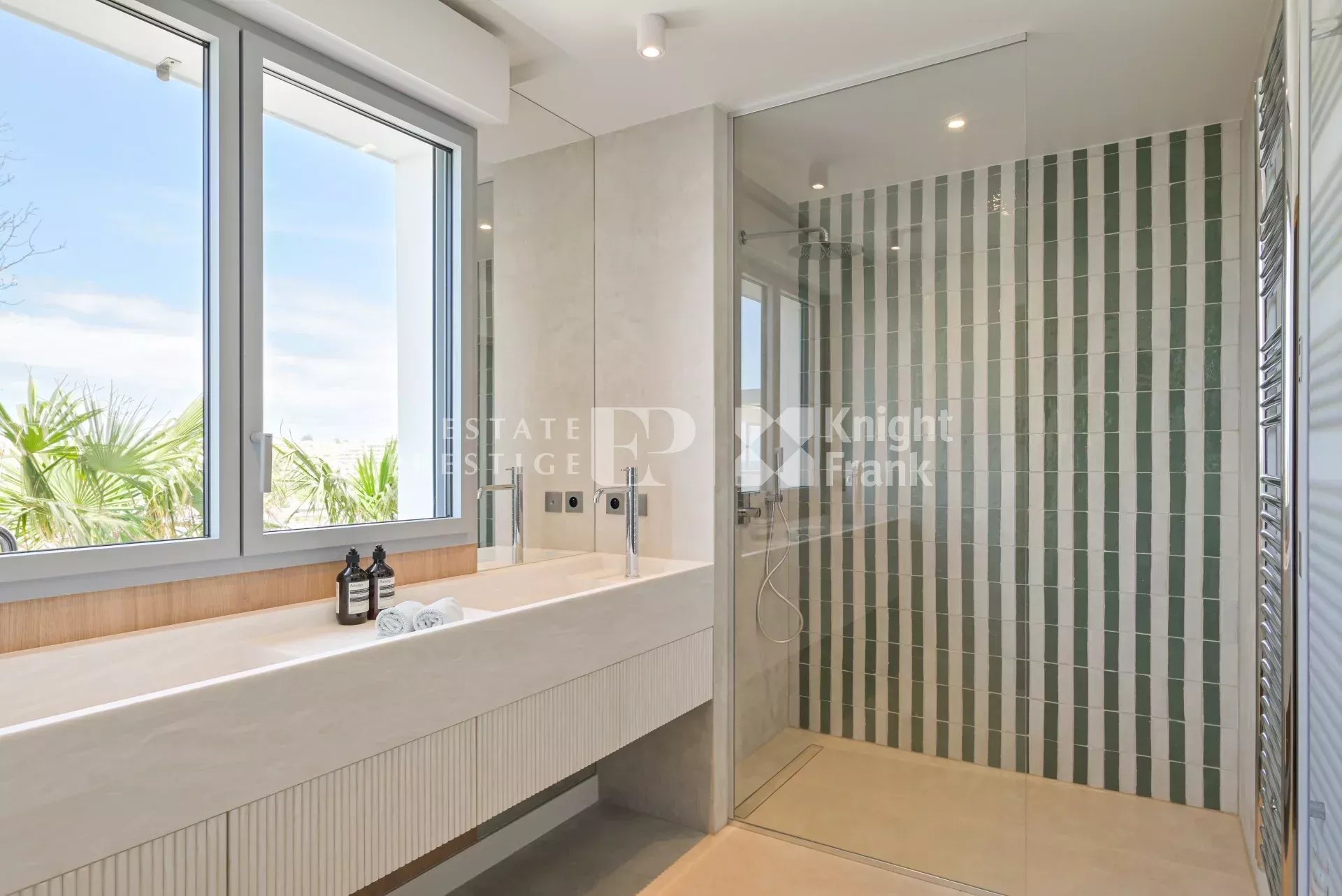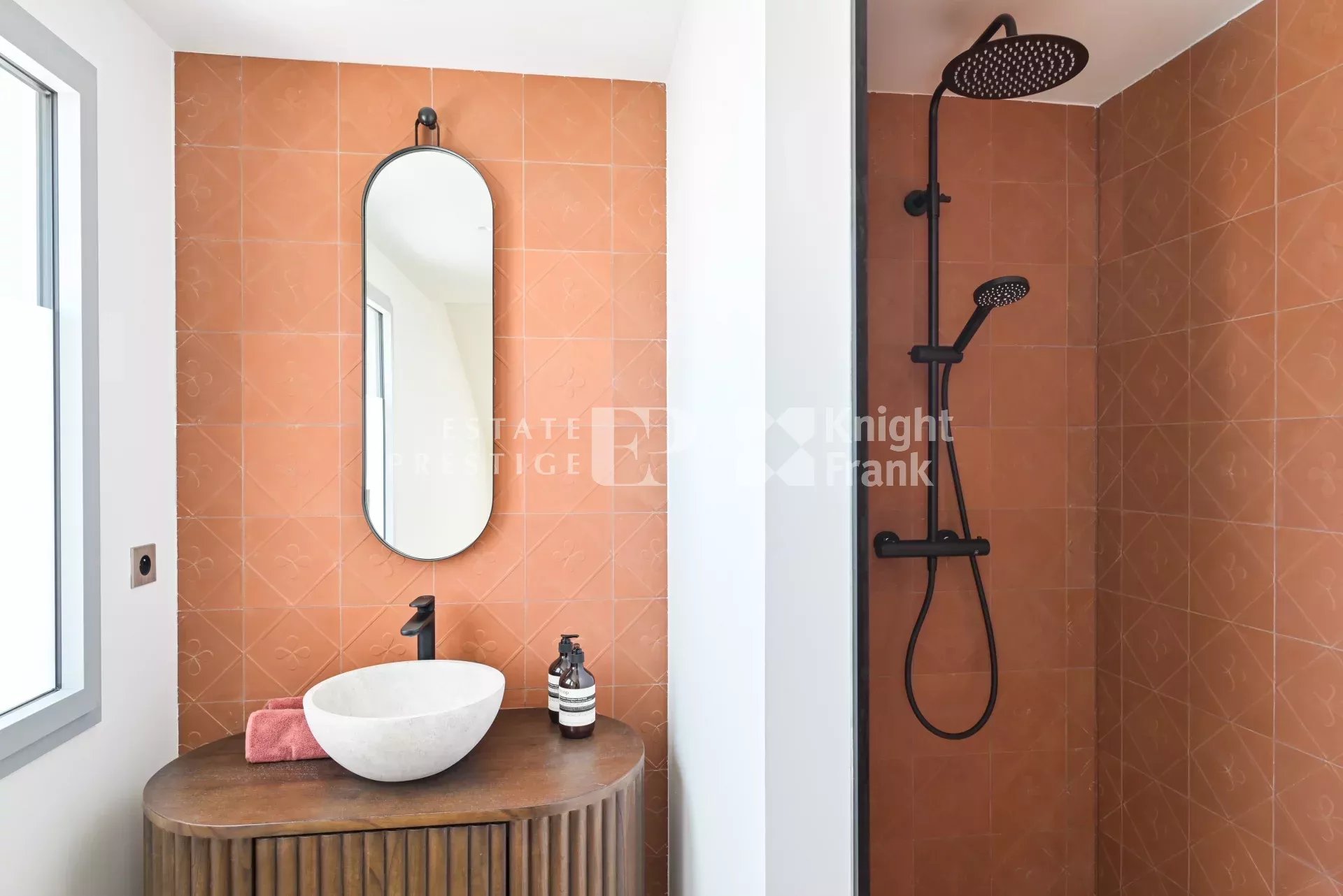 La villa offre cinq suites, toutes avec salle d’eau privative, garantissant intimité et confort à chacun. Chaque chambre bénéficie d’une orientation optimale, avec parfois une échappée sur la mer ou sur le jardin arboré. L’ensemble est complété par un bureau, une cave à vin et une salle de cinéma. Un garage vient compléter les prestations de cette villa où chaque détail a été soigné.