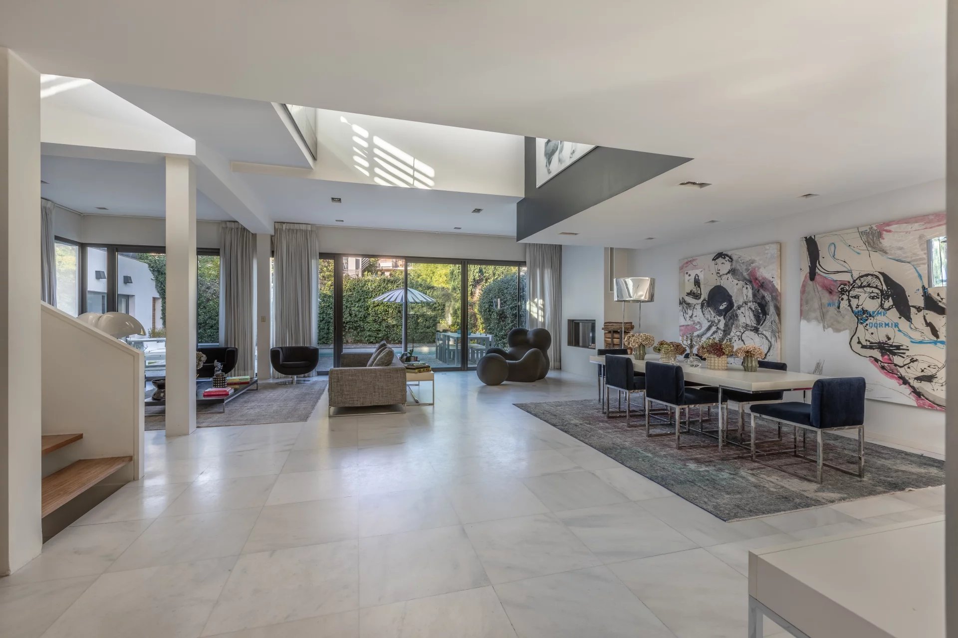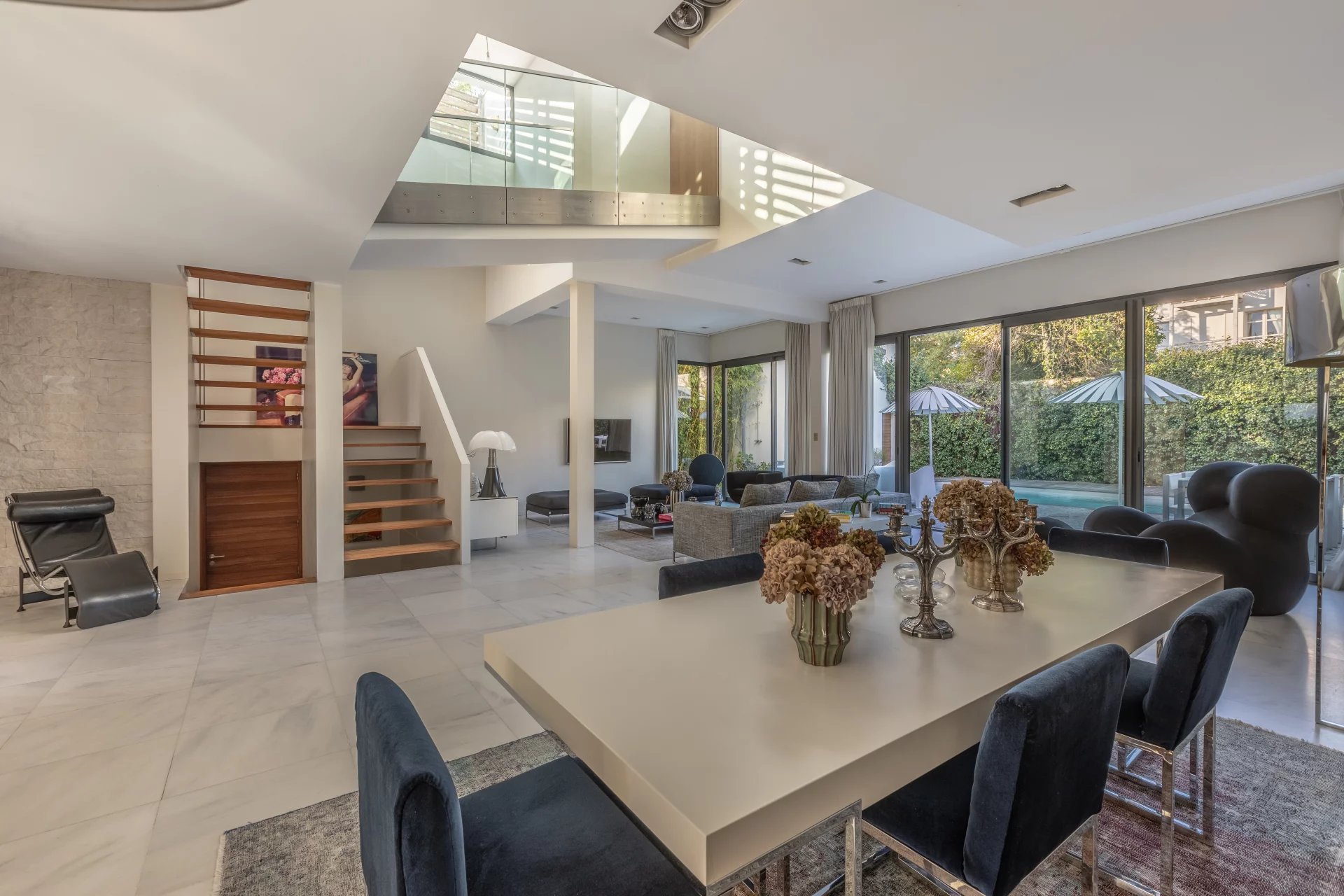 Le rez-de-chaussée comprend une entrée, un séjour avec cheminée, une salle à manger et une cuisine dinatoire semi-ouverte ouvrant sur une terrasse avec piscine chauffée et pool house.