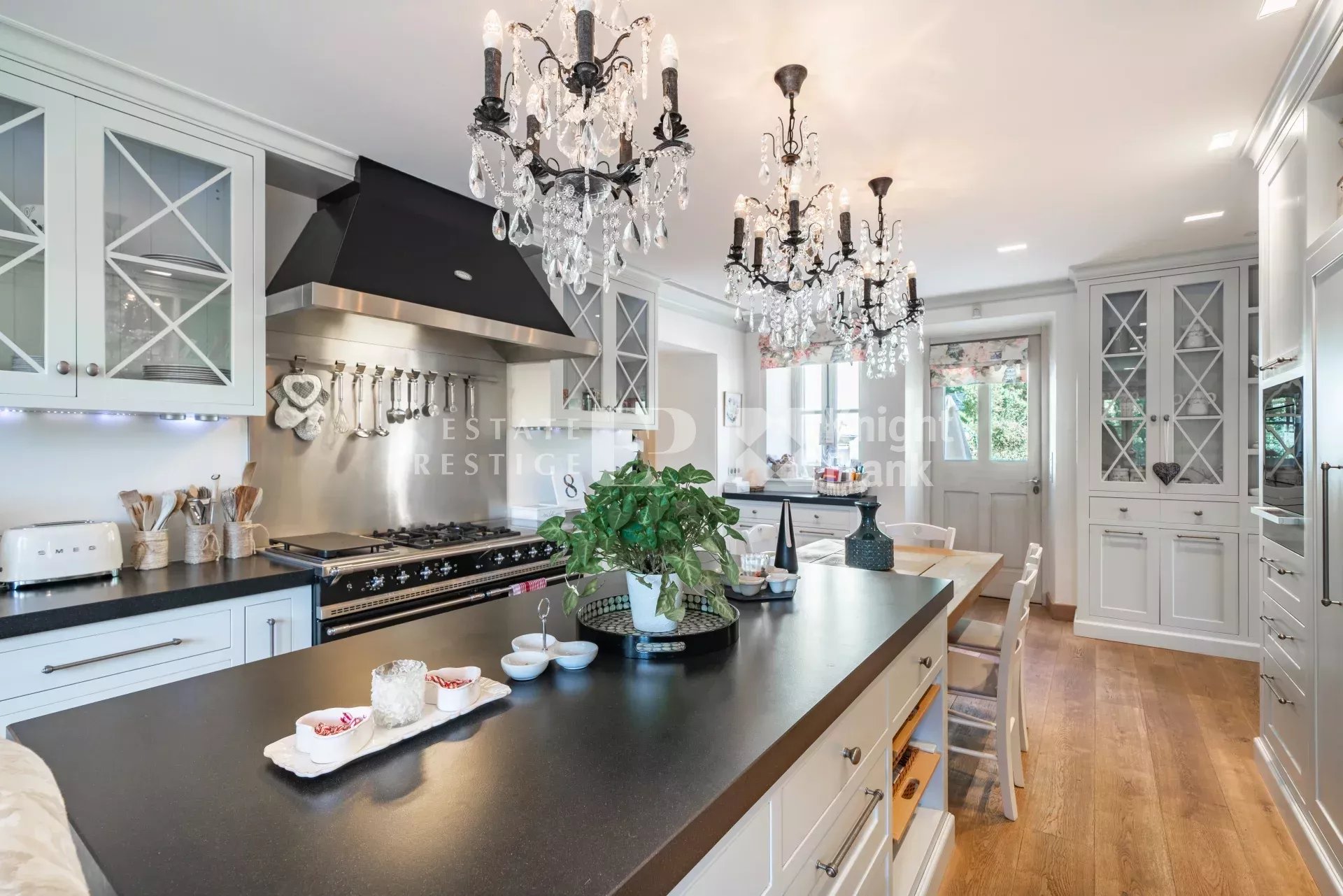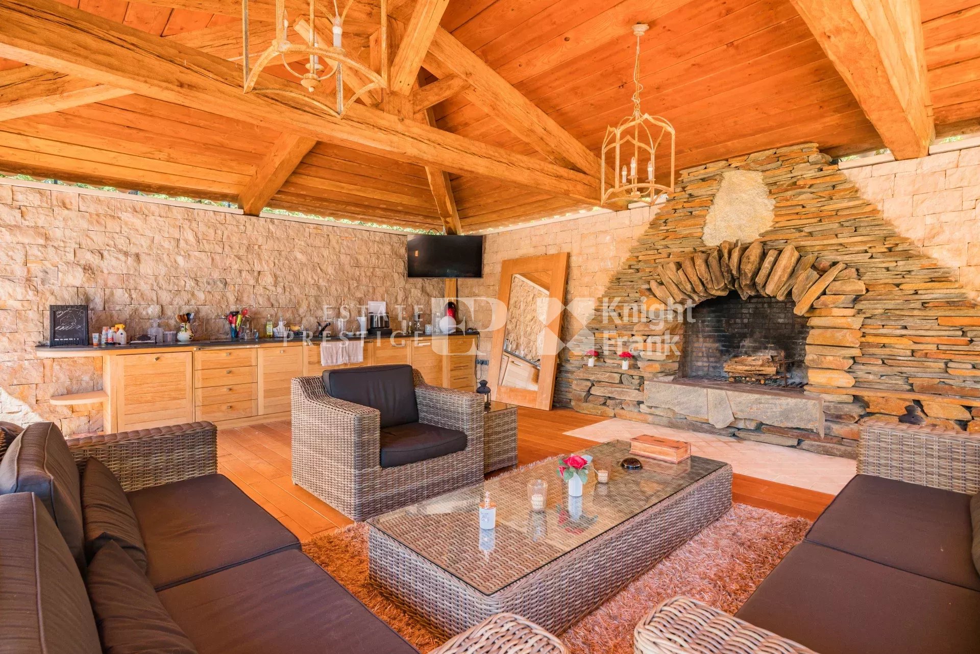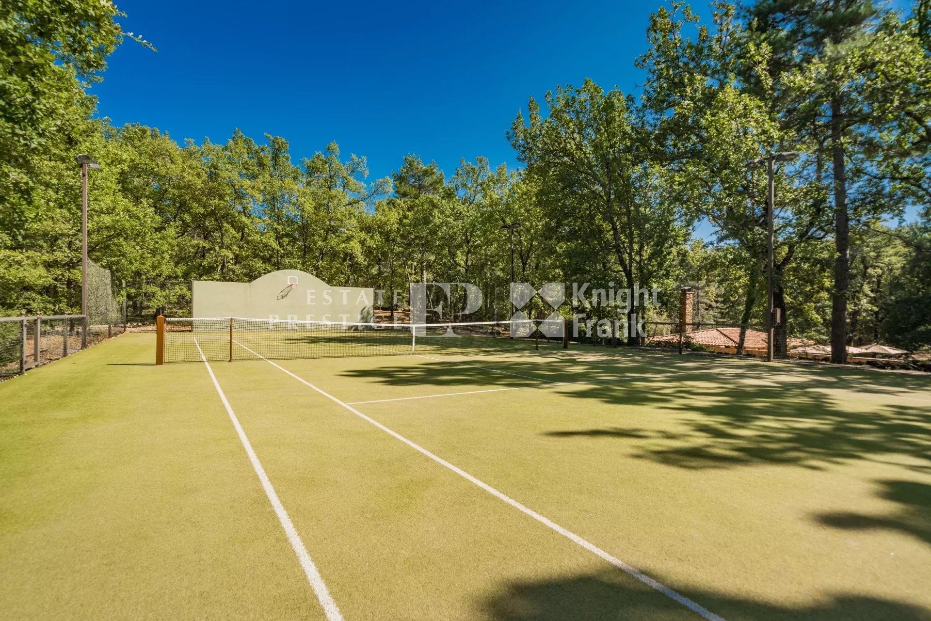 Le domaine dispose d’un terrain de tennis professionnel de grande taille, d’écuries et d’espaces clos pour les chevaux, d’une vaste forêt avec des sentiers de course et de nombreux endroits cachés qui attendent d’être découverts. La piscine de 25 mètres est entourée d’un espace de divertissement remarquable qui comprend une cuisine d’été couverte et un salon avec une cheminée en pierre, un espace repas en plein air, un bar, une baignoire en bois extérieure, un sauna en pierre finlandais, une terrasse et, à côté, une aire de jeux pour enfants.