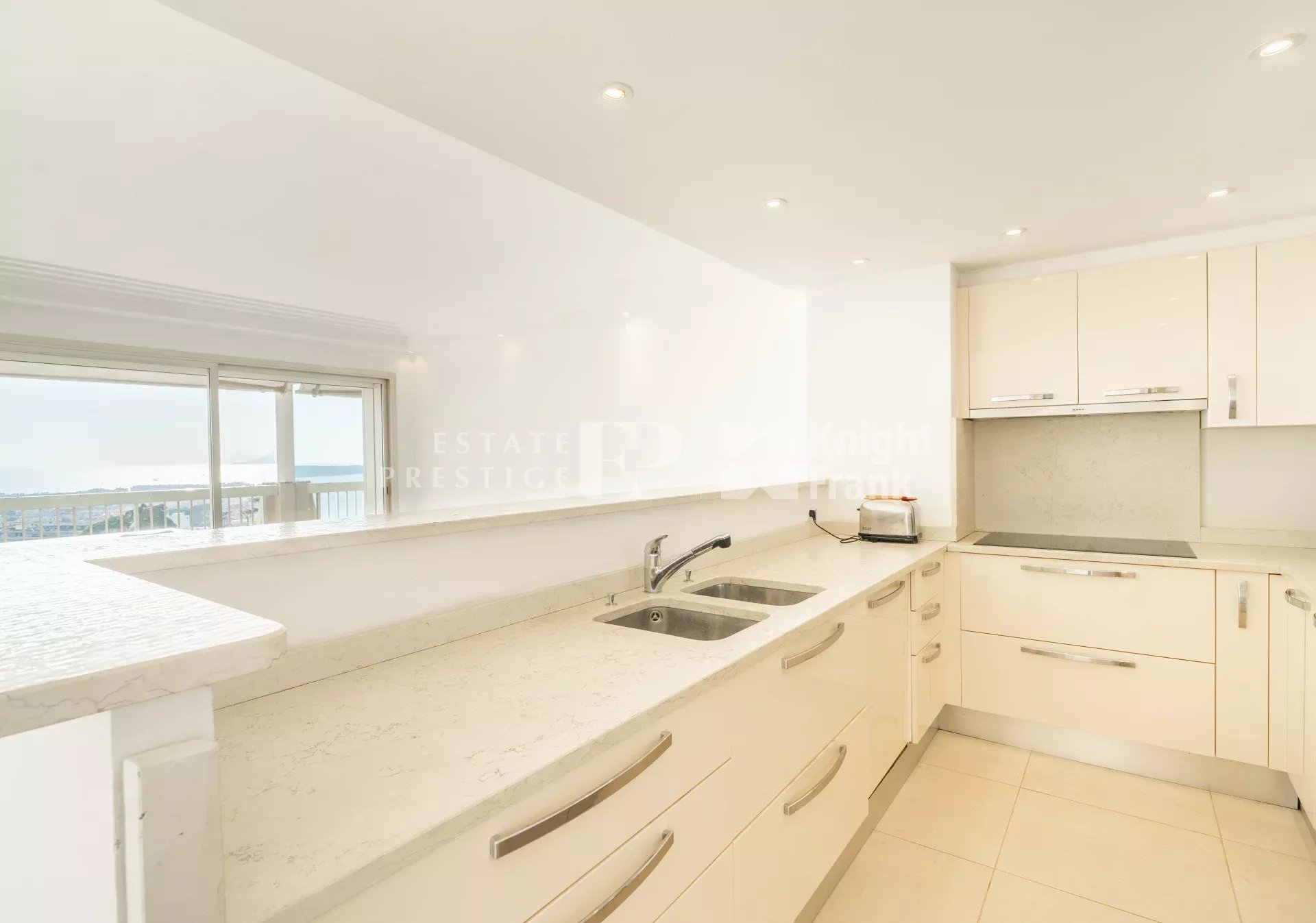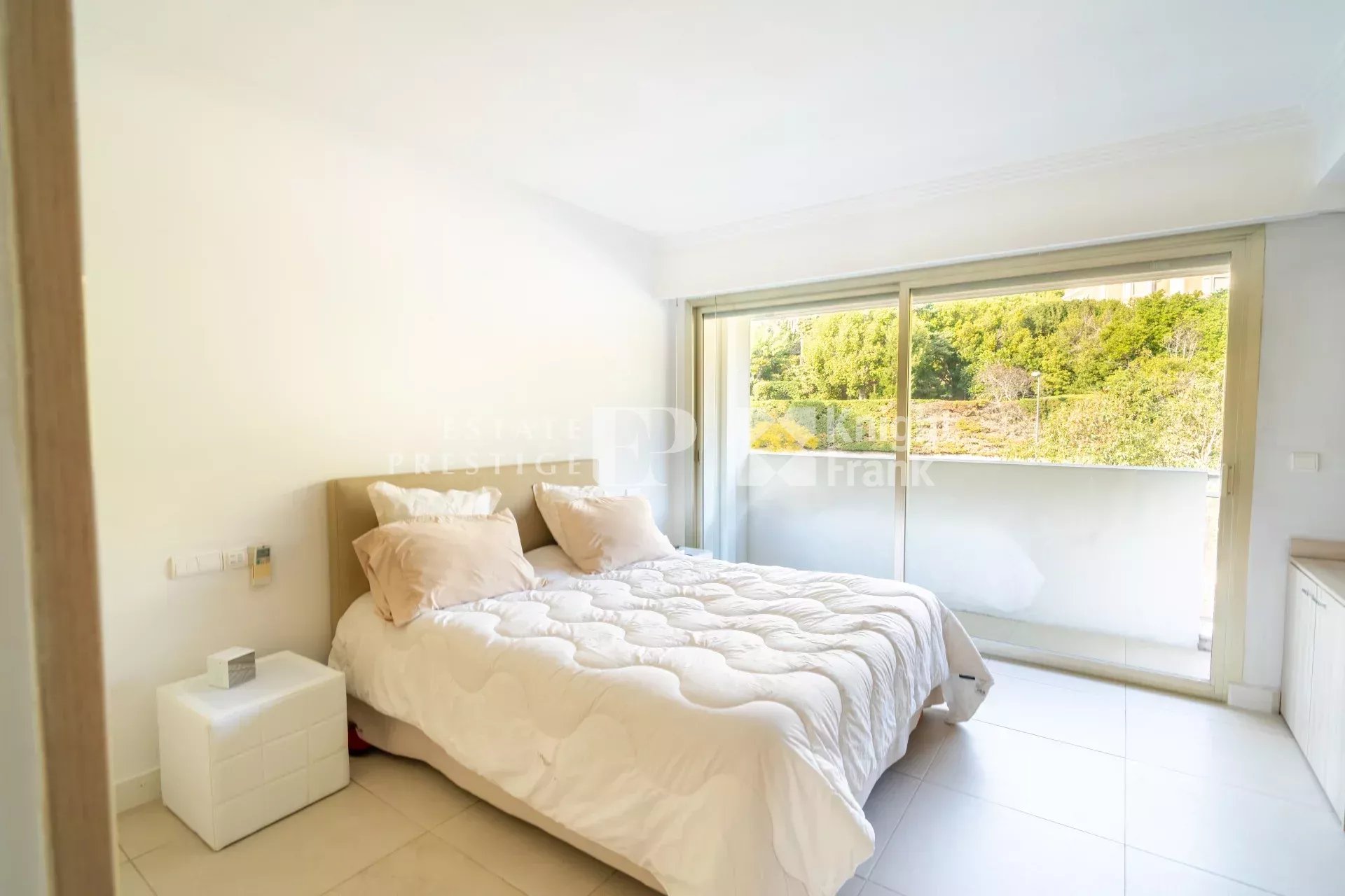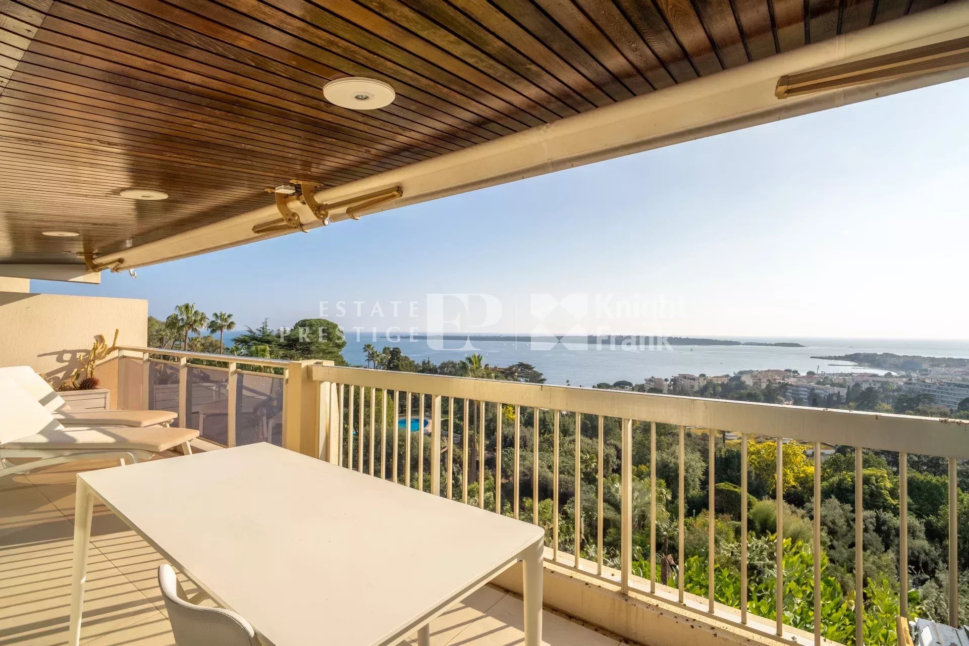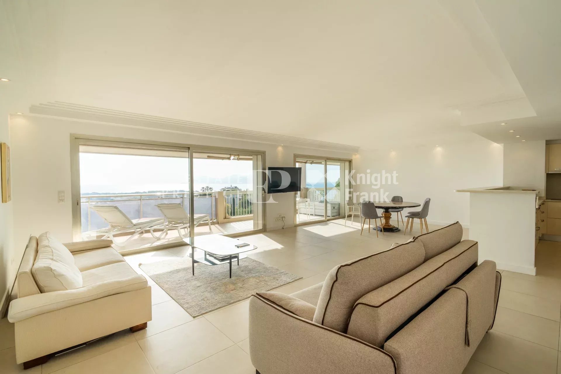 Situé au sein d'une résidence de luxe sécurisée avec parc, piscine et tennis , ce spacieux trois pièces en dernier étage offre une vue mer panoramique des iles de Lerins au massif de l'Esterel.