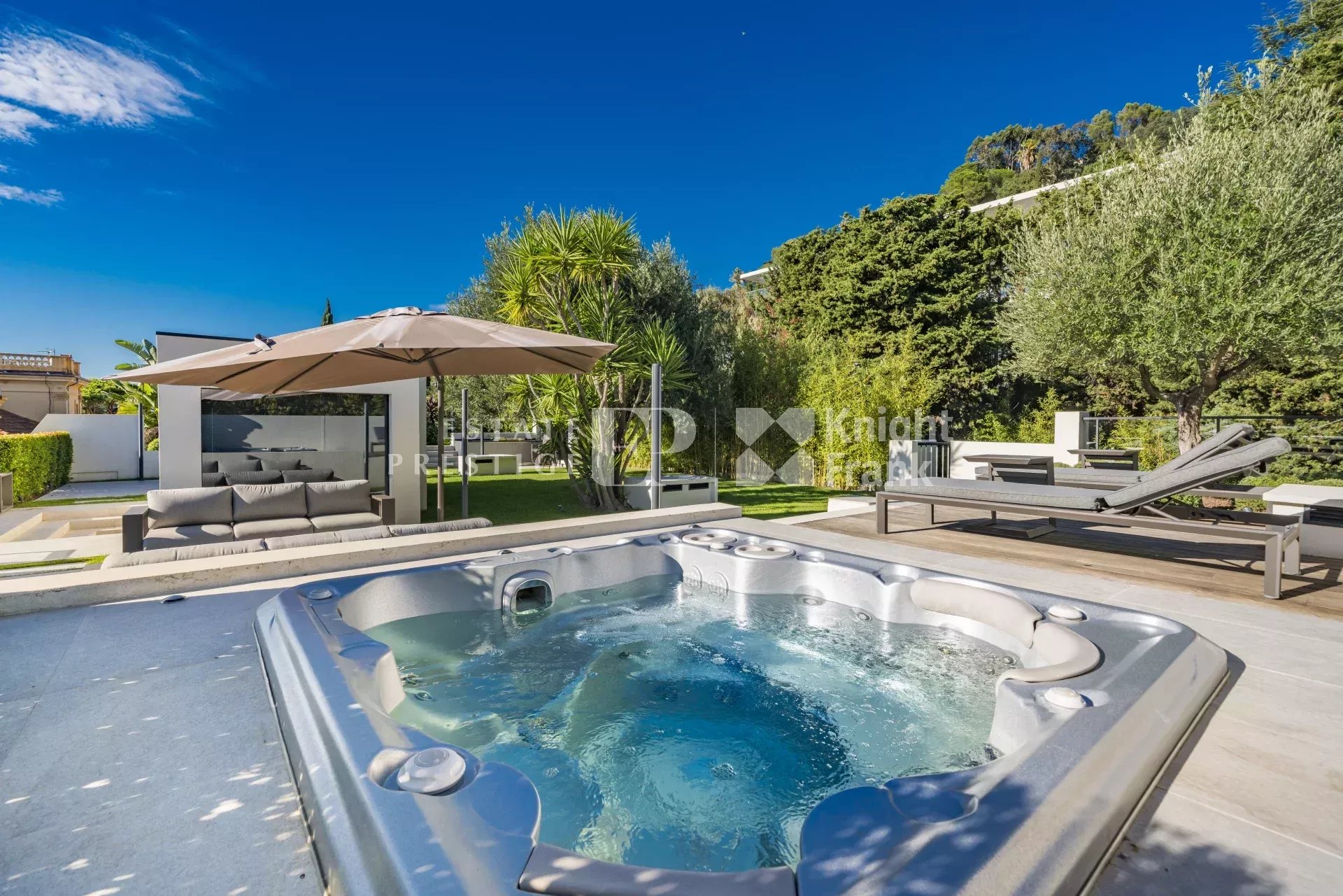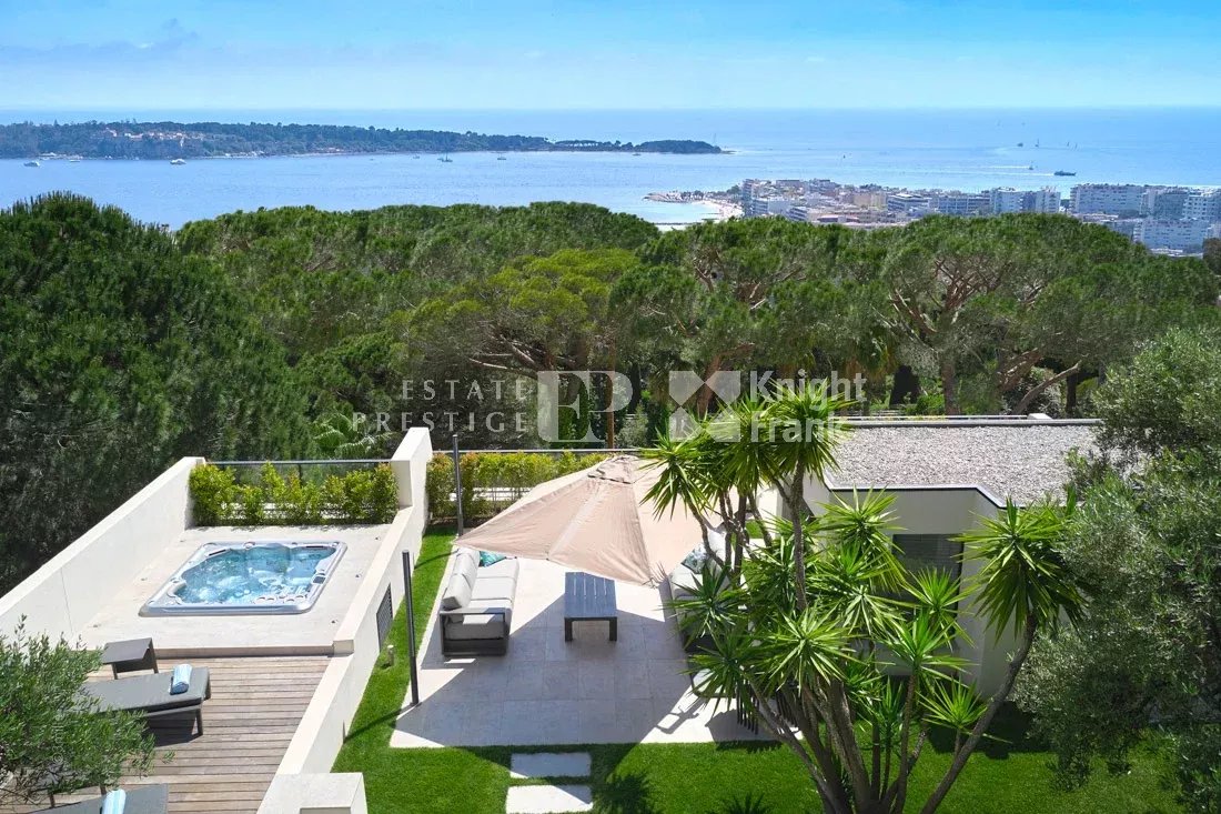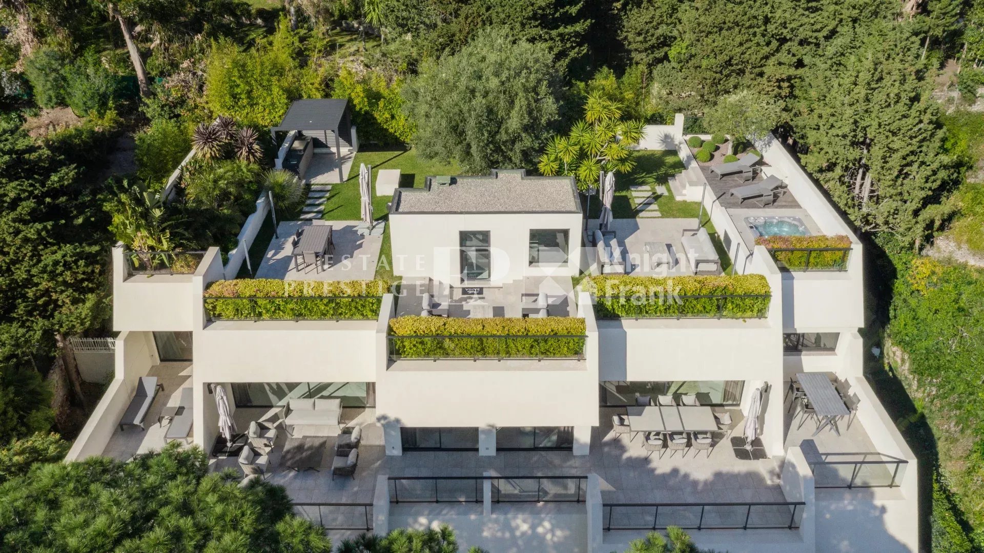 Exposé plein sud, il jouit d’une jolie vue sur la Méditerranée et s’ouvre sur une vaste terrasse d’environ 133 m² et profite d'un jardin sur le toit d'environ 480 m² superbement aménagé avec cuisine d'été et jacuzzi.
