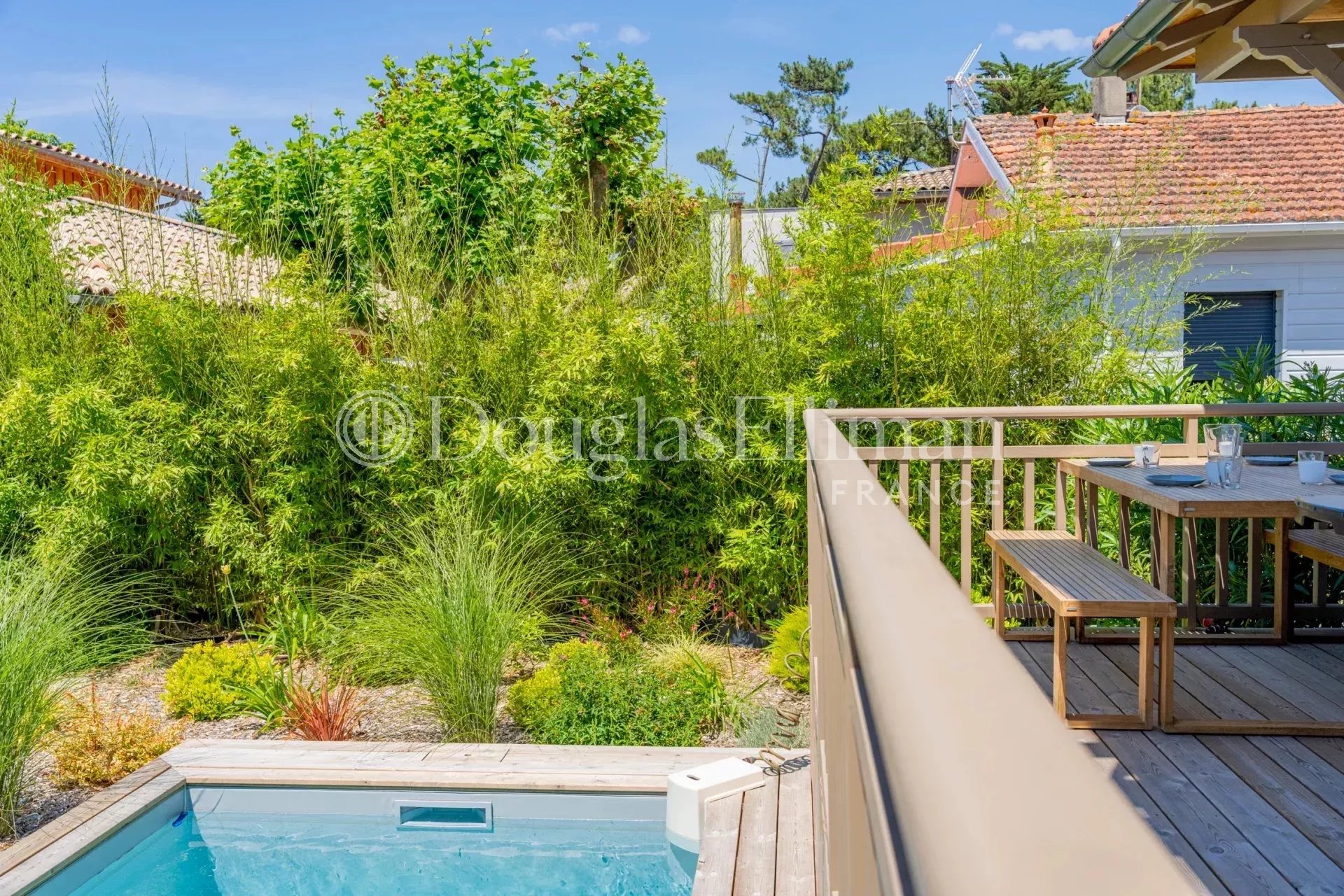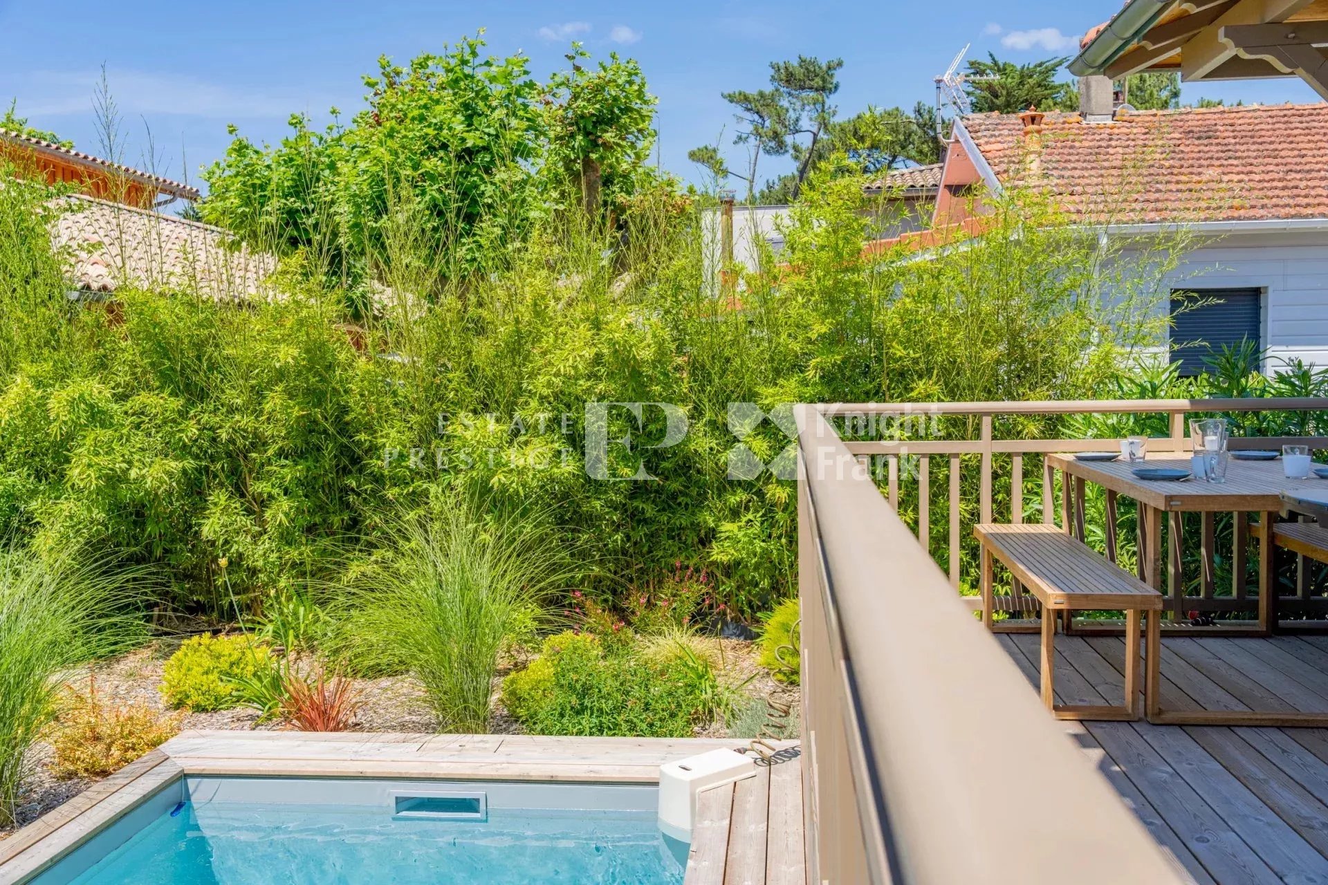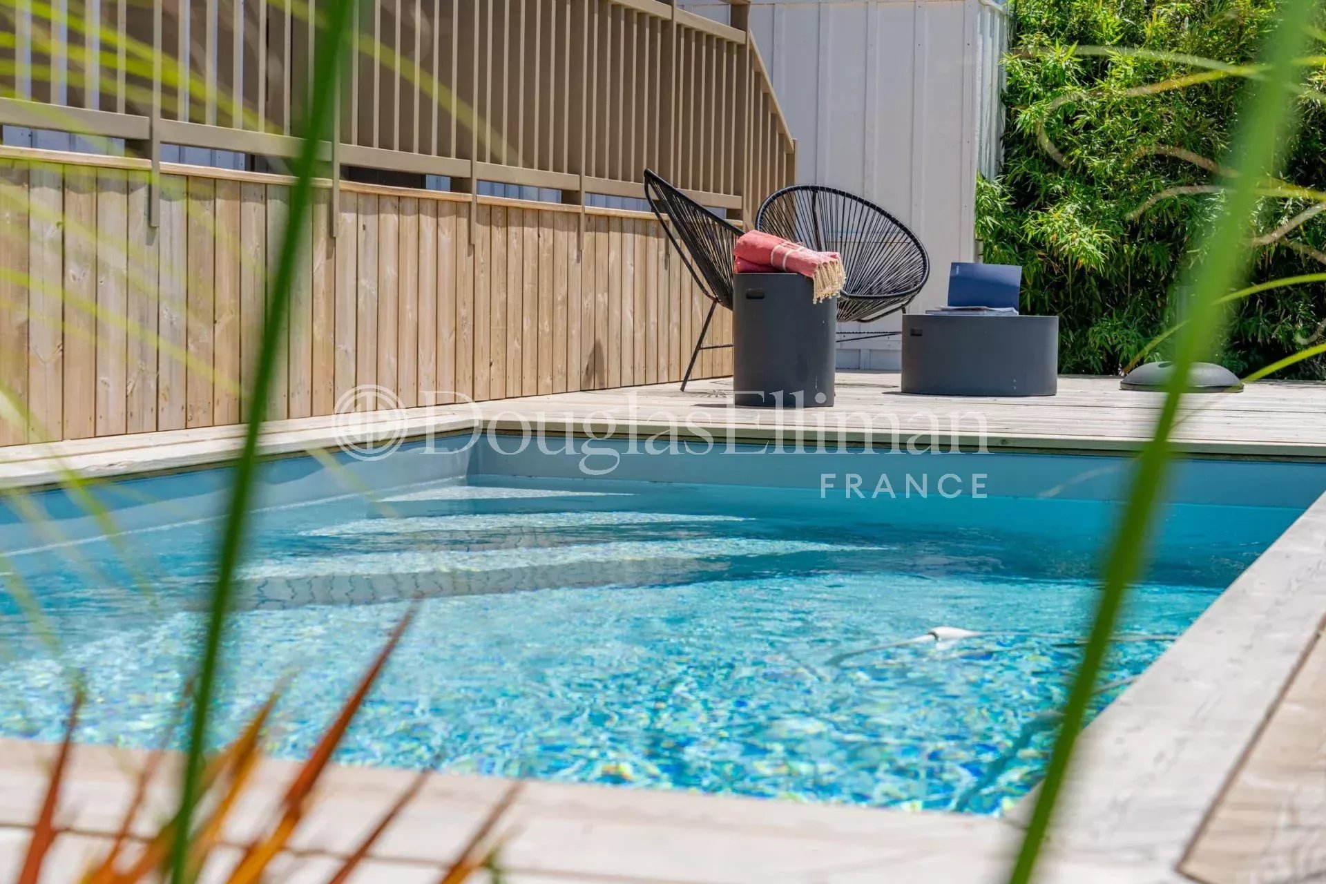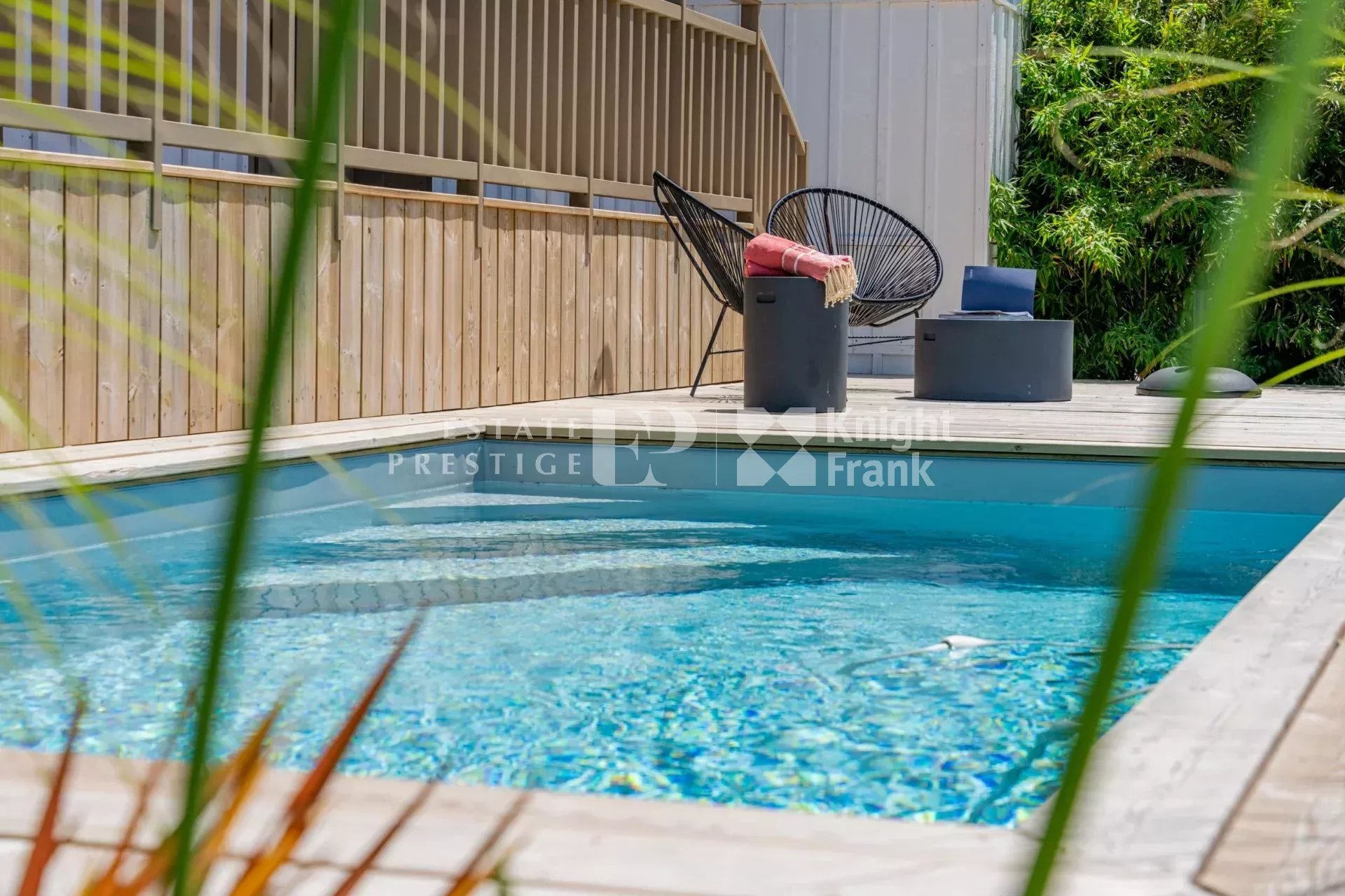 Baignée de lumière grâce à ses grandes ouvertures, la pièce principale s’ouvre sur une terrasse en bois et un jardin paysager. La piscine, chauffée et sécurisée, bénéficie d'une belle exposition sud-ouest.