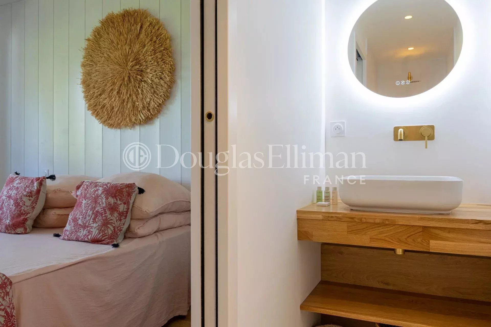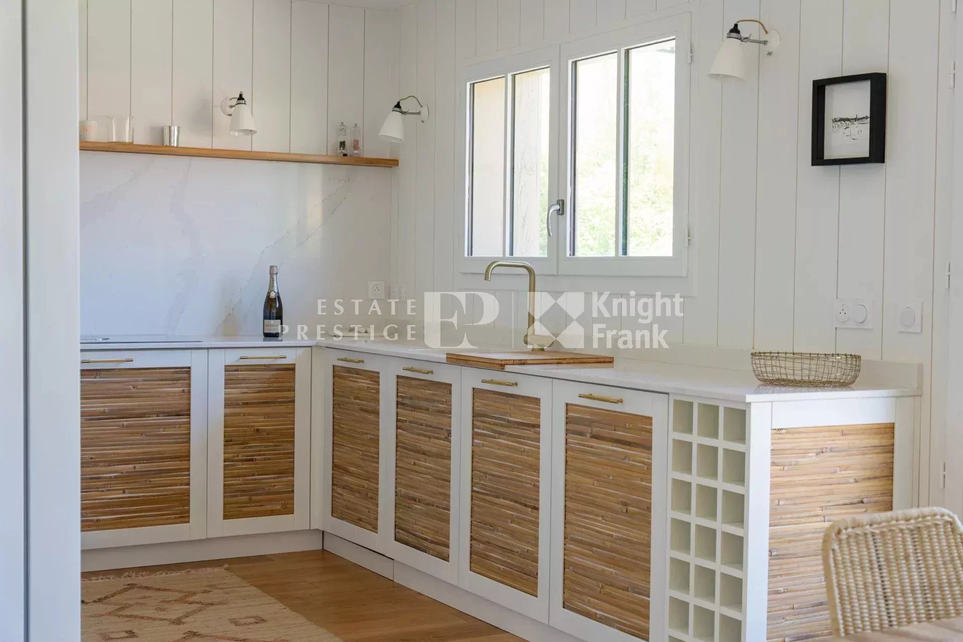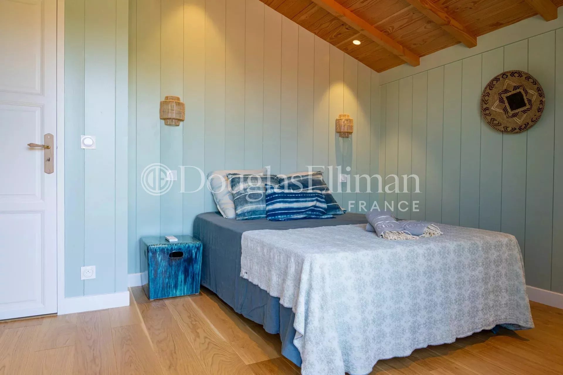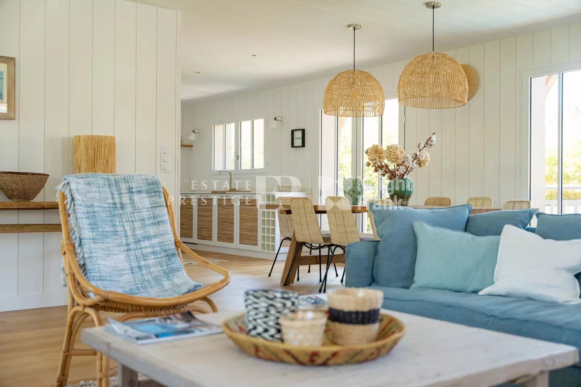 Baignée de lumière grâce à ses grandes ouvertures, la pièce principale s’ouvre sur une terrasse en bois et un jardin paysager. La piscine, chauffée et sécurisée, bénéficie d'une belle exposition sud-ouest.