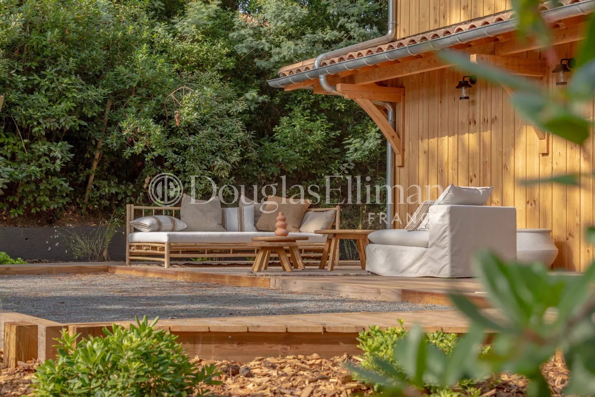 Au rez-de-chaussée, un vaste et élégant séjour avec une cuisine américaine équipée, le tout ouvrant sur deux terrasses pour profiter du soleil, et une piscine chauffée de 10 mètres entourée d'un magnifique jardin arboré et paysagé.
