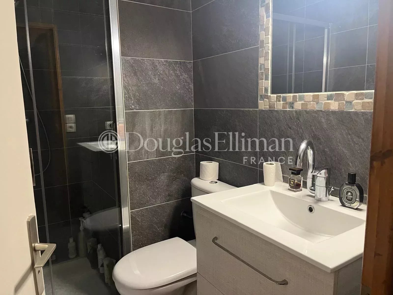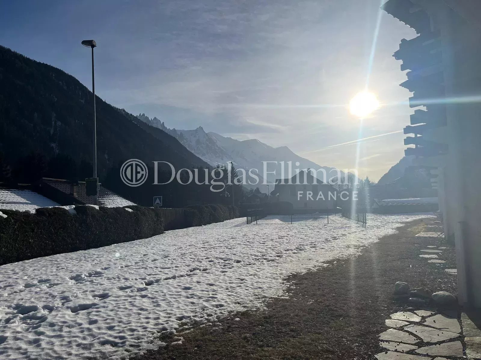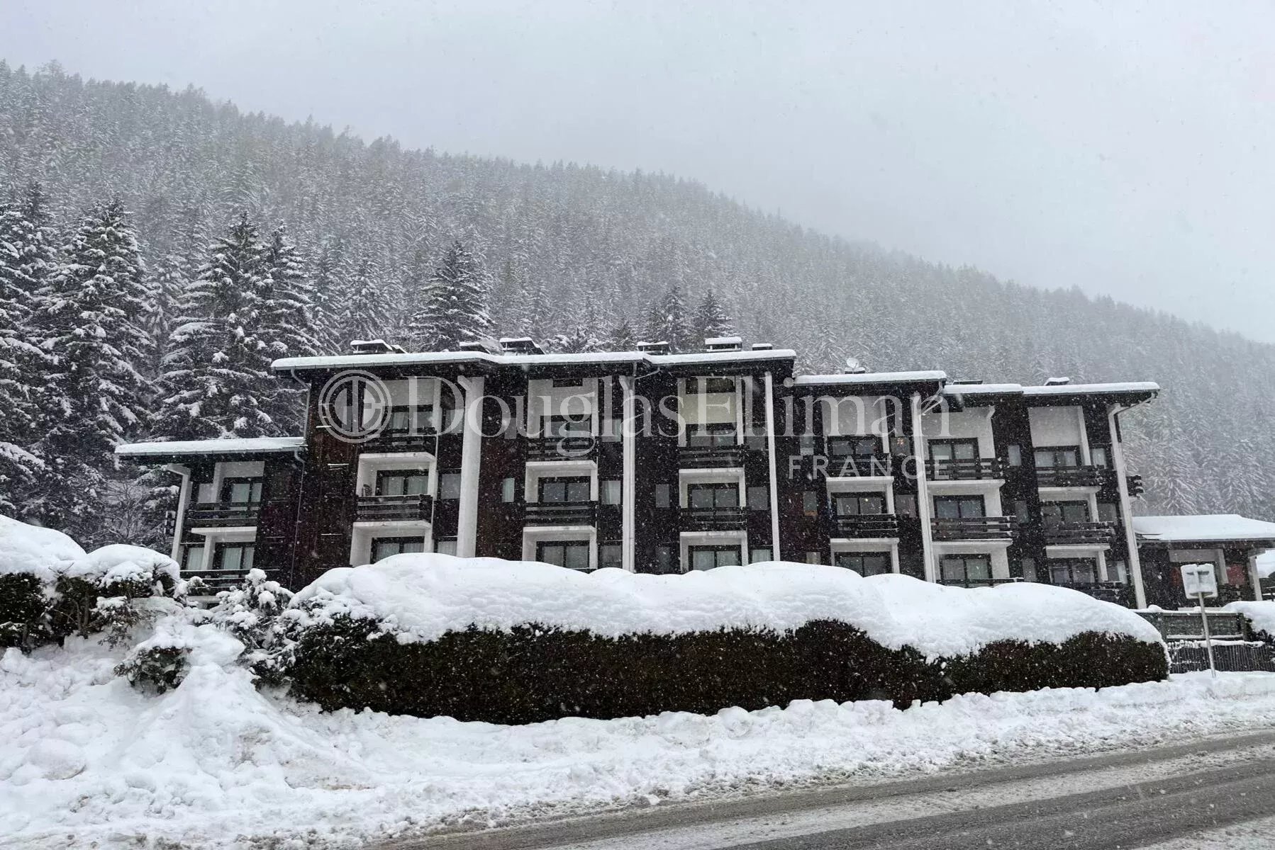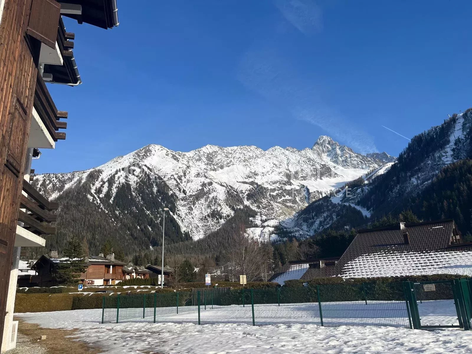 L'appartement offre une vue paisible à l'arrière, donnant sur la forêt. Les jardins et la piscine offrent une vue magnifique sur les sommets, notamment le Mont Blanc, l'Aiguille du Midi et les Grands Montets. Il est équipé d'un casier à skis et d'une cave de rangement, ainsi que d'un parking commun.