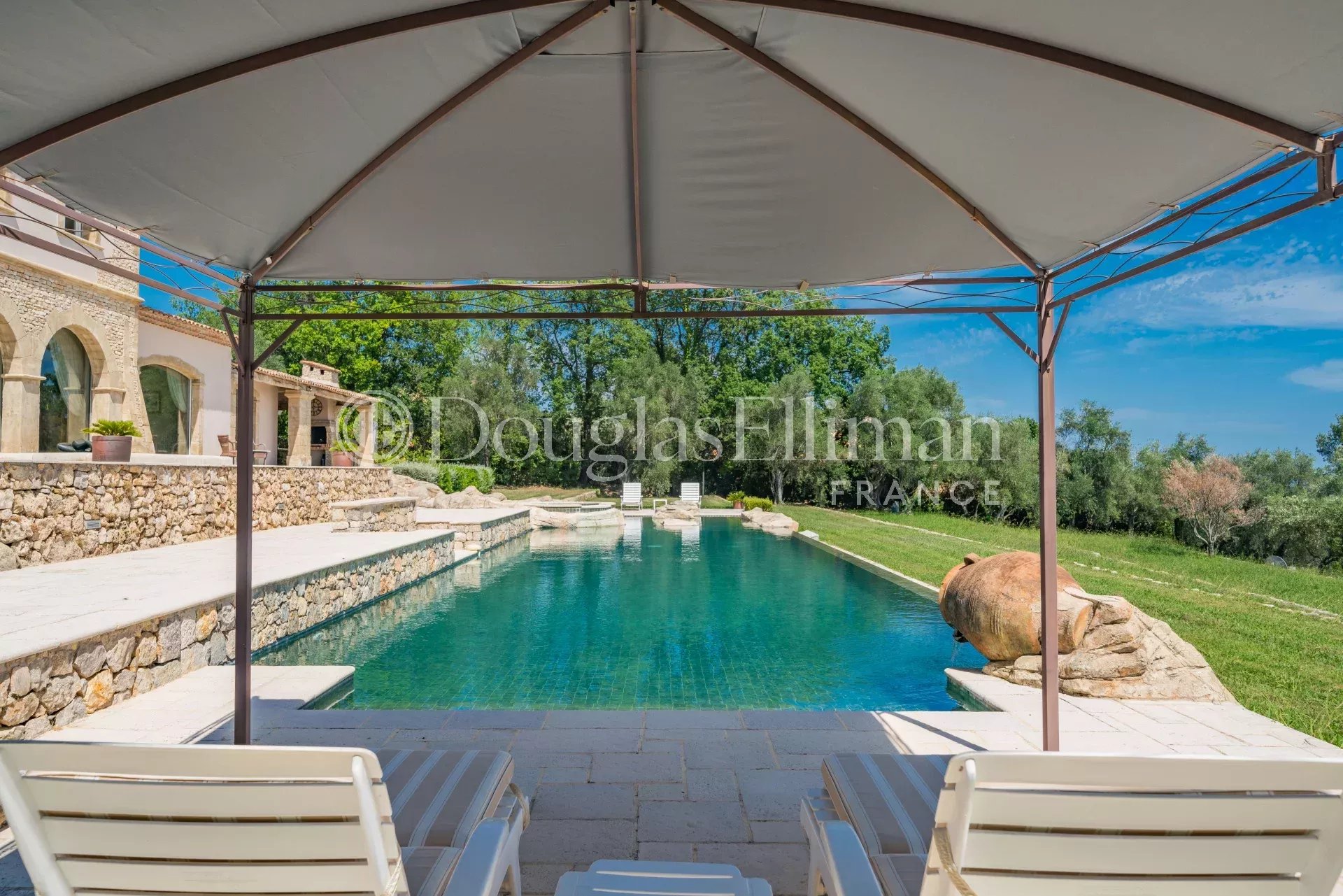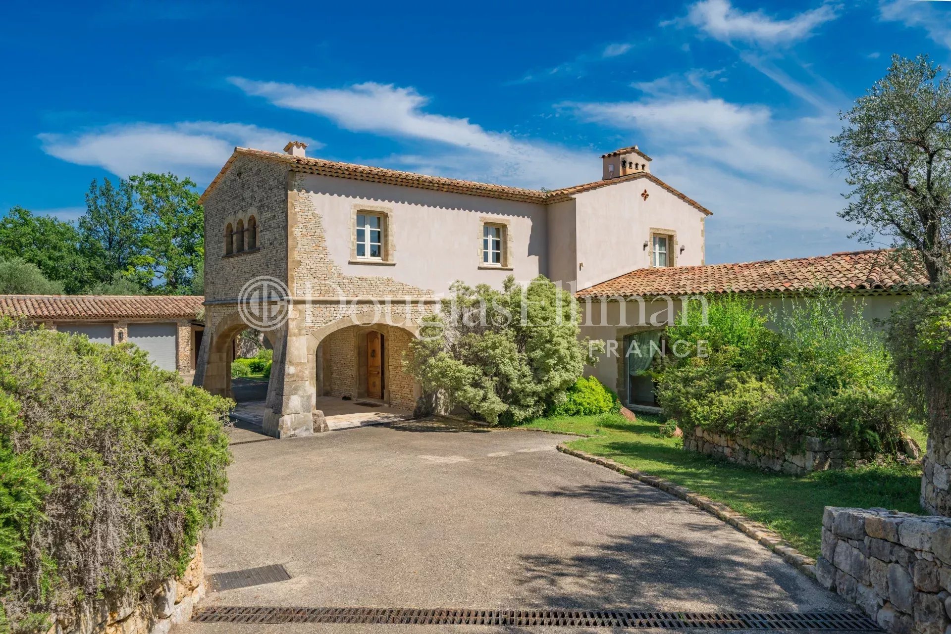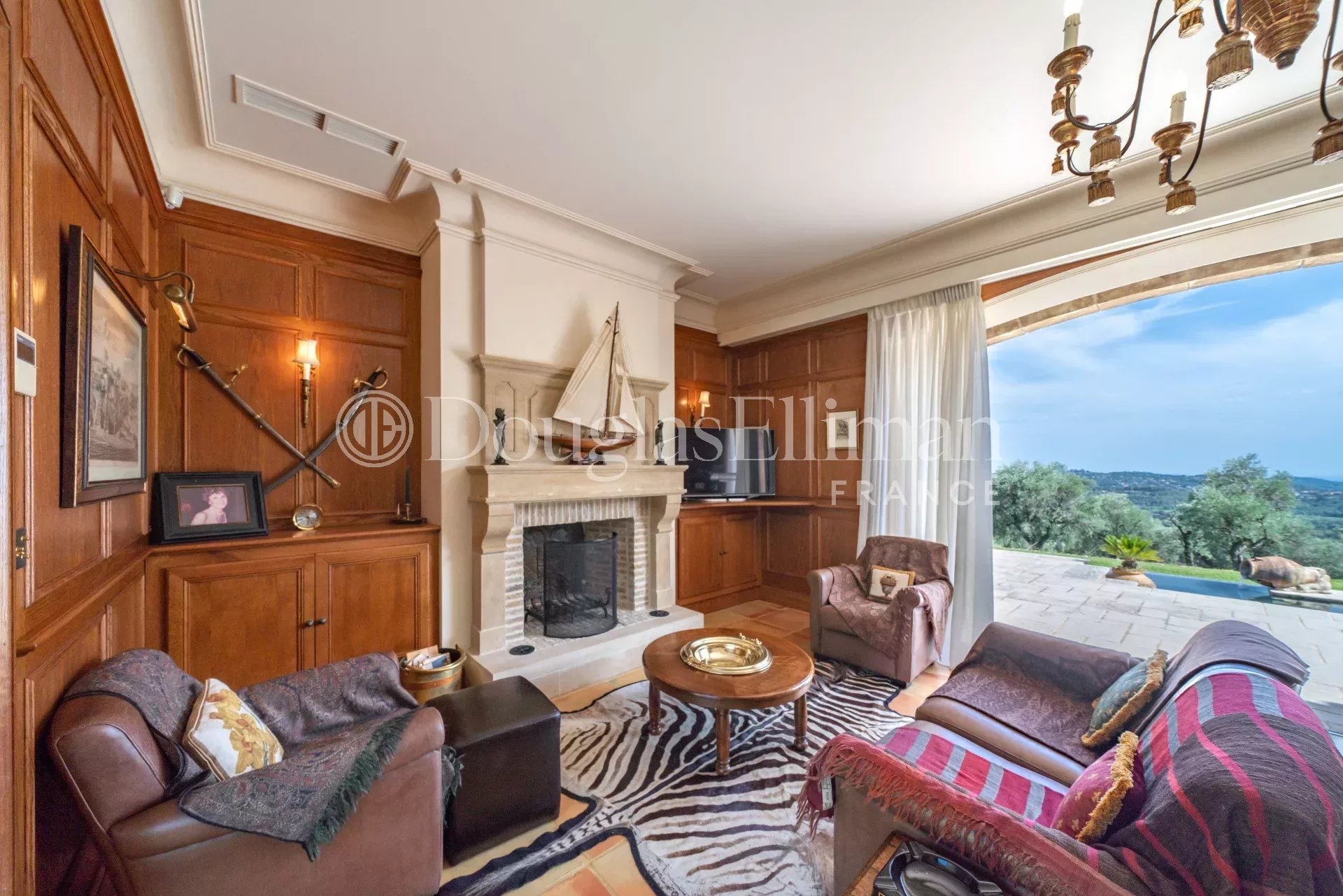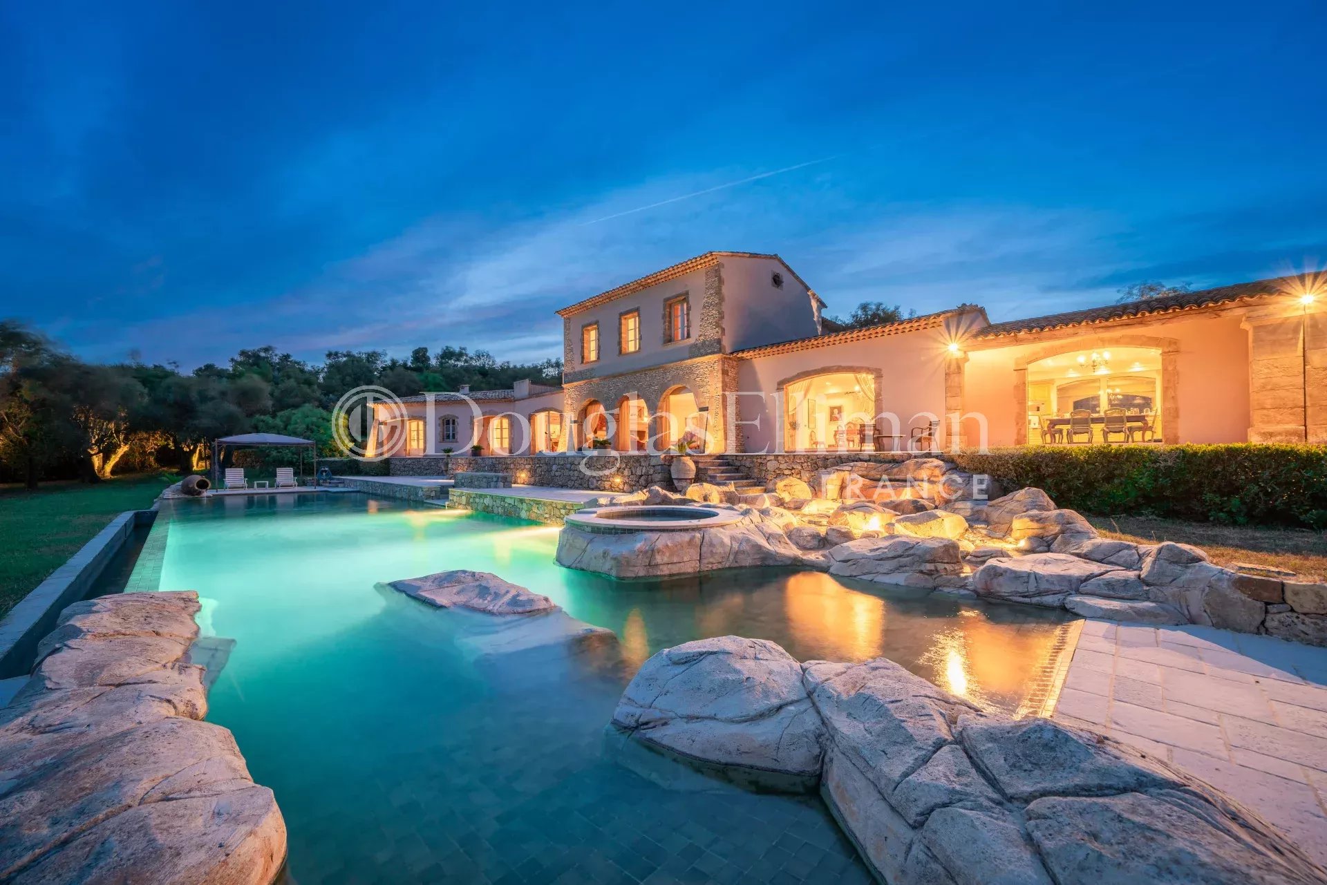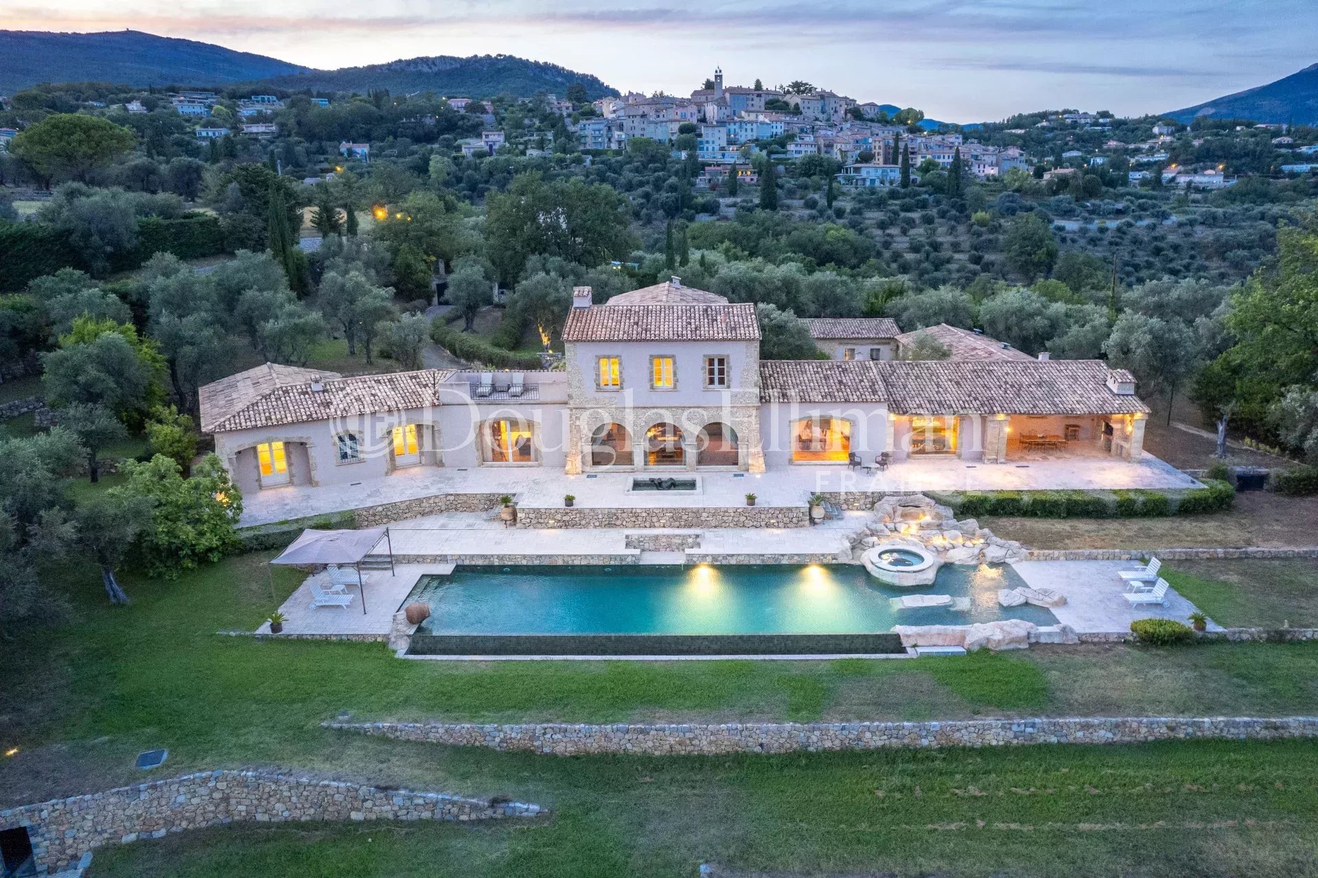 Cette propriété récemment construite offre un cadre unique et une qualité exceptionnelle. Situé sur une oliveraie juste au-dessous du village médiéval de Châteauneuf de Grasse, à 20 minutes de Cannes et des plages, elle bénéficie d'une vue sur la mer et la campagne panoramique vraiment spectaculaire ainsi qu'une belle vue sur le village. La propriété se compose d'un hall d'entrée spacieux avec vestiaire, un grand salon avec une cheminée en pierre, salle à manger et cuisine entièrement équipée avec coin repas et accès à la terrasse couverte avec barbecue. Bibliothèque / bureau avec cheminée, 3 suites, toutes avec salles de bains et placards. Master suite avec dressing Madame et dressing Monsieur, grande salle de bains et terrasse privée. Quatrième chambre d'amis avec salle de bains. Cave à vin, salle de jeux, maison de gardien, garage triple, chambres de stockage et une piscine chauffée à débordement de 24 mètres avec jacuzzi et entourée d'une terrasse en pierre. Jardins paysagers par Jean Mus.
