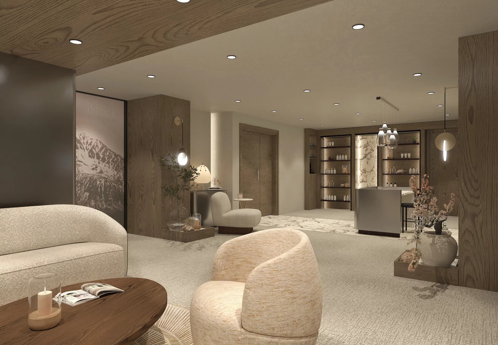 Mobilier haut de gamme disponible en option, à partir de 132 000 € TTC en sus.