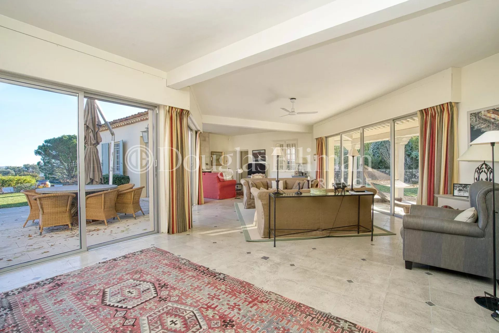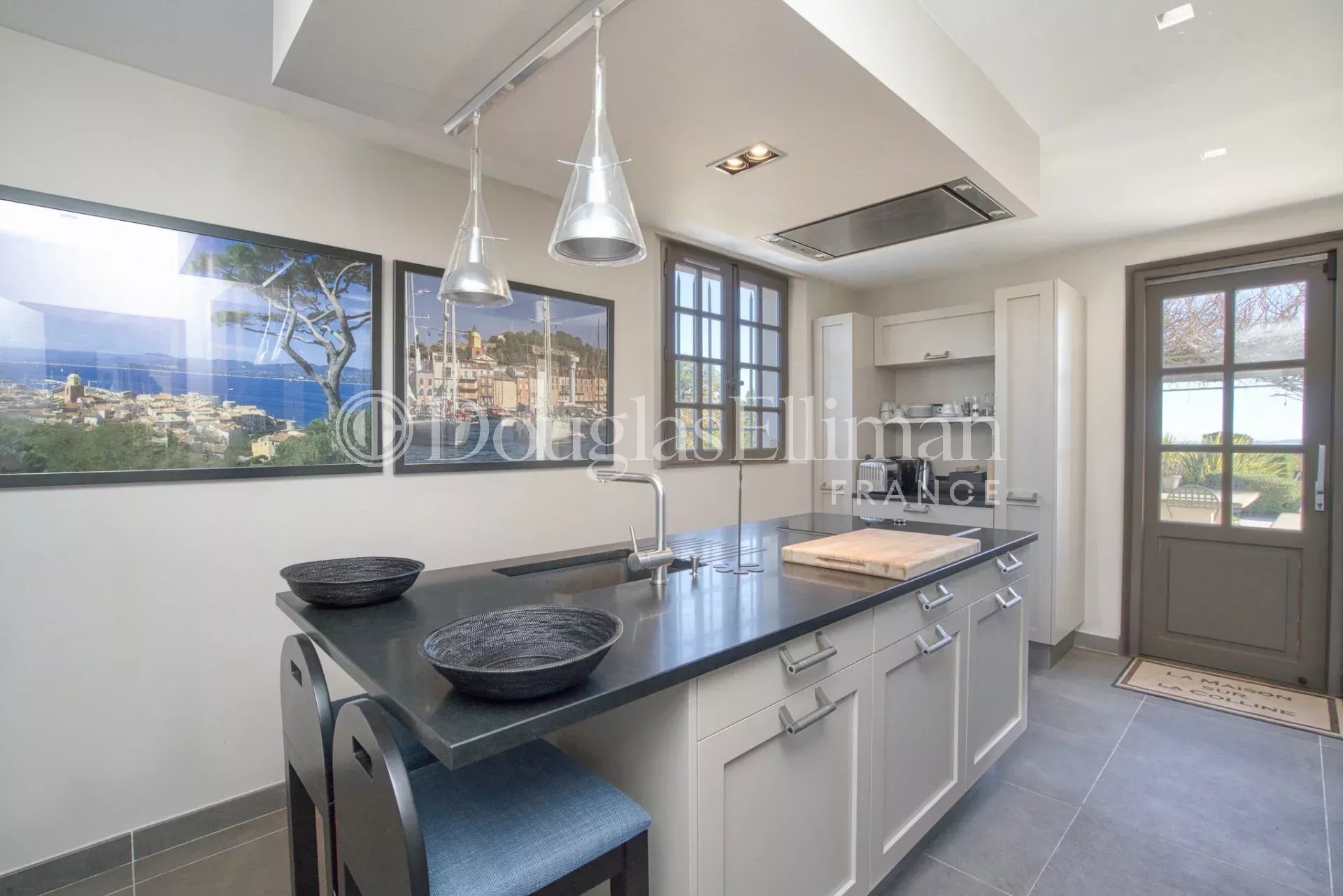 La villa principale offre cinq chambres en suite, ainsi qu’une suite parentale à l’étage avec dressing et terrasse tropézienne, offrant une vue imprenable sur le golfe de Saint-Tropez. Les espaces de vie, lumineux et traversants, comprennent un vaste salon avec cheminée, une salle à manger et une cuisine entièrement équipée ouvrant sur une terrasse ombragée.