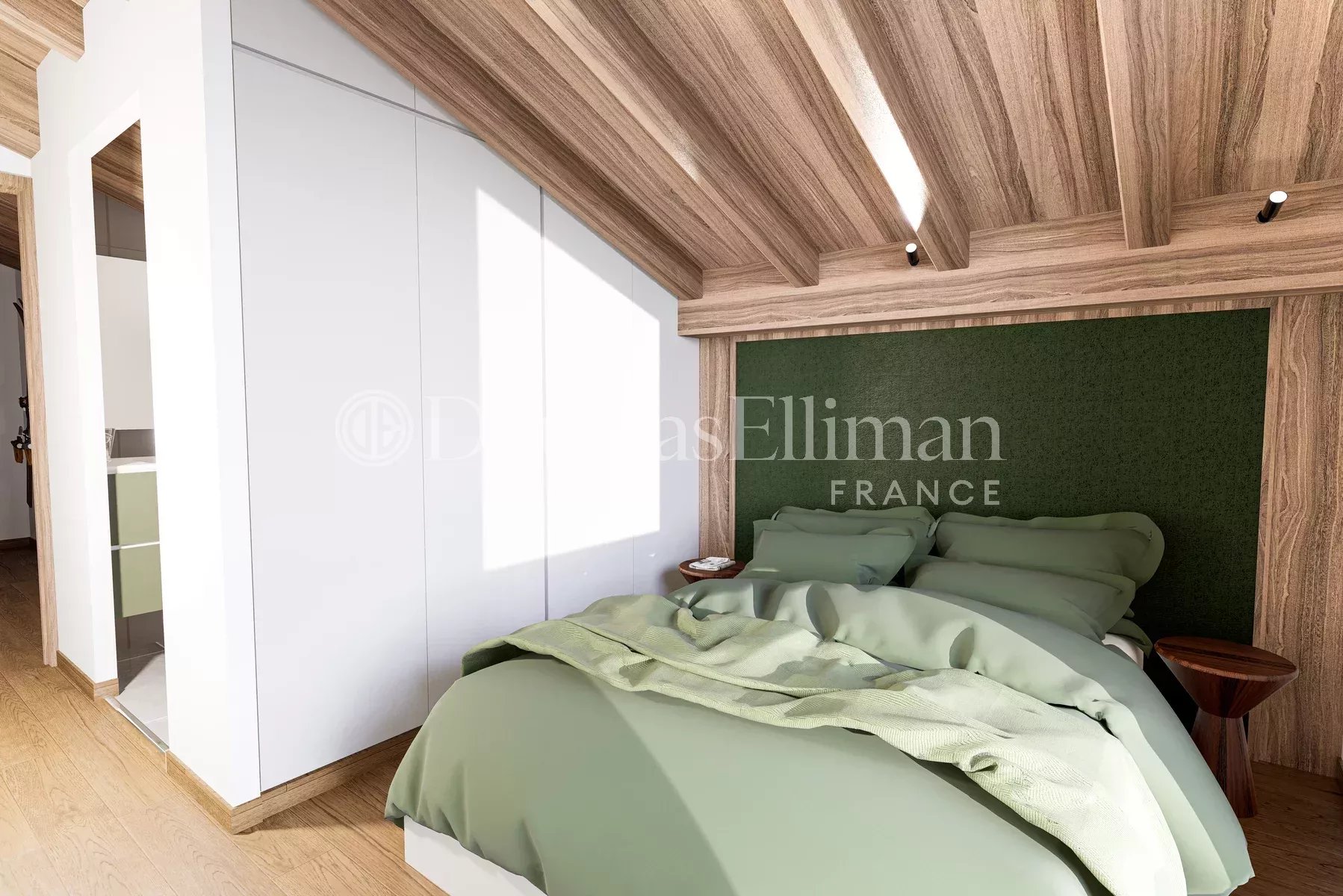 Montloft 4 est un appartement duplex sous charpente apparente, qui occupe tout le dernier étage du bâtiment. Avec un vaste séjour cathédrale et un toit qui semble s'élever, l'appartement dispose de deux grands balcons-terrasses et est vendu entièrement achevé. Possibilité de choix de meubles en supplément sous forme de forfait.