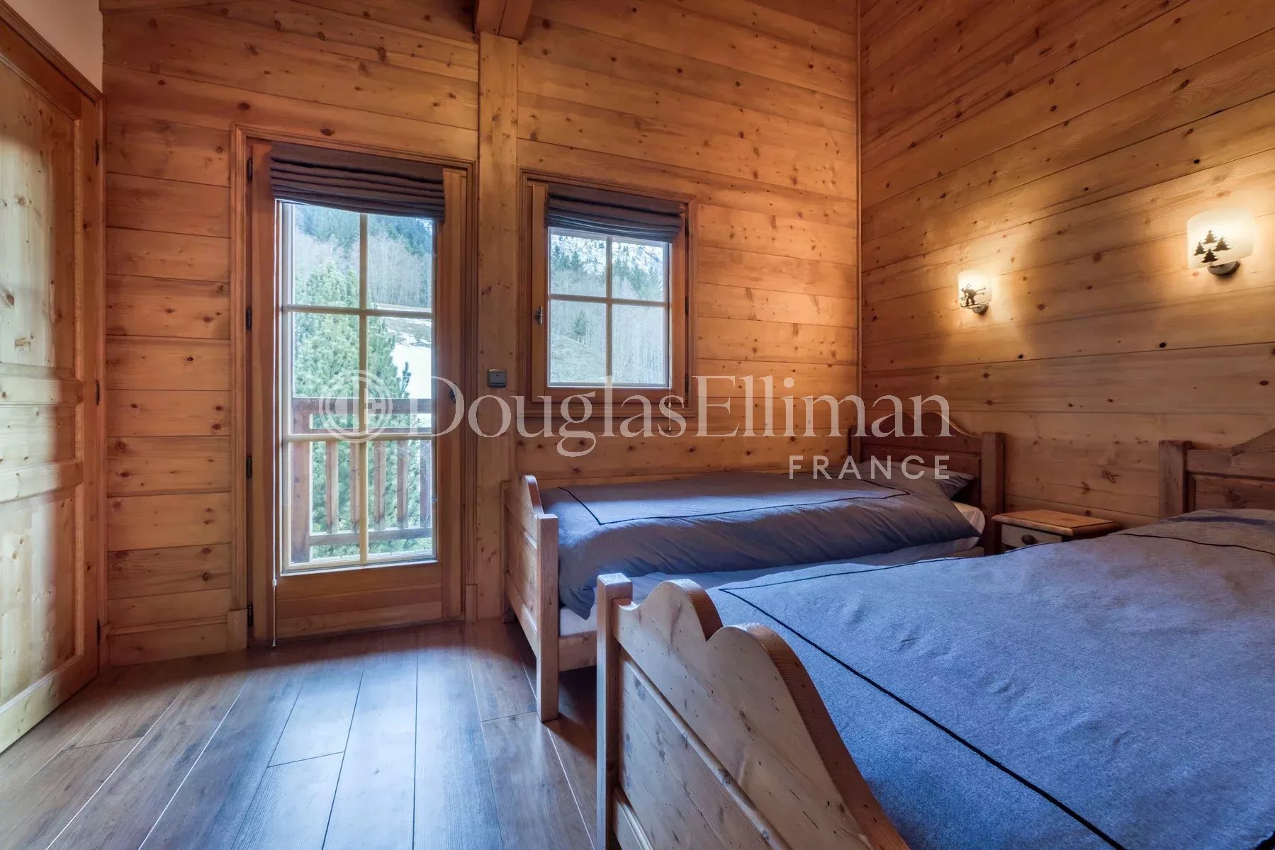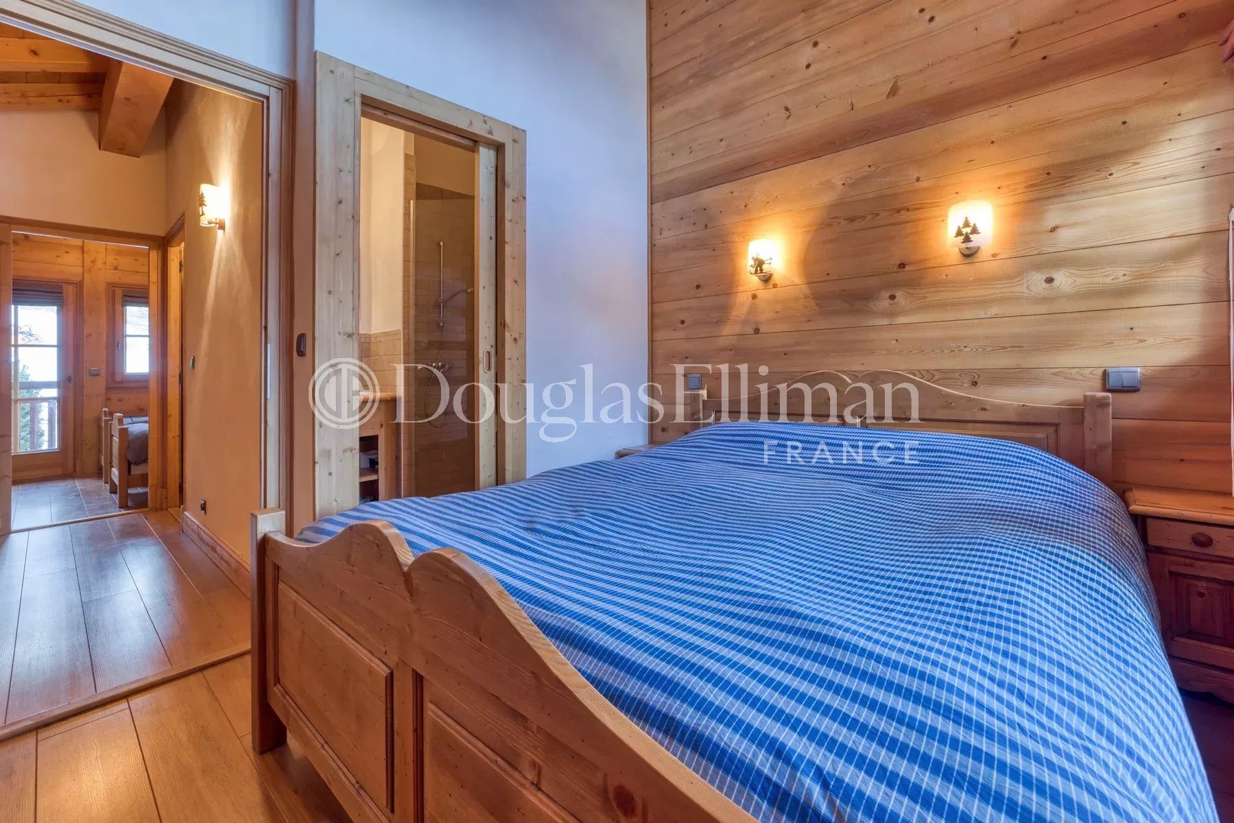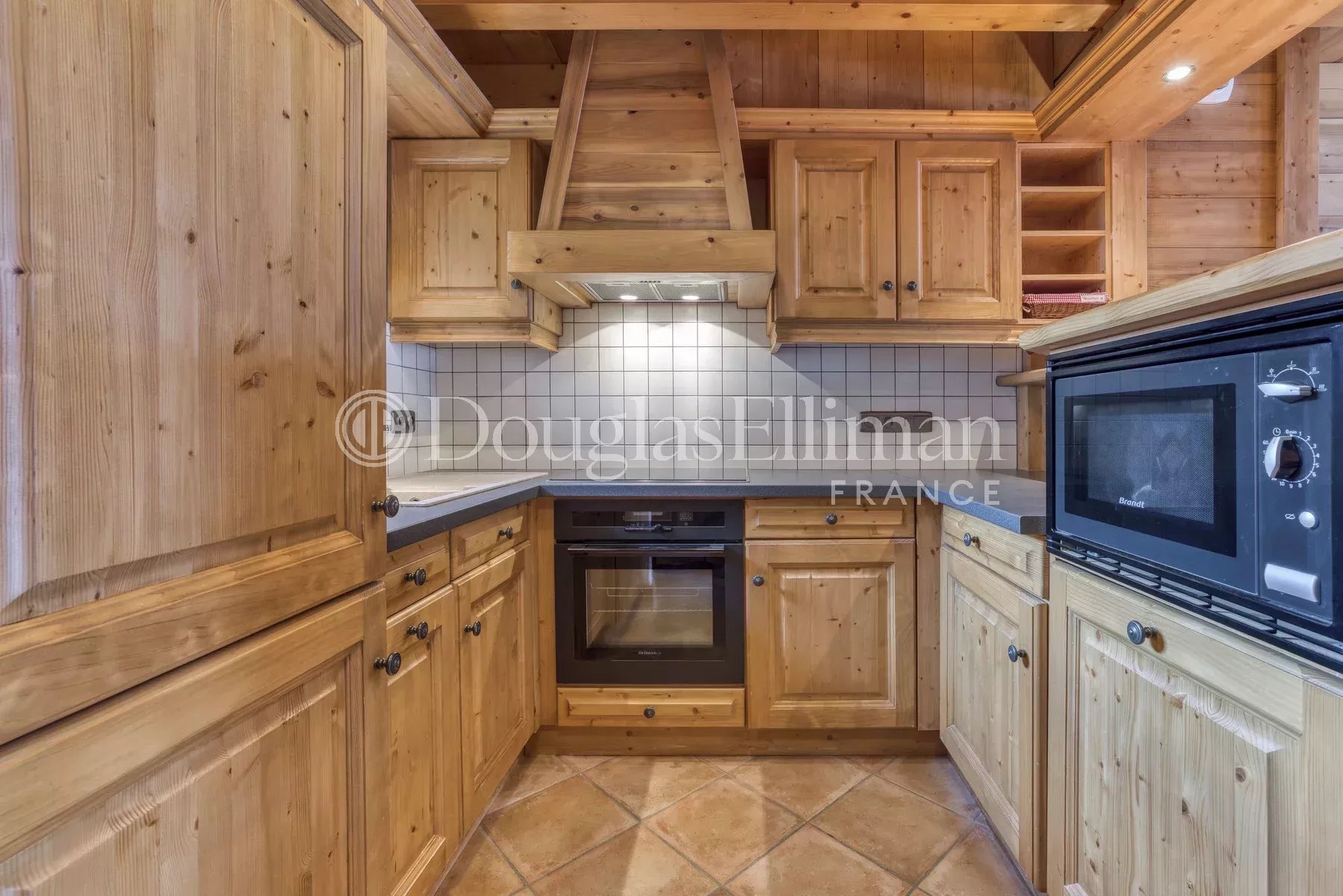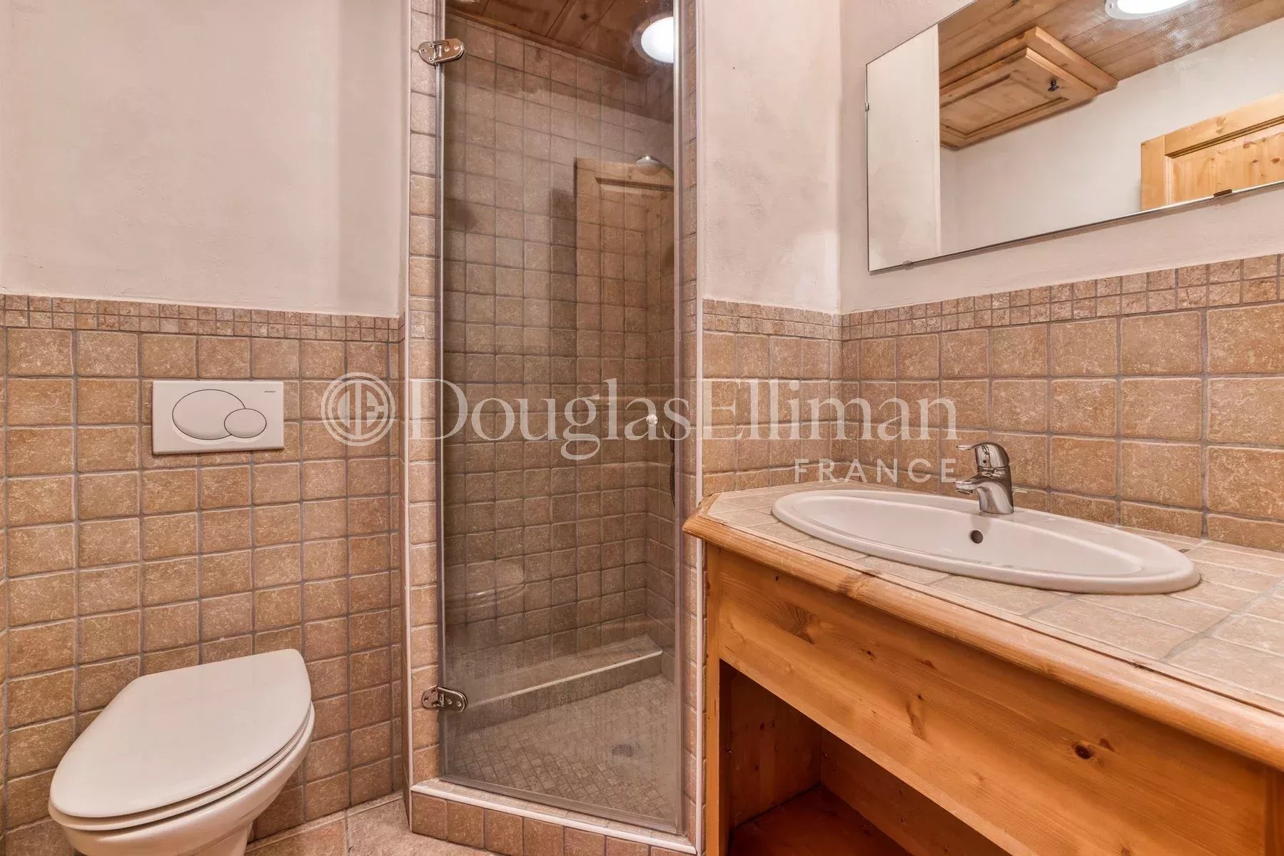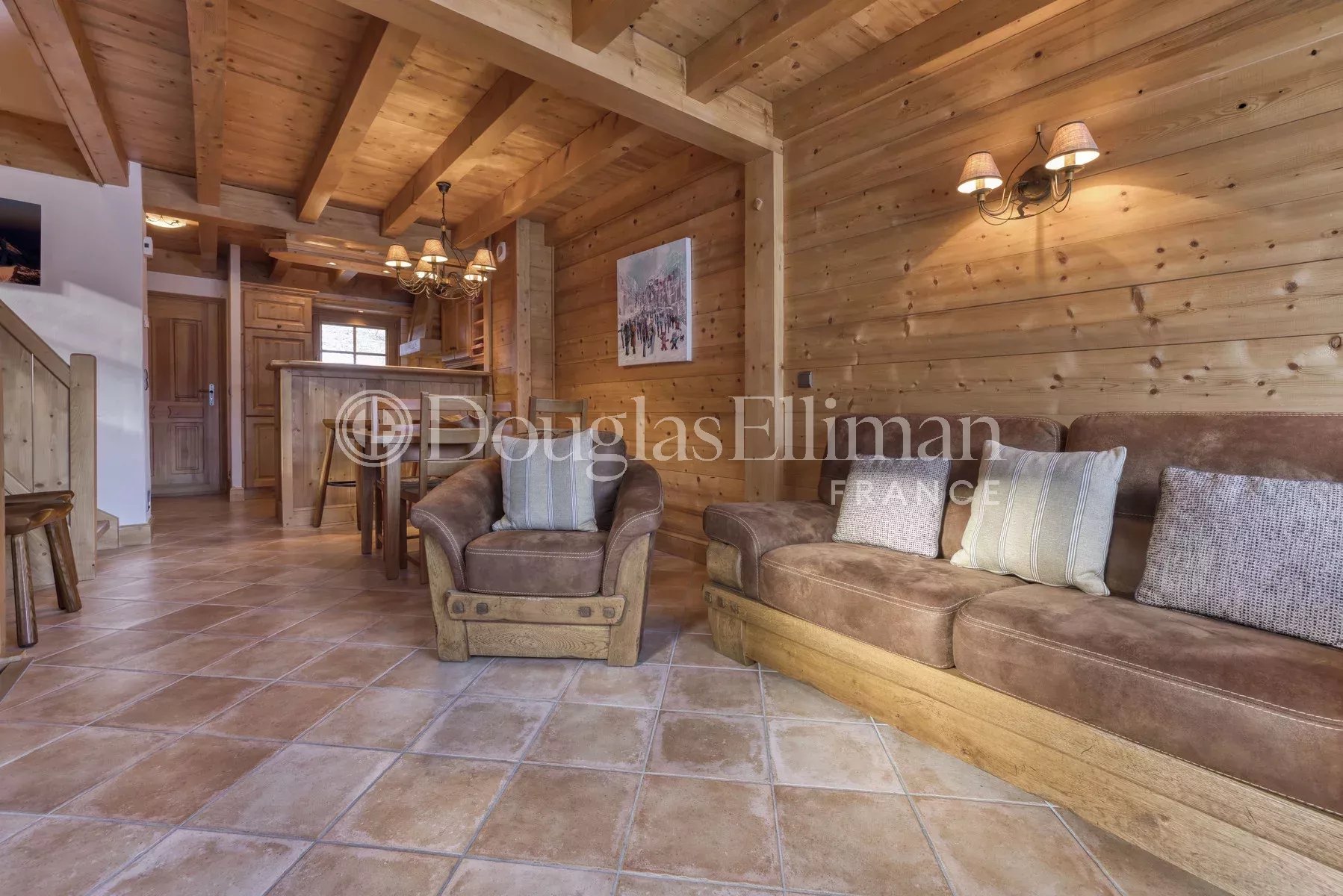 L'appartement est réparti sur trois niveaux. Le rez-de-chaussée comprend un garage privé, une buanderie et un local à skis. Le premier étage comprend une cuisine ouverte, une salle à manger et un salon donnant sur une terrasse avec une vue imprenable sur le massif du Mont-Blanc. Le deuxième étage offre deux chambres avec salle de bains privative, chacune dotée d'un balcon bien proportionné.