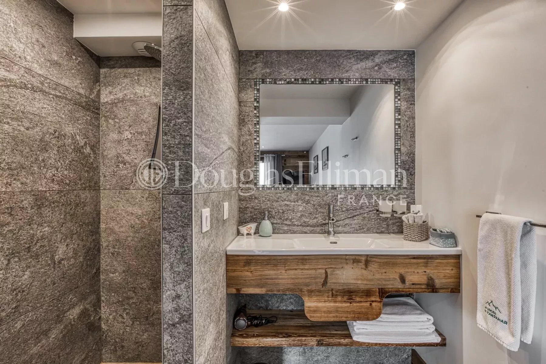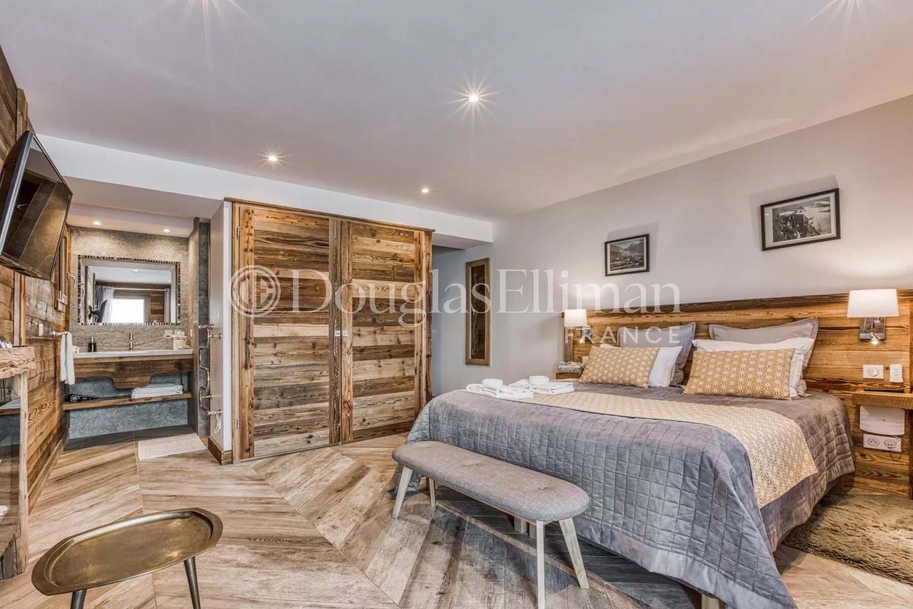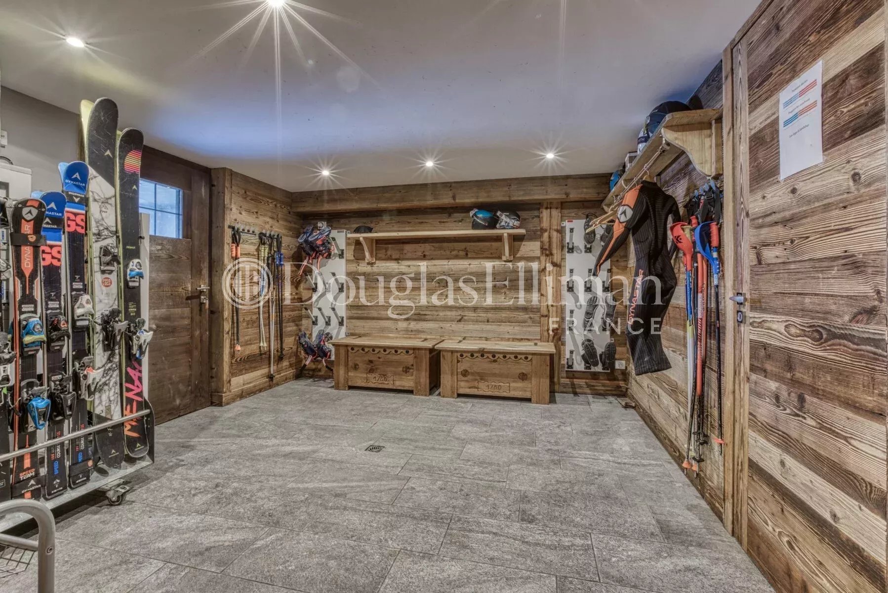 L'étage supérieur comprend deux chambres d'enfants avec une salle de jeux communicante, une autre chambre et une salle de bains familiale. Le chalet dispose d'un jardin privé à l'abri de la piste et d'un garage séparé.