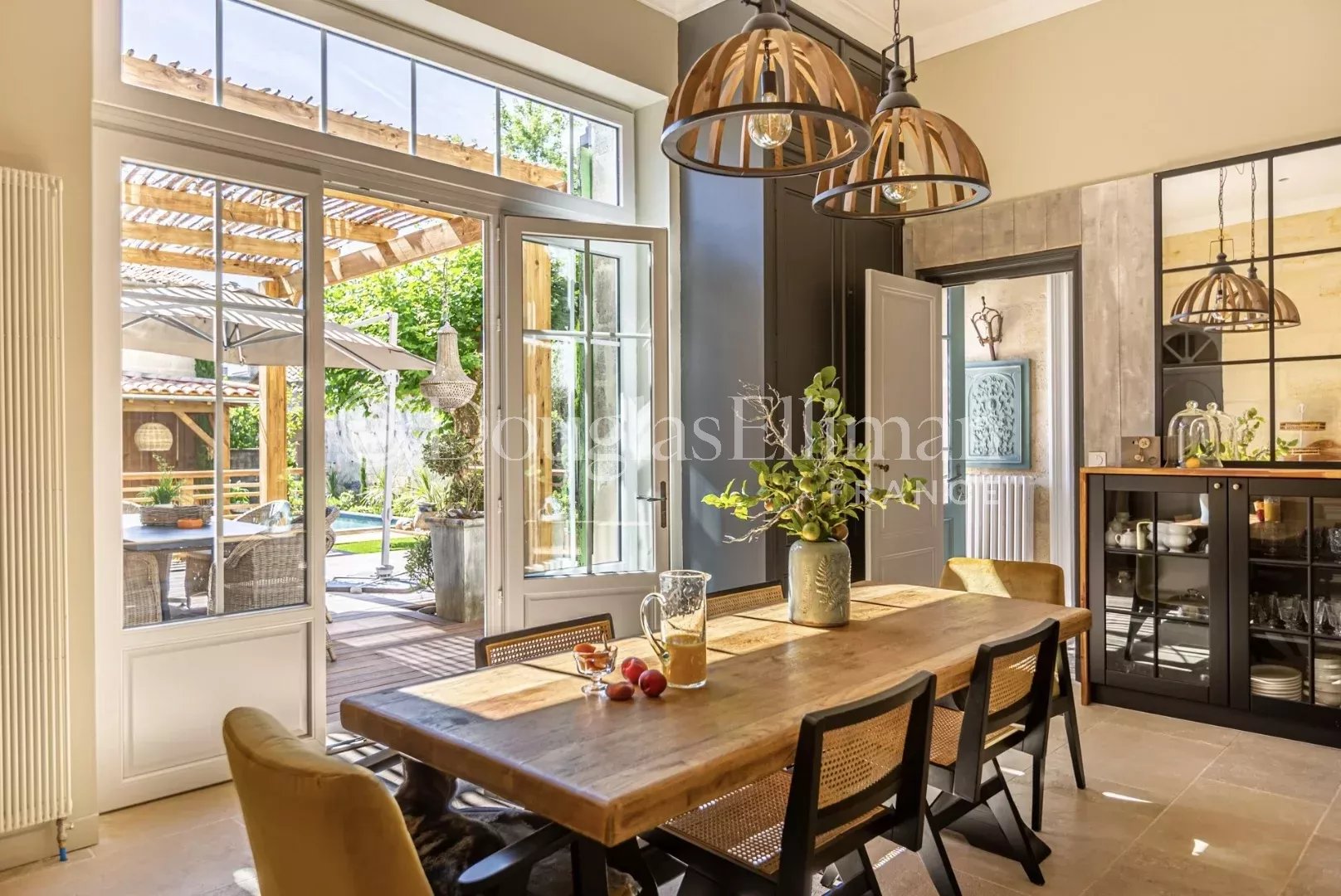 Dès l’entrée, cette maison d'environ 650 m² révèle une atmosphère spacieuse, où les matériaux nobles se mêlent à une décoration de caractère. Le salon, s’ouvre sur une véranda baignée de lumière, offrant un espace chaleureux en toute saison. La cuisine, entièrement équipée et pensée pour les amateurs de gastronomie, allie fonctionnalité et confort moderne, parfaite pour préparer des repas à partager entre amis ou avec vos hôtes. Prolongez ces moments sur la terrasse ombragée, face à un jardin paisible.