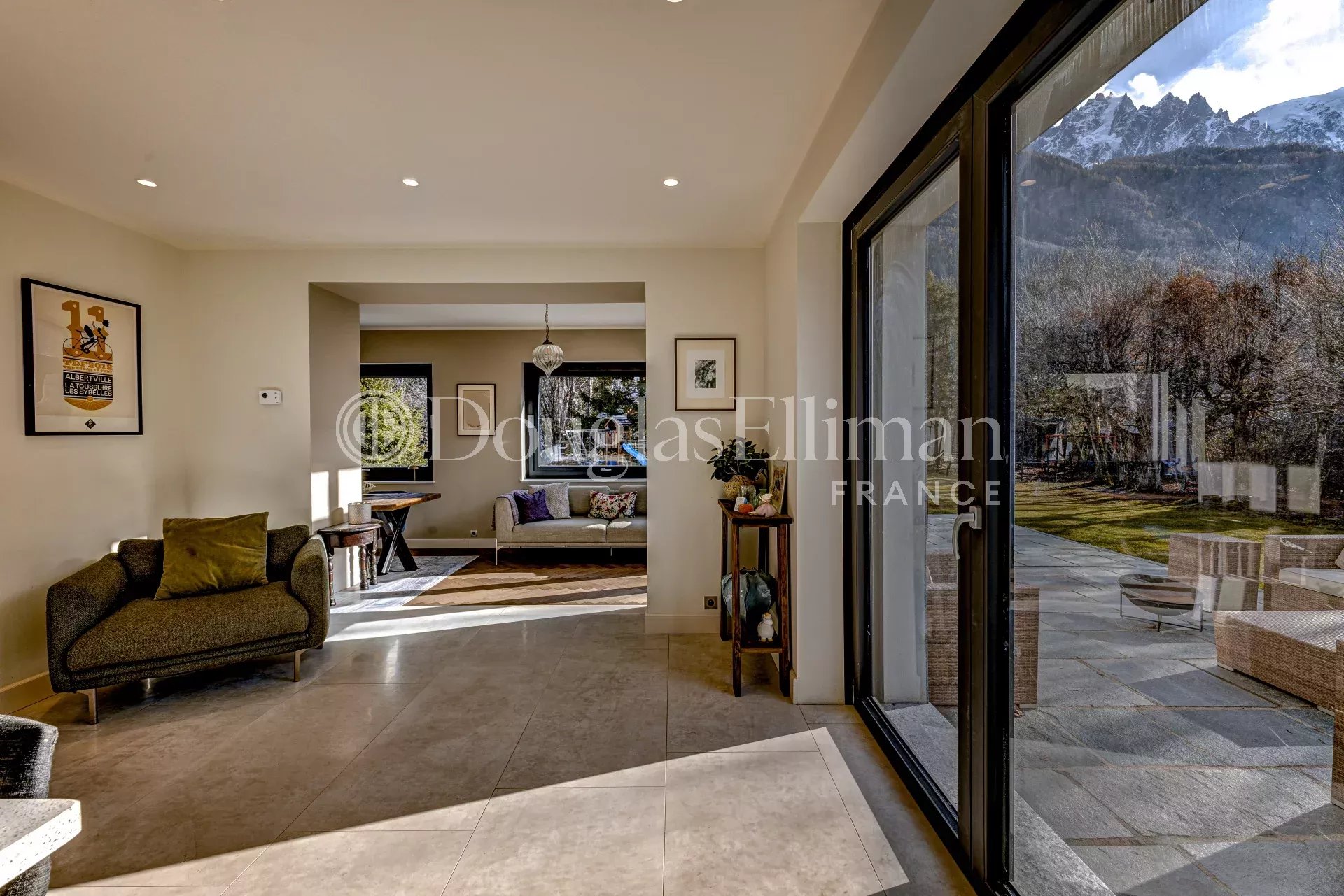 - Grand jardin plat exposé sud-ouest avec des vues fantastiques sur le Mont-Blanc, les Drus et les autres sommets environnants