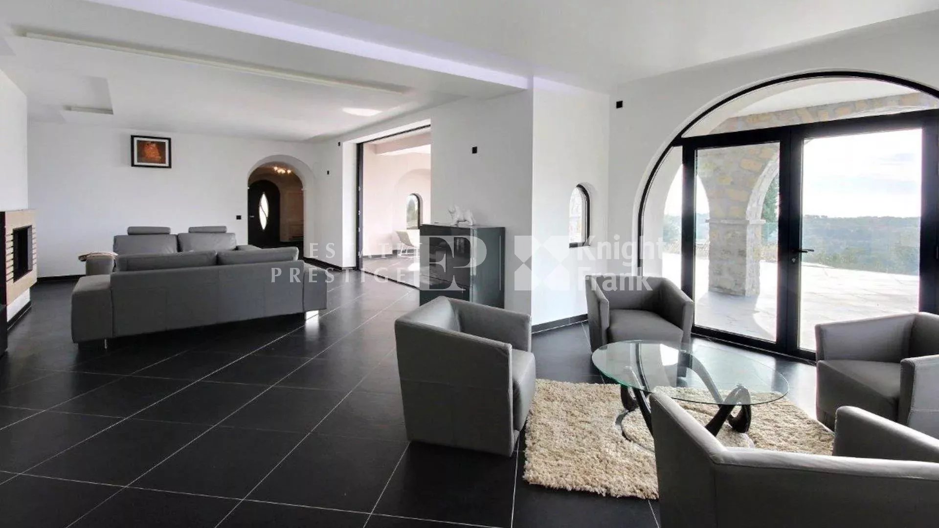 Idéalement située à quelques pas du charmant vieux village de Mougins, cette villa en pierre bénéficie d’un cadre exceptionnel avec une vue panoramique s’étendant jusqu’à la mer.